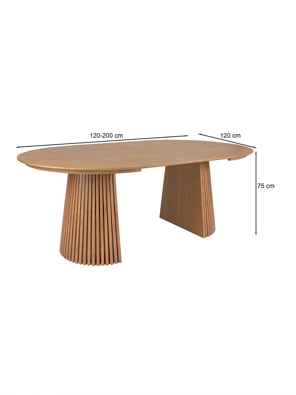 Galimi išoriniai baldo matmenys su prailginimo plokštėm CM: ilgis / plotis / aukštis: 200 / 120 / 75.