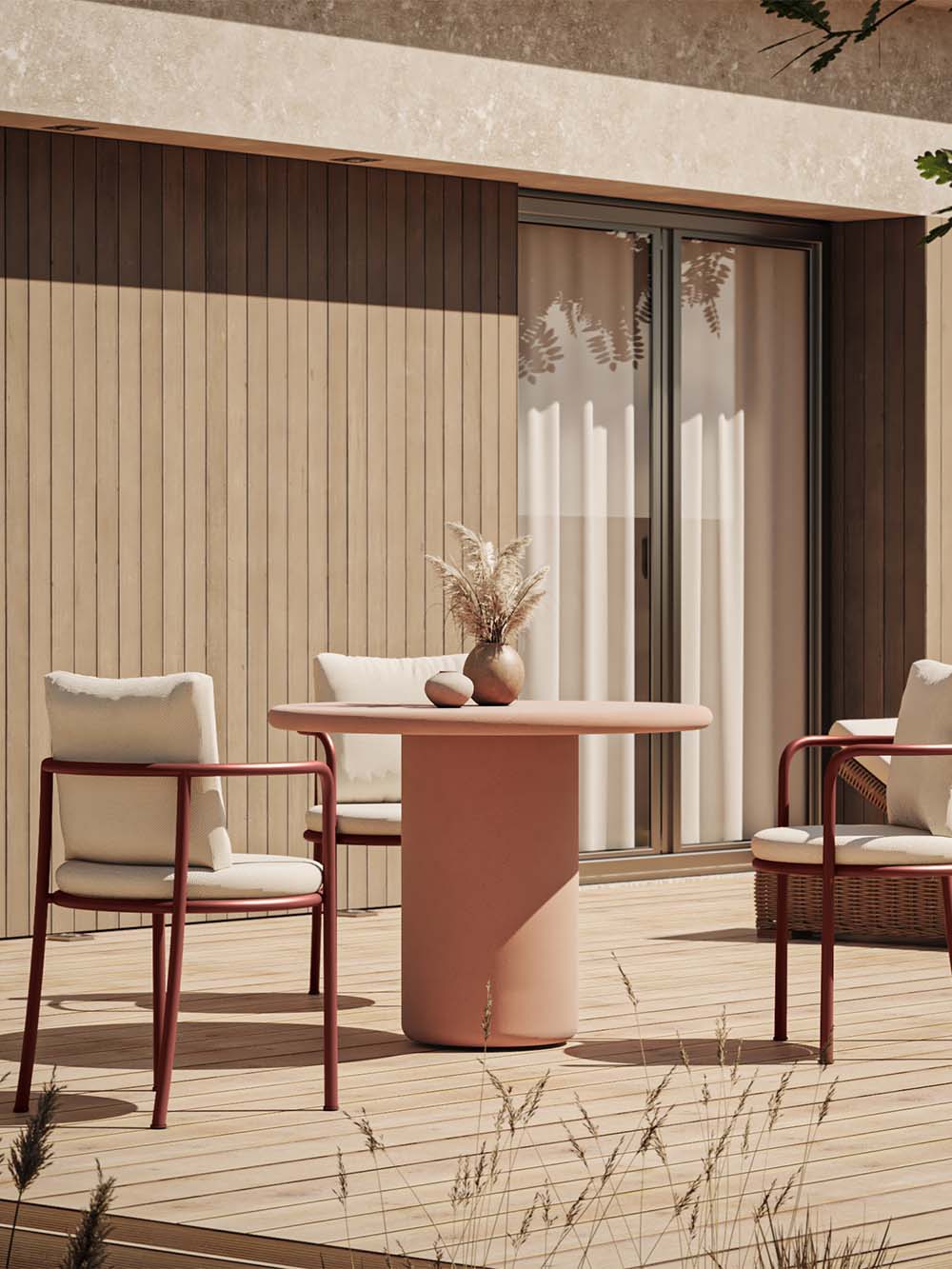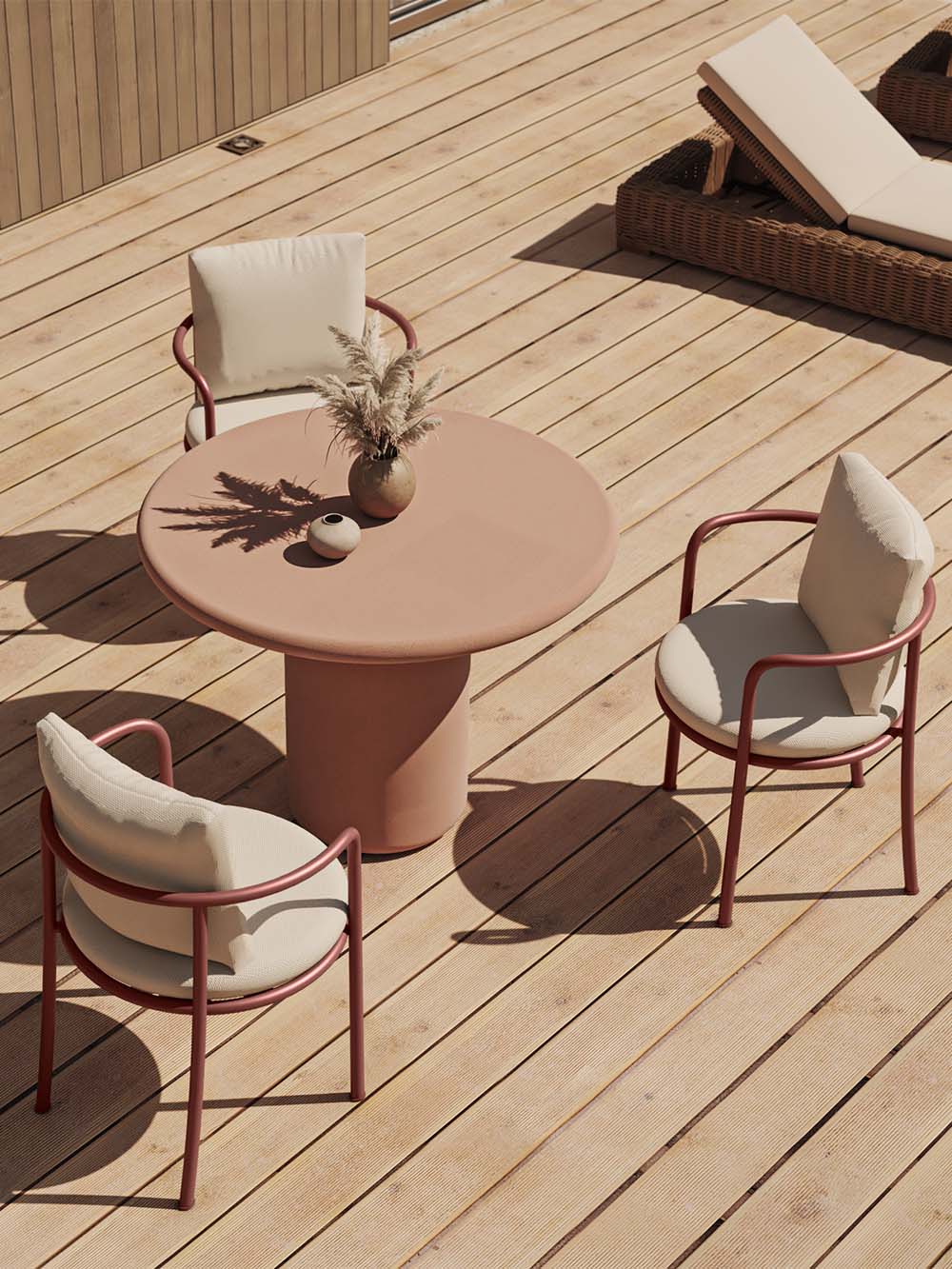Apvalus lauko stalas Vibo – išskirtinis pasirinkimas ieškantiems ryškaus, charakteringo akcento savo lauko erdvei. Šiltos terakotos spalvos, matinis akmens efekto paviršius su subtilia taškuota tekstūra kuria estetišką ir akį traukiančią atmosferą. Iš MgO (magnio oksido) plokštės pagaminta konstrukcija užtikrina tvirtumą ir atsparumą lauko sąlygoms, o apvalus stalviršis ir stabilus pagrindas leidžia patogiai mėgautis poilsiu bei jaukiais susibūrimais lauke.