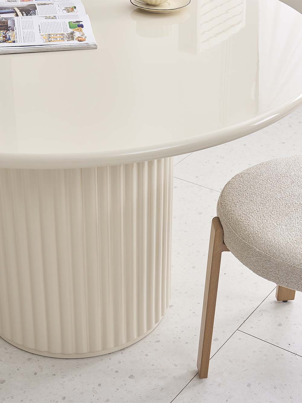 Priežiūra: Blizgūs paviršiai reikalauja švelnios priežiūros, nes yra jautresni įbrėžimams ir pažeidimams. Siekiant išvengti įbrėžimų, rekomenduojama naudoti padėkliukus ar apsauginius kilimėlius po statomais daiktais. Valykite minkšta, drėgna mikropluošto šluoste, venkite šiurkščių medžiagų ir stiprių cheminių priemonių. Laikykite baldą atokiau nuo tiesioginių saulės spindulių. Jei reikia, naudokite švelnius priežiūros preparatus, skirtus lakiniams arba aukšto blizgesio paviršiams (be vaško priedų).