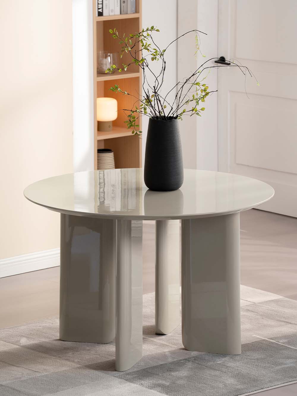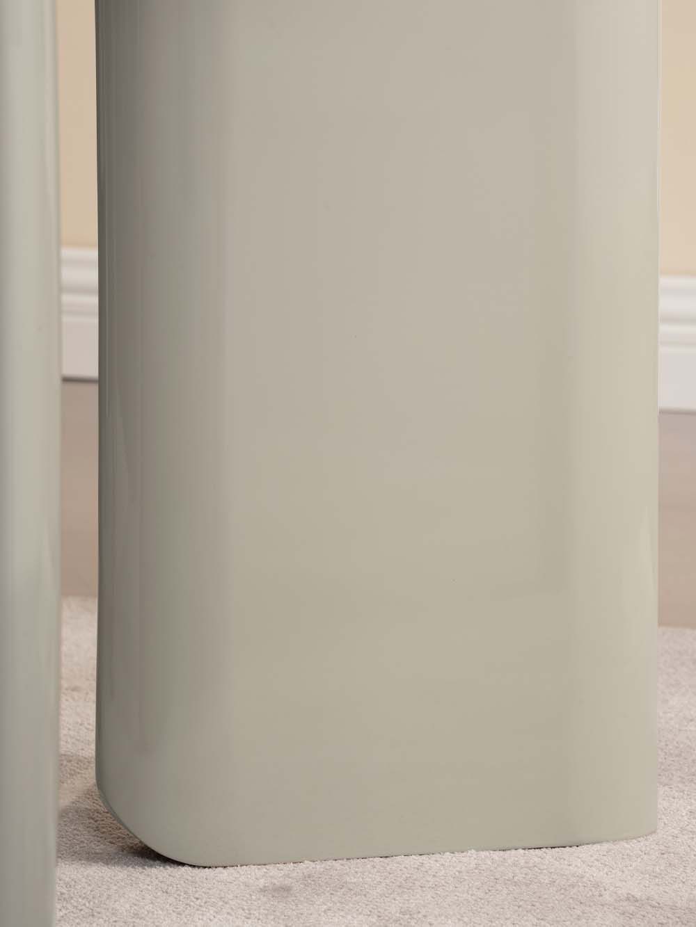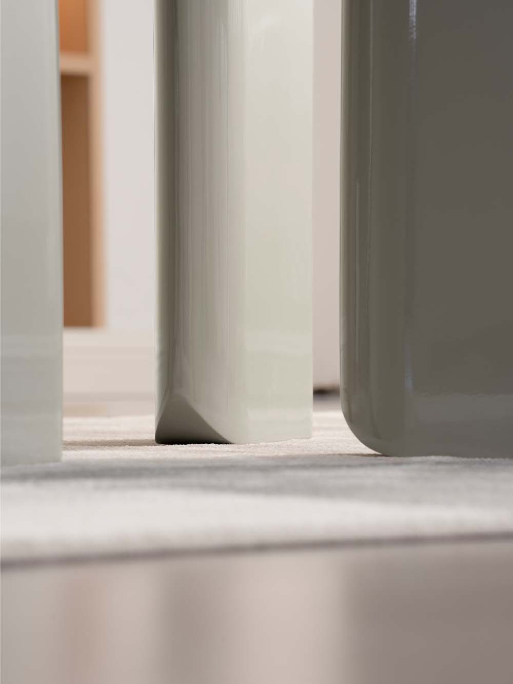 Priežiūra: Blizgūs paviršiai reikalauja švelnios priežiūros, nes yra jautresni įbrėžimams ir pažeidimams. Siekiant išvengti įbrėžimų, rekomenduojama naudoti padėkliukus ar apsauginius kilimėlius po statomais daiktais. Valykite minkšta, drėgna mikropluošto šluoste, venkite šiurkščių medžiagų ir stiprių cheminių priemonių. Laikykite baldą atokiau nuo tiesioginių saulės spindulių. Jei reikia, naudokite švelnius priežiūros preparatus, skirtus lakiniams arba aukšto blizgesio paviršiams (be vaško priedų).
