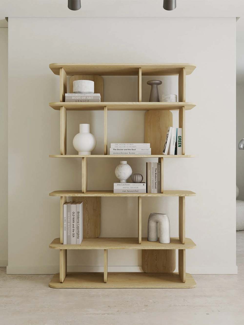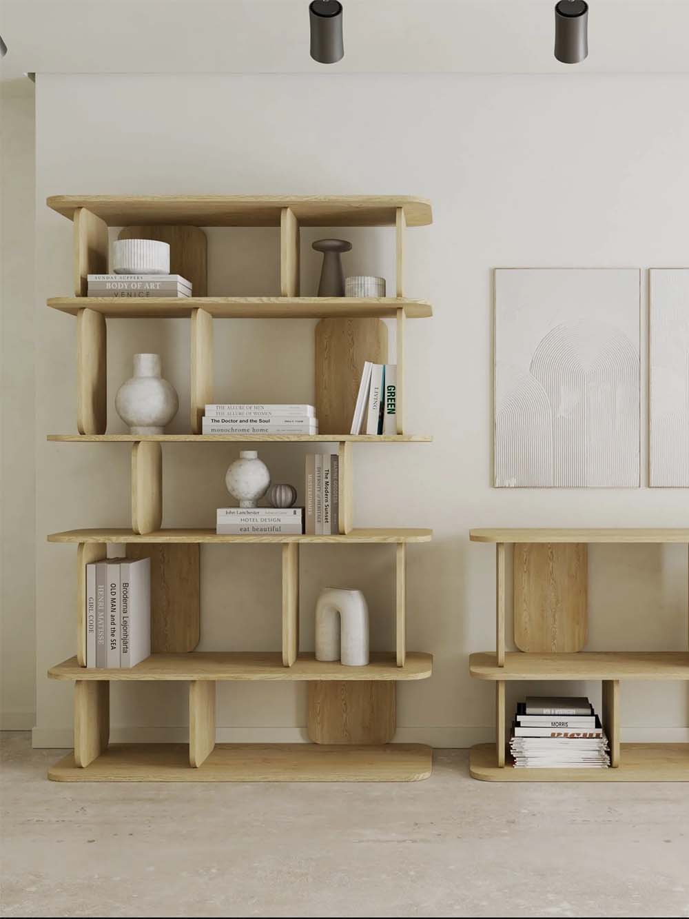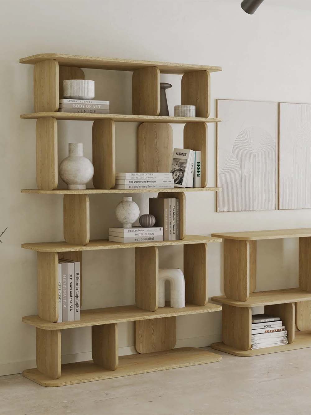 Aukšta lentyna Haru – minimalistinio dizaino baldas, išsiskiriantis švariomis geometrinėmis formomis ir švelniai užapvalintais kraštais. Ąžuolo atspalvis suteikia natūralumo ir šilumos pojūtį, o aukšta konstrukcija su keliais lentynų lygiais leidžia patogiai išdėstyti knygas, dekoracijas ar kasdienius daiktus. Subalansuotas dizainas užtikrina stabilumą ir estetišką erdvės vaizdą.