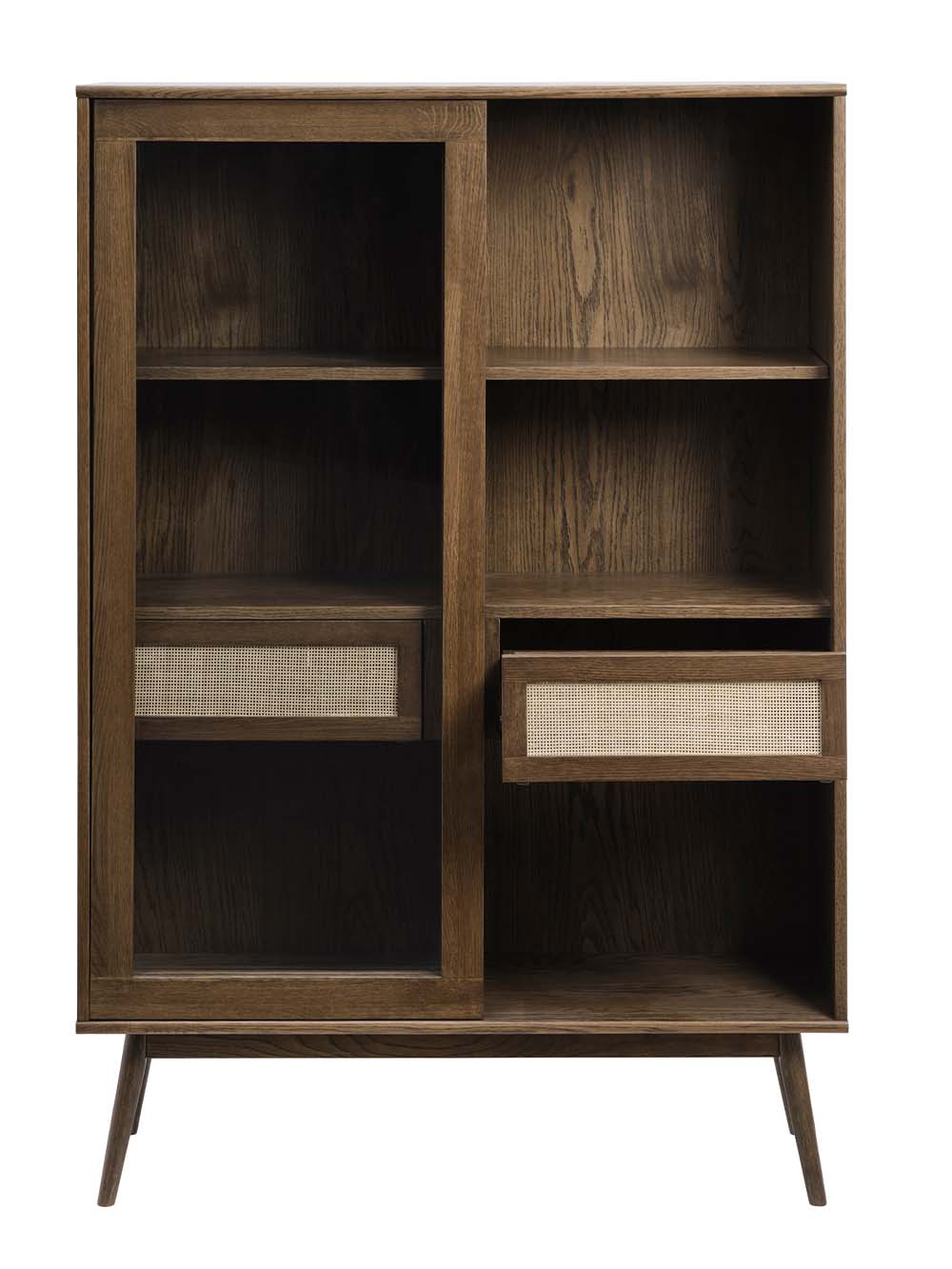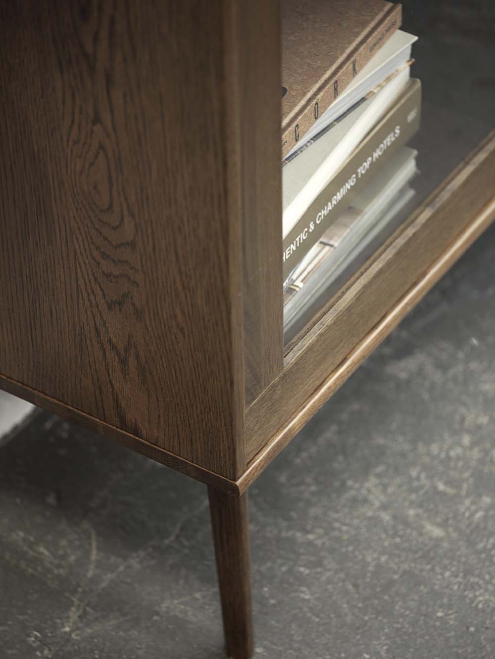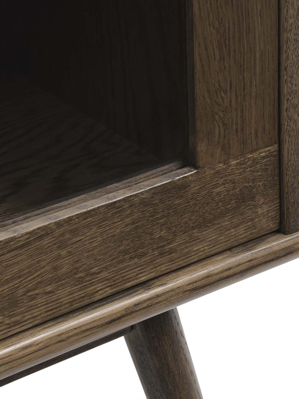 Korpuso medžiaga: ąžuolo masyvas, natūraliu ąžuolo lukštu faneruota MDF plokštė, stiklas.
