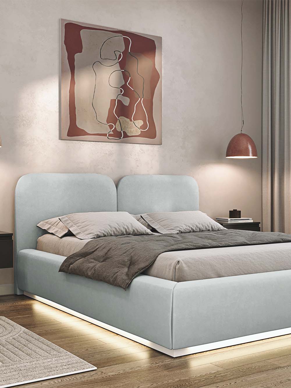 Bendri lovos matmenys 160 cm pločio čiužiniui: plotis x ilgis x aukštis: 185 x 220 x 100.