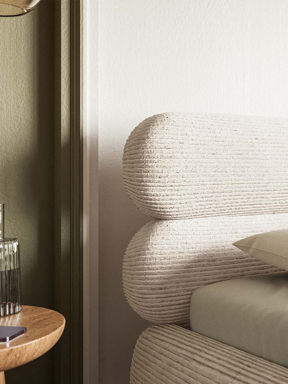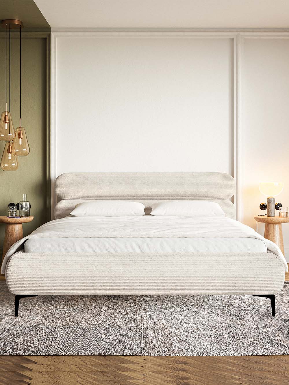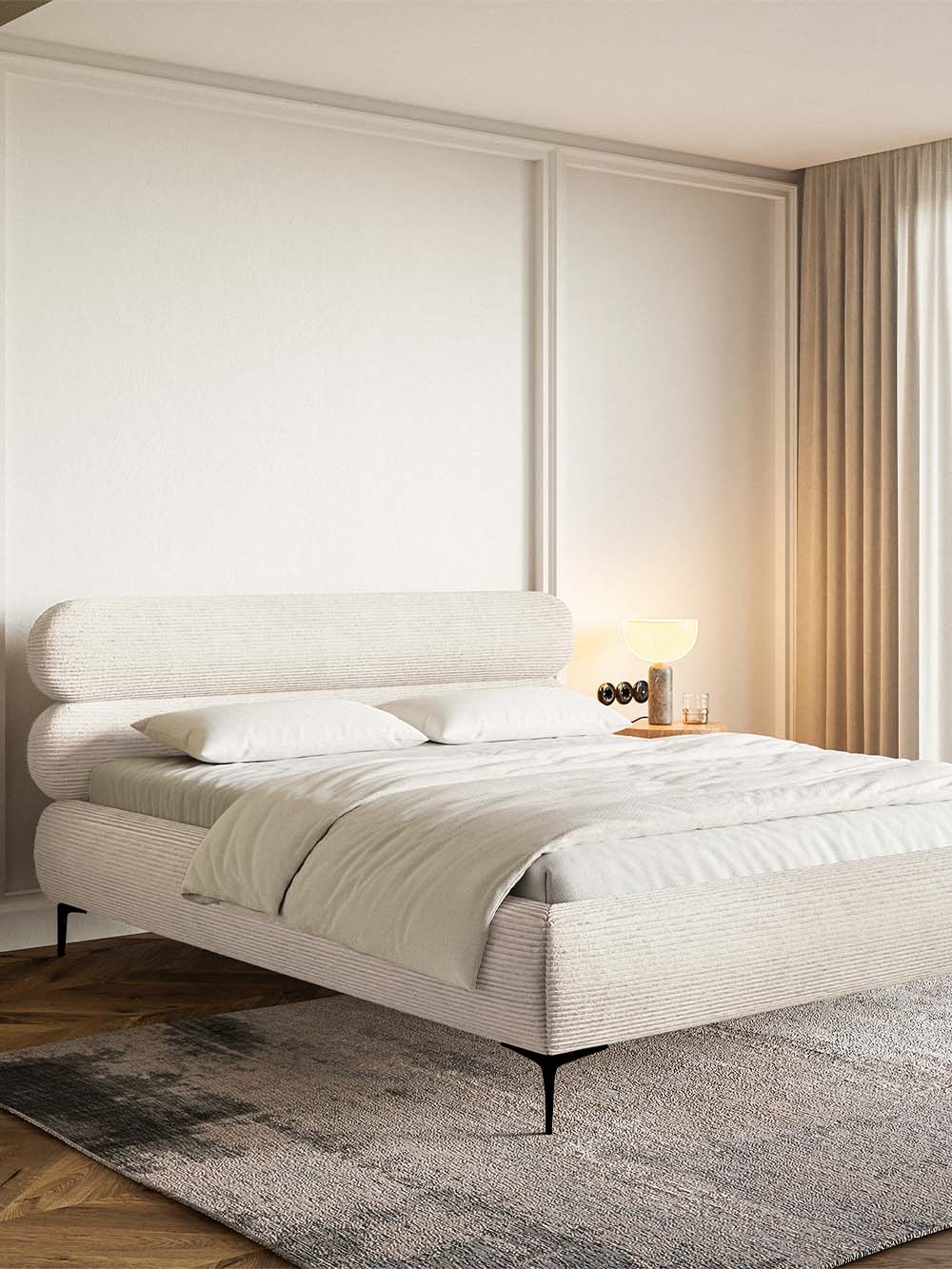 Dvigulė lova Mesa – tai modernaus dizaino baldas, išsiskiriantis elegantišku galvūgaliu, sudarytu iš dviejų horizontalių ovalių formų, suteikiančių interjerui išskirtinumo. Minkštas velvetinis audinys kuria jaukų ir estetiškai harmoningą įvaizdį, o aukštos lovos kojelės suteikia bendram siluetui lengvumo ir elegancijos. Tvirta konstrukcija, paremta metaliniu rėmu, užtikrina stabilumą ir ilgaamžiškumą, o integruota patalynės dėžė leidžia praktiškai išnaudoti miegamojo erdvę ir palaikyti tvarką.