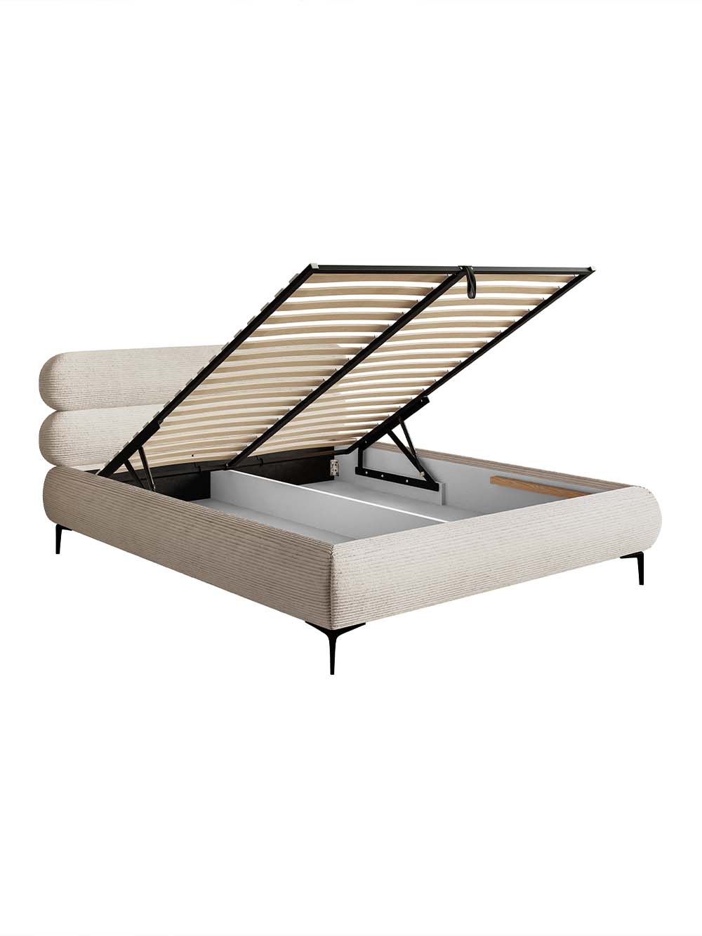 Patalynės dėžė: yra. Atidaroma iš priekio. Yra dvi talpos perskirtos vertikalia pertvara. Pakėlimo mechanizmo tipas - dujinis.
