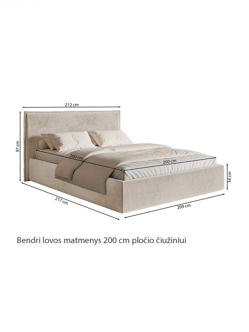 Bendri lovos matmenys 200 cm pločio čiužiniui: plotis x ilgis x aukštis: 212 x 217 x97 cm.