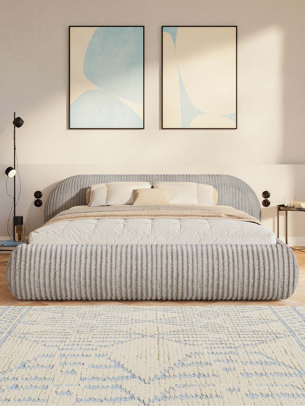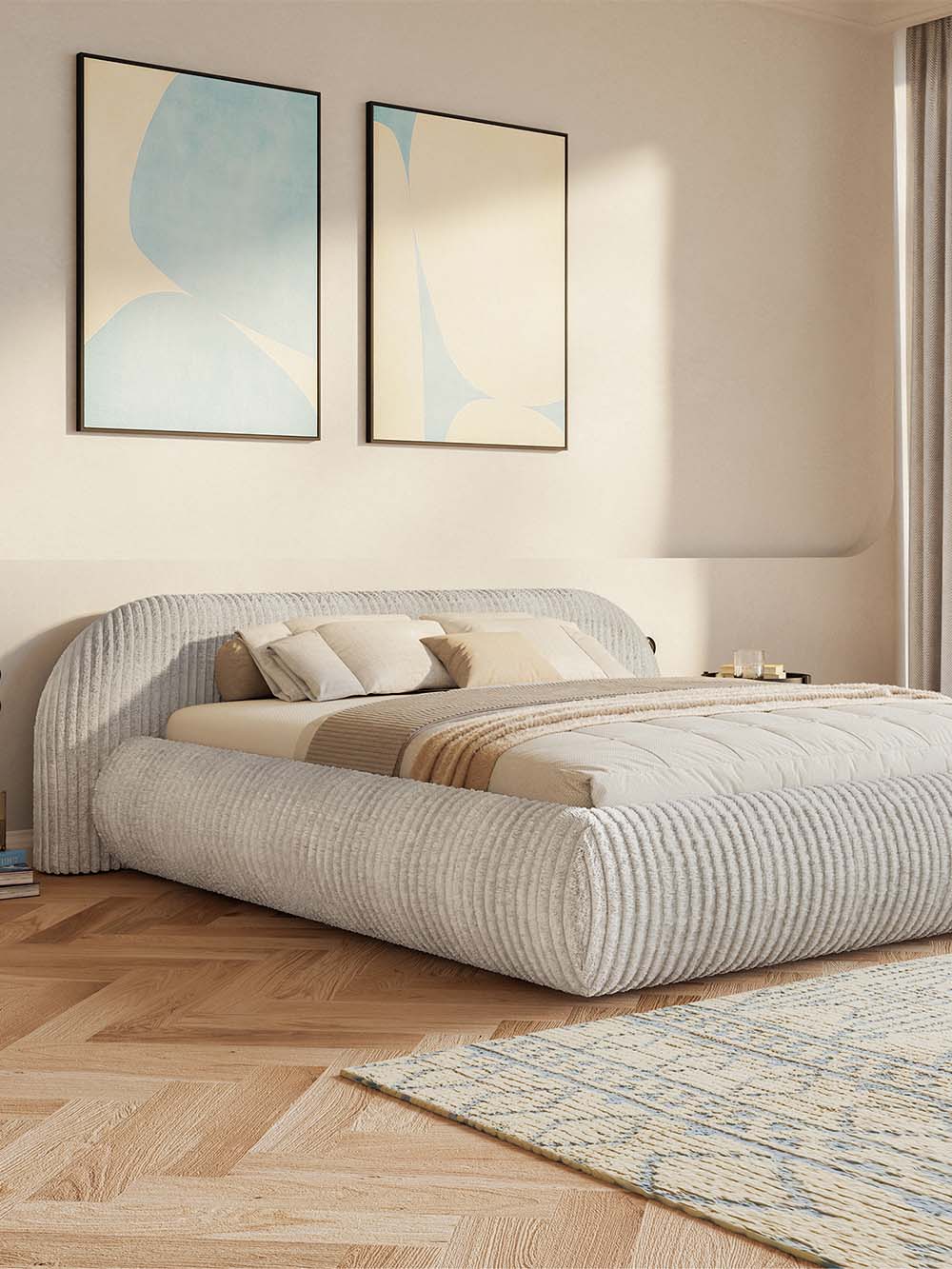 Dvigulė lova Numa – modernios estetikos baldas su minkštomis linijomis ir minimalistine forma, lengvai derantis prie šiuolaikinių interjerų. Minkštas velvetinis audinys, malonus liesti, suteikia lovai jaukumo ir subtilios prabangos pojūtį. Žemesnis galvūgalis išlaiko estetinę pusiausvyrą ir patogumą, o tvirta konstrukcija su metaliniu rėmu užtikrina stabilumą. Integruota patalynės dėžė su dujiniu pakėlimo mechanizmu leidžia praktiškai išnaudoti miegamojo erdvę.