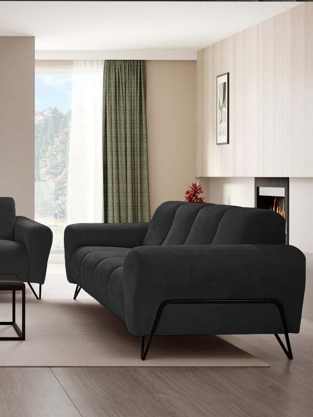 Dvivietė sofa Velore – modernios estetikos baldas su minkštomis, apvalintomis formomis ir subtiliai išraiškingu siluetu. Grafito spalvos šenilinis audinys interjerui suteikia solidumo ir išskirtinio akcento, o juodos spalvos metalinis kojų rėmas pabrėžia šiuolaikišką charakterį. Platus atlošas ir erdvi sėdimoji dalis užtikrina išskirtinį komfortą – puikiai tinka kasdieniam poilsiui, jaukiems vakarams ar ramioms akimirkoms namuose.