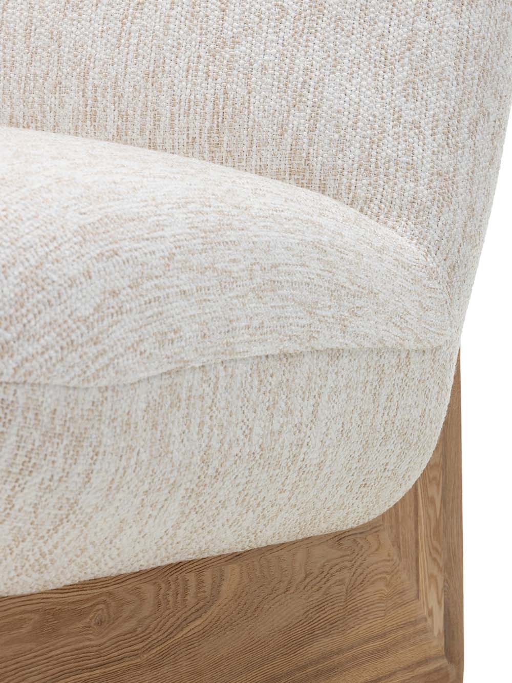 Sėdimoji dalis užpildyta kokybišku putų poliuretanu, todėl užtikrina ypatingą komfortą bei patogų poilsį po ilgos dienos. Natūralaus uosio medienos kojelių rėmas suteikia baldui tvirtumo ir ilgaamžiškumo, kartu pabrėždamas natūralios medienos kuriamą jaukumą.
