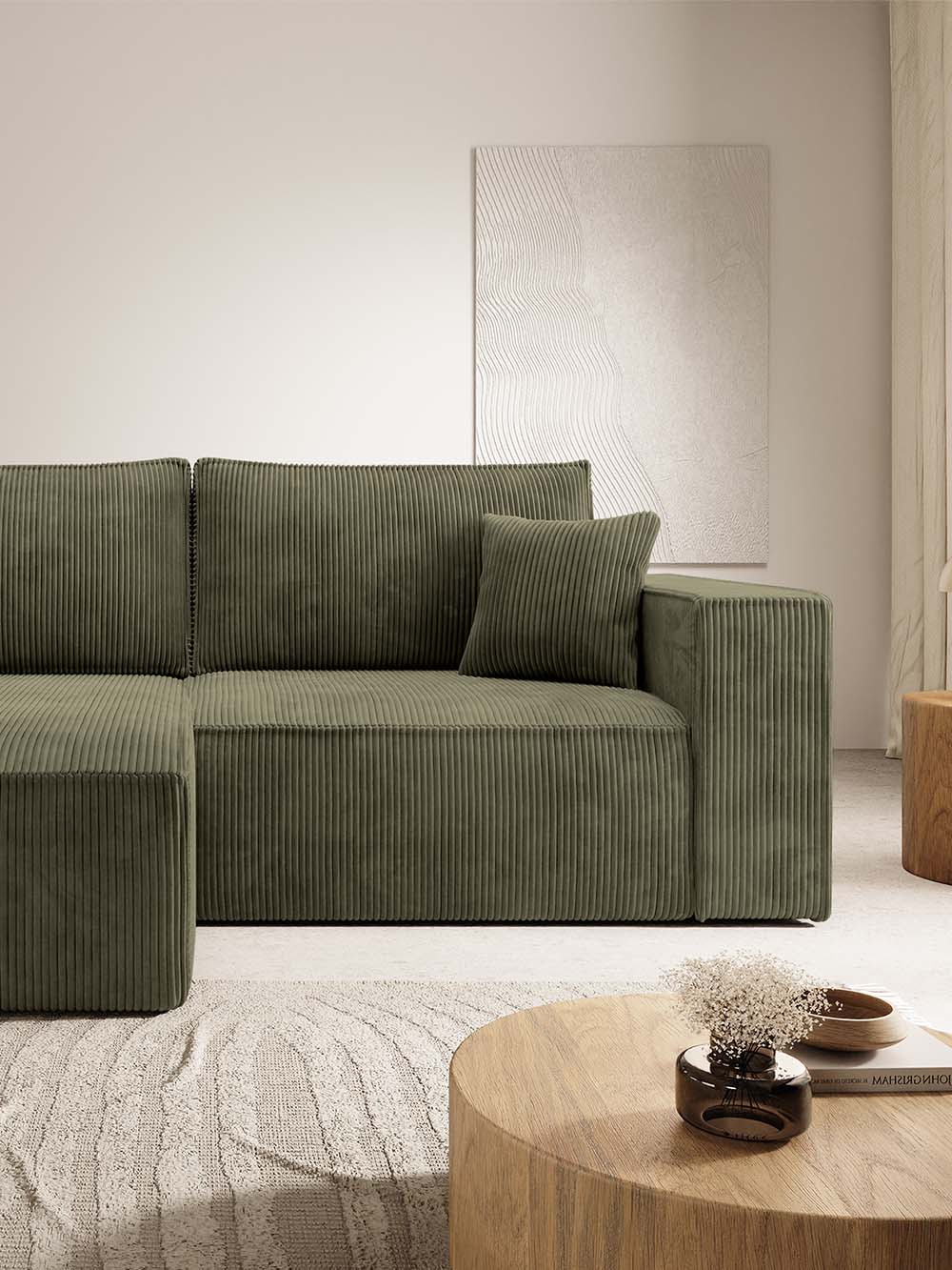 Apie audinį: Poso – tai velveto tipo audinys su stambia briaunota tekstūra, suteikiančia baldui išraiškingumo ir jaukumo. Minkštas, malonus liesti paviršius kuria komforto pojūtį, o tanki struktūra užtikrina tvirtumą. Audinys atsparus trinčiai, todėl puikiai tinka kasdieniam naudojimui. Geras atsparumas šviesai padeda ilgiau išlaikyti spalvos intensyvumą ir estetinę išvaizdą.