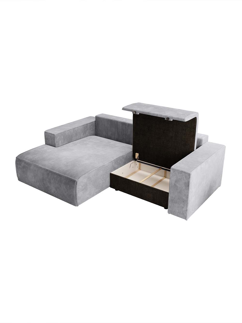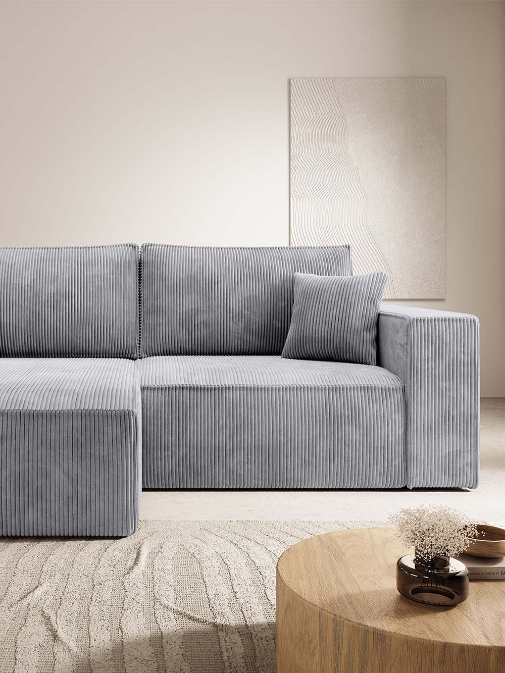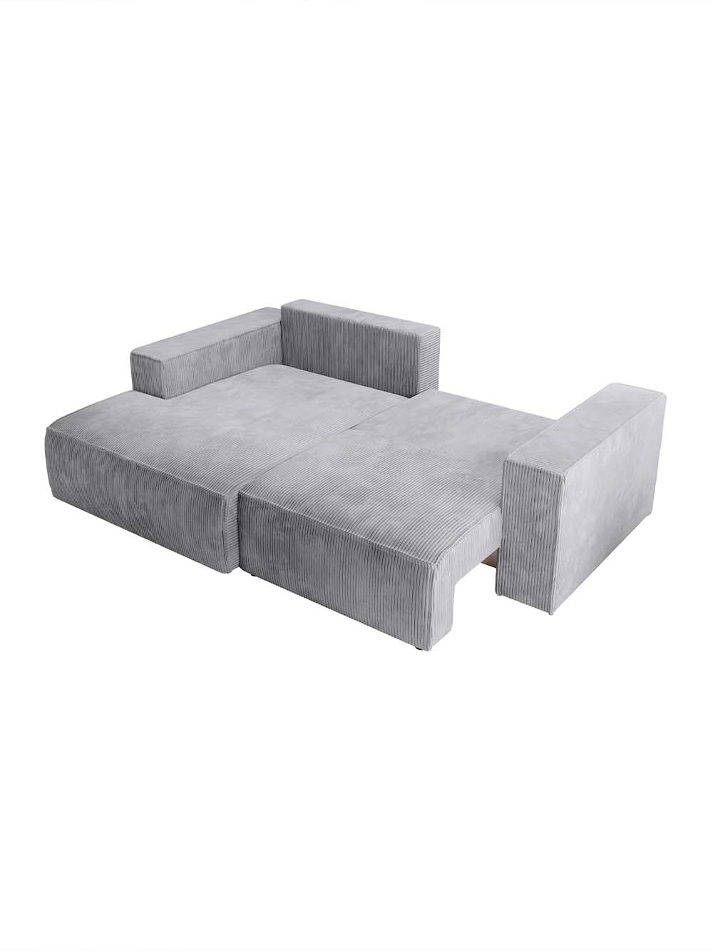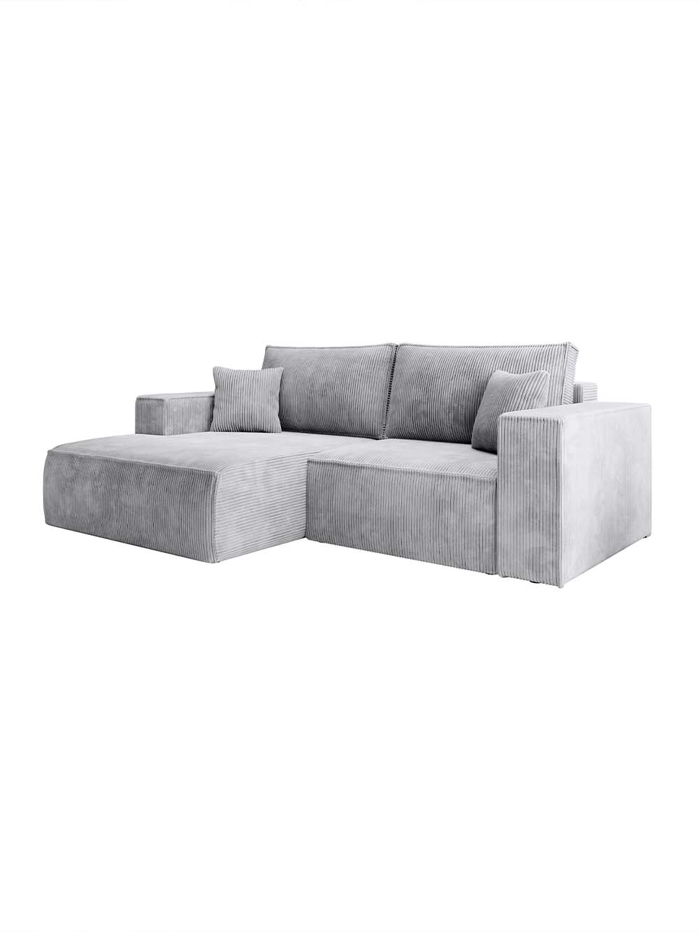 Kampinė sofa Amigo-mini – modernių, aiškių formų baldas, išsiskiriantis subtiliu minimalizmu ir išraiškingu siluetu. Šviesiai pilkos spalvos velvetas su reljefine tekstūra suteikia lengvumo ir subtilios elegancijos. Tvirta konstrukcija garantuoja stabilumą bei patikimą kasdienį naudojimą. Platus atlošas ir minkšta, gili sėdimoji dalis leidžia mėgautis komfortišku poilsiu kiekvieną dieną.