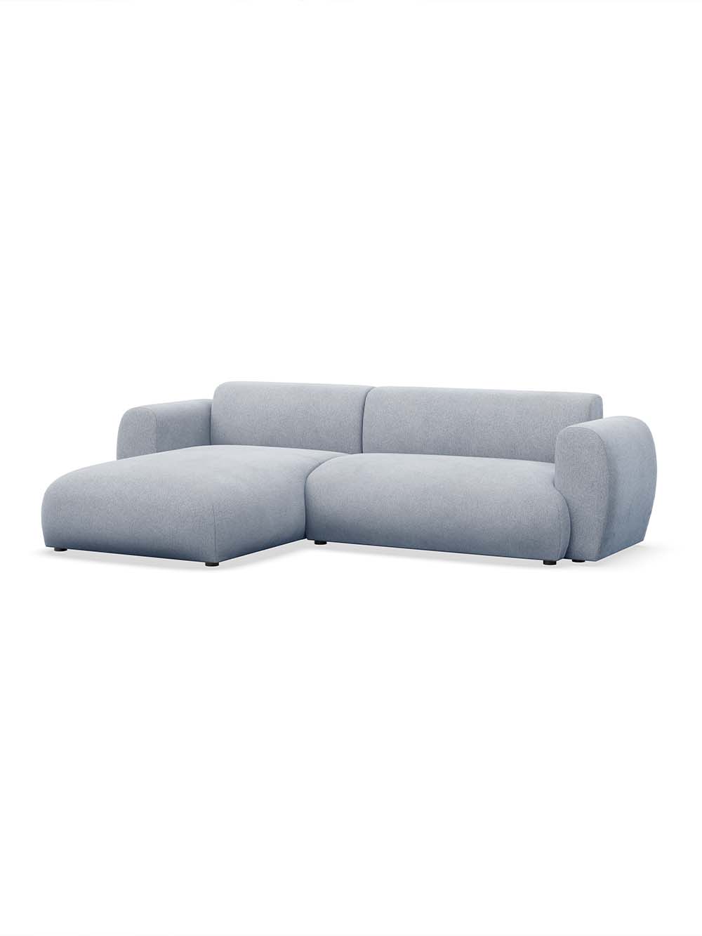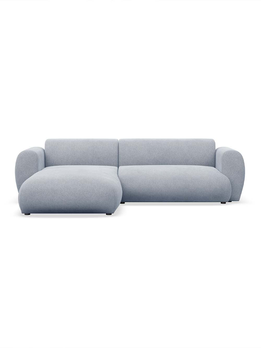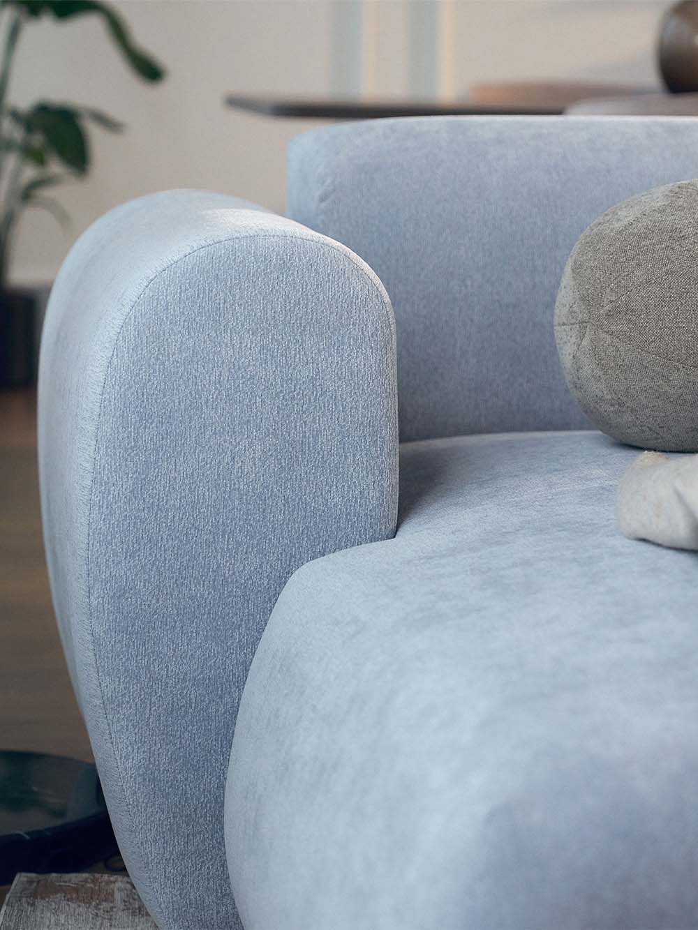 Kampinė sofa Emba – modernaus dizaino baldas su minkštomis, apvaliomis formomis ir išraiškingu siluetu. Švelnios mėlynos spalvos šenilinis audinys suteikia interjerui gaivumo ir lengvumo. Erdvi sėdimoji dalis užtikrina komfortą kasdieniam poilsiui, o „Puma“ išskleidimo mechanizmas leidžia lengvai suformuoti lygią ir patogią miegojimo vietą.