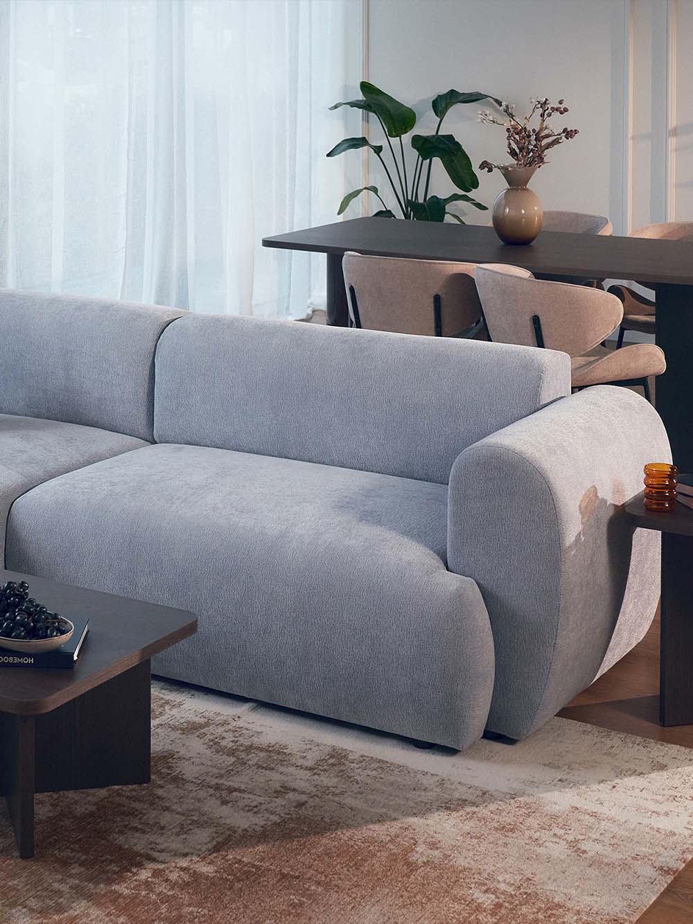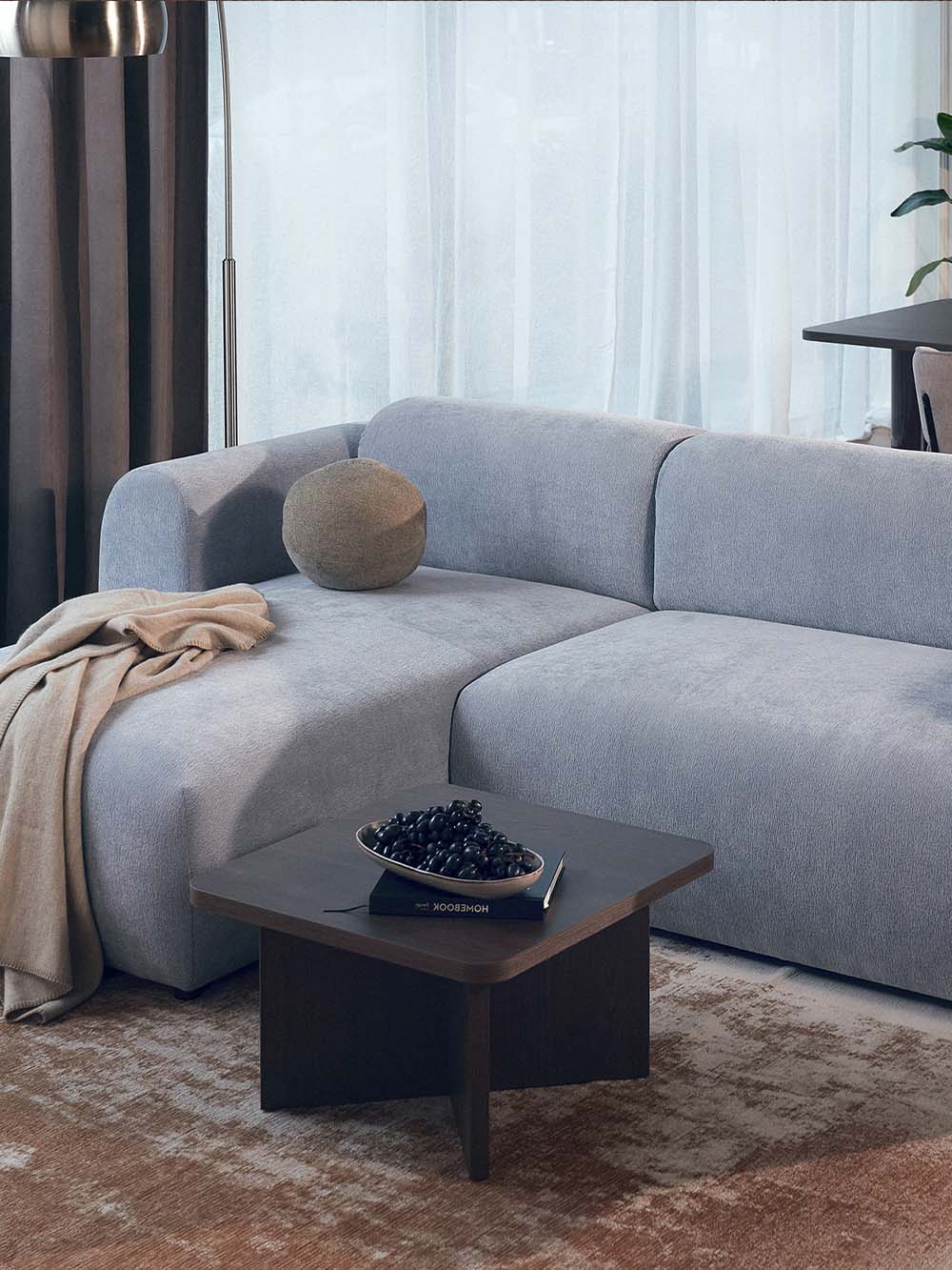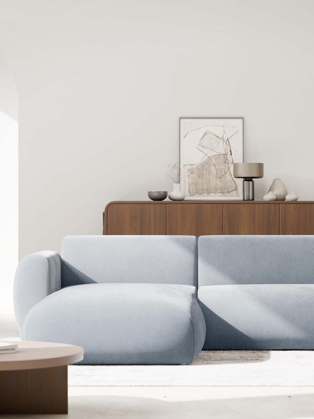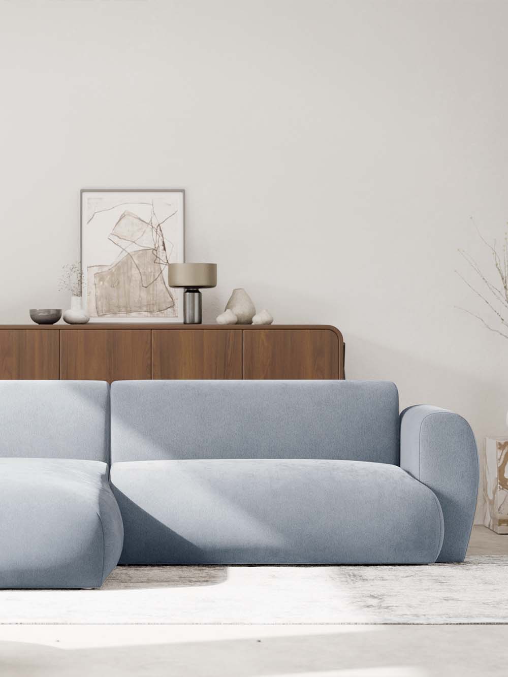 Kampinė sofa Emba – modernaus dizaino baldas su minkštomis, apvaliomis formomis ir išraiškingu siluetu. Švelnios mėlynos spalvos šenilinis audinys suteikia interjerui gaivumo ir lengvumo. Erdvi sėdimoji dalis užtikrina komfortą kasdieniam poilsiui, o „Puma“ išskleidimo mechanizmas leidžia lengvai suformuoti lygią ir patogią miegojimo vietą.