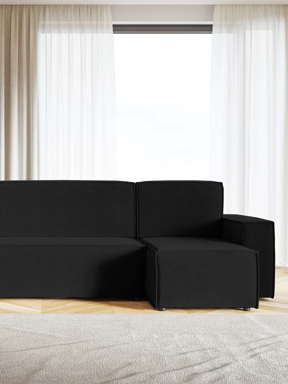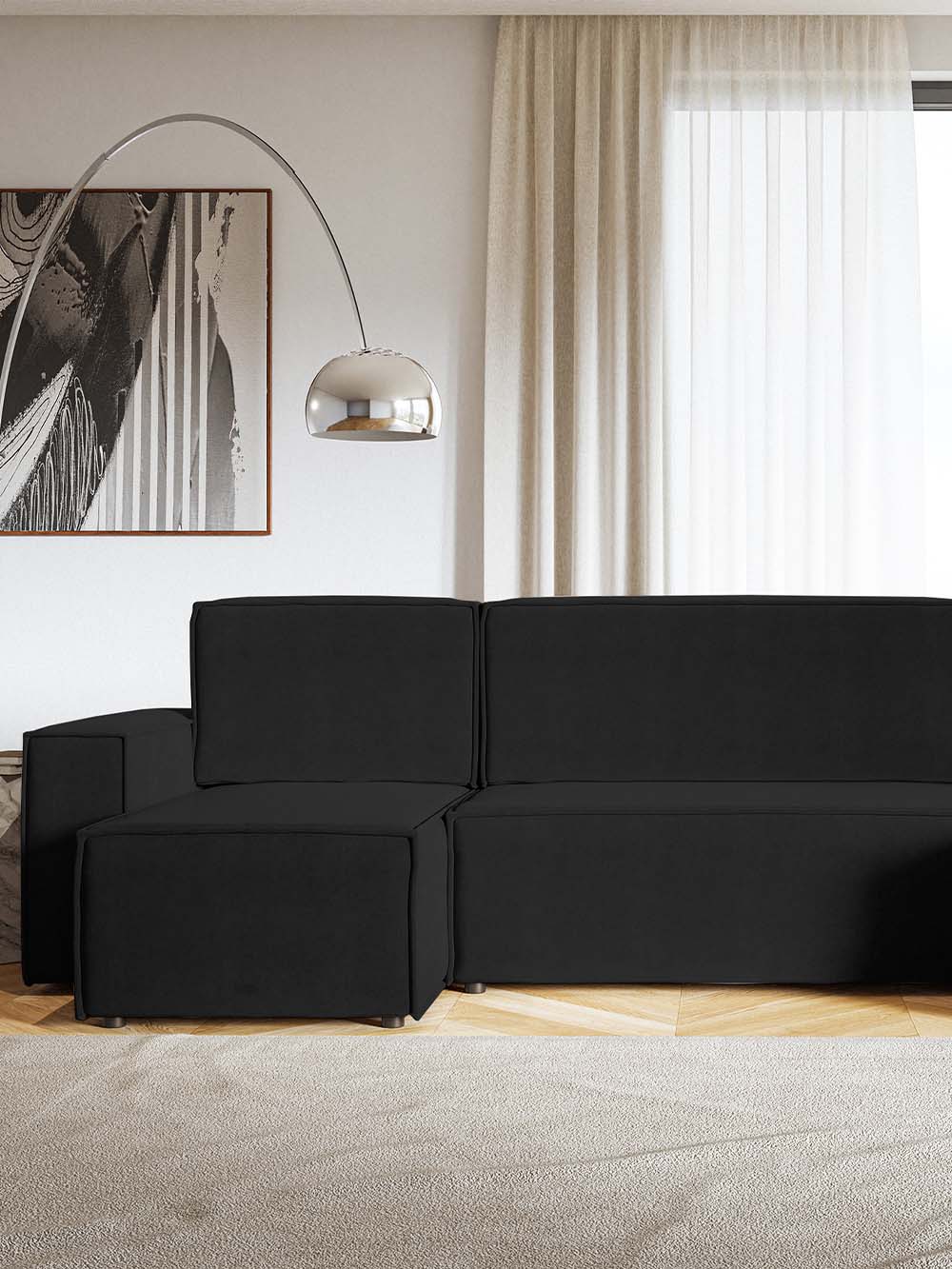 Kampinė sofa Kena – modernių, simetriškų formų ir praktiško dizaino baldas, puikiai tinkantis kasdieniam naudojimui. Juodos spalvos audinys kuria solidų ir išraiškingą įvaizdį, o patogus atlošas su nuimamomis pagalvėmis bei minkšta sėdimoji dalis užtikrina malonų poilsį. Sofa turi DL miegojimo funkciją ir patalynės dėžę, todėl tampa patogiu ir praktišku pasirinkimu namams.