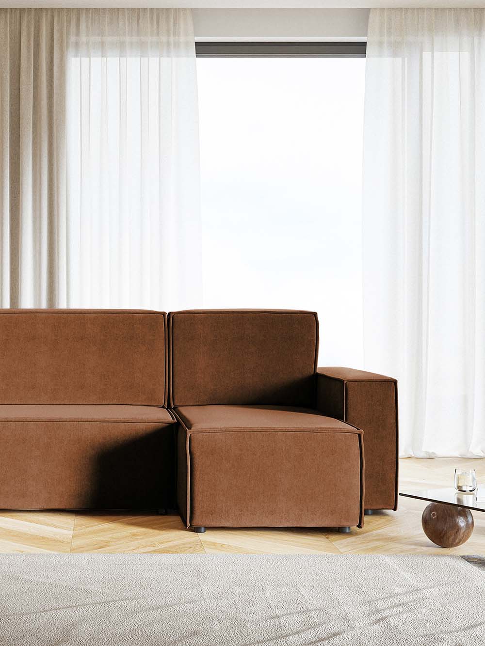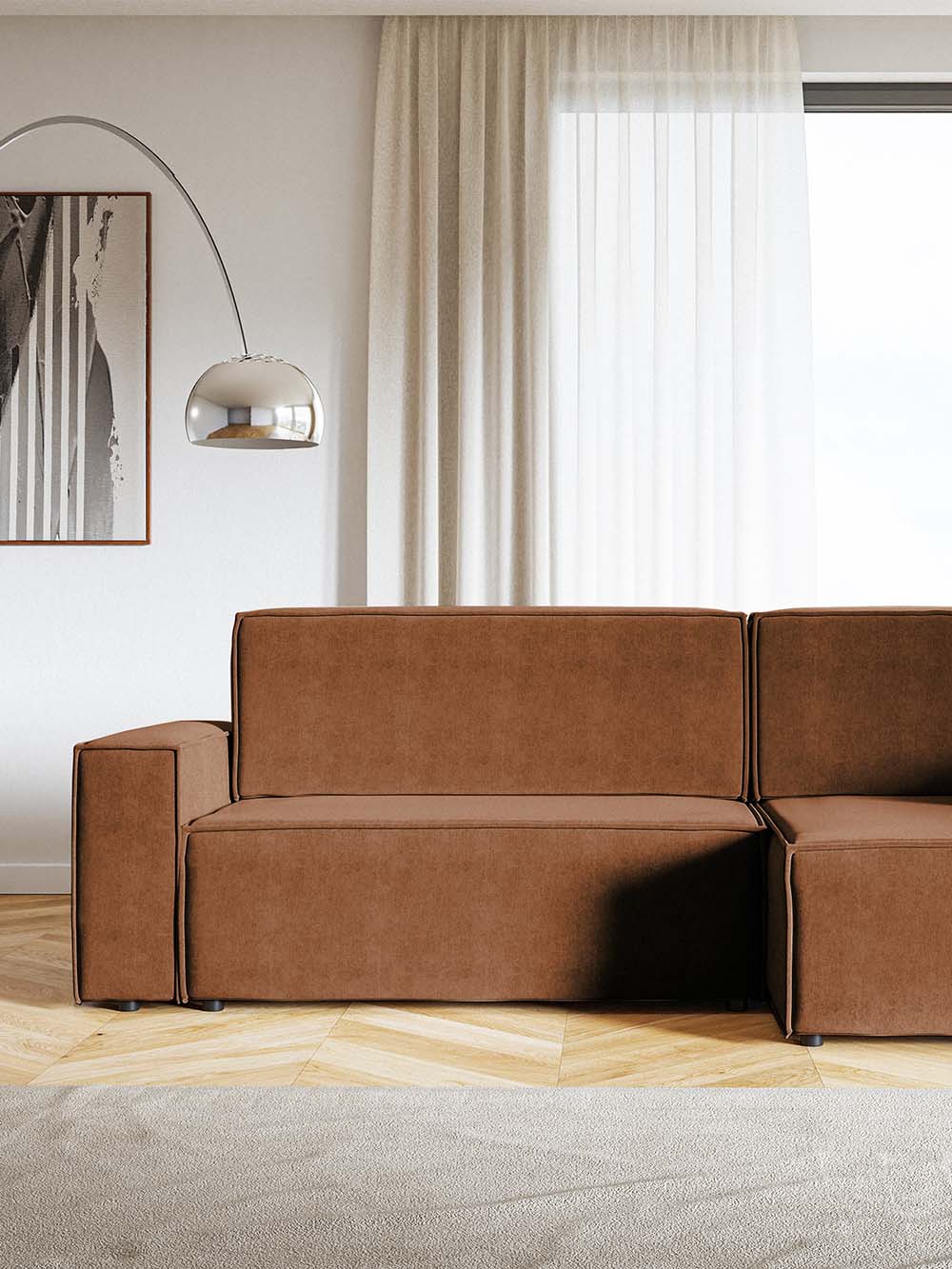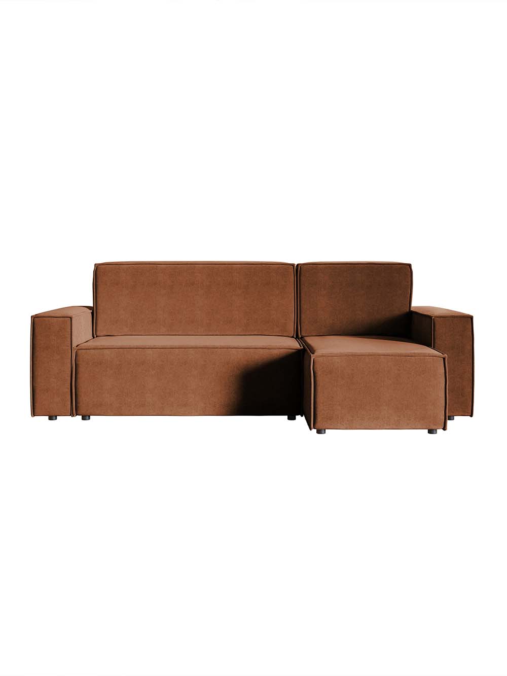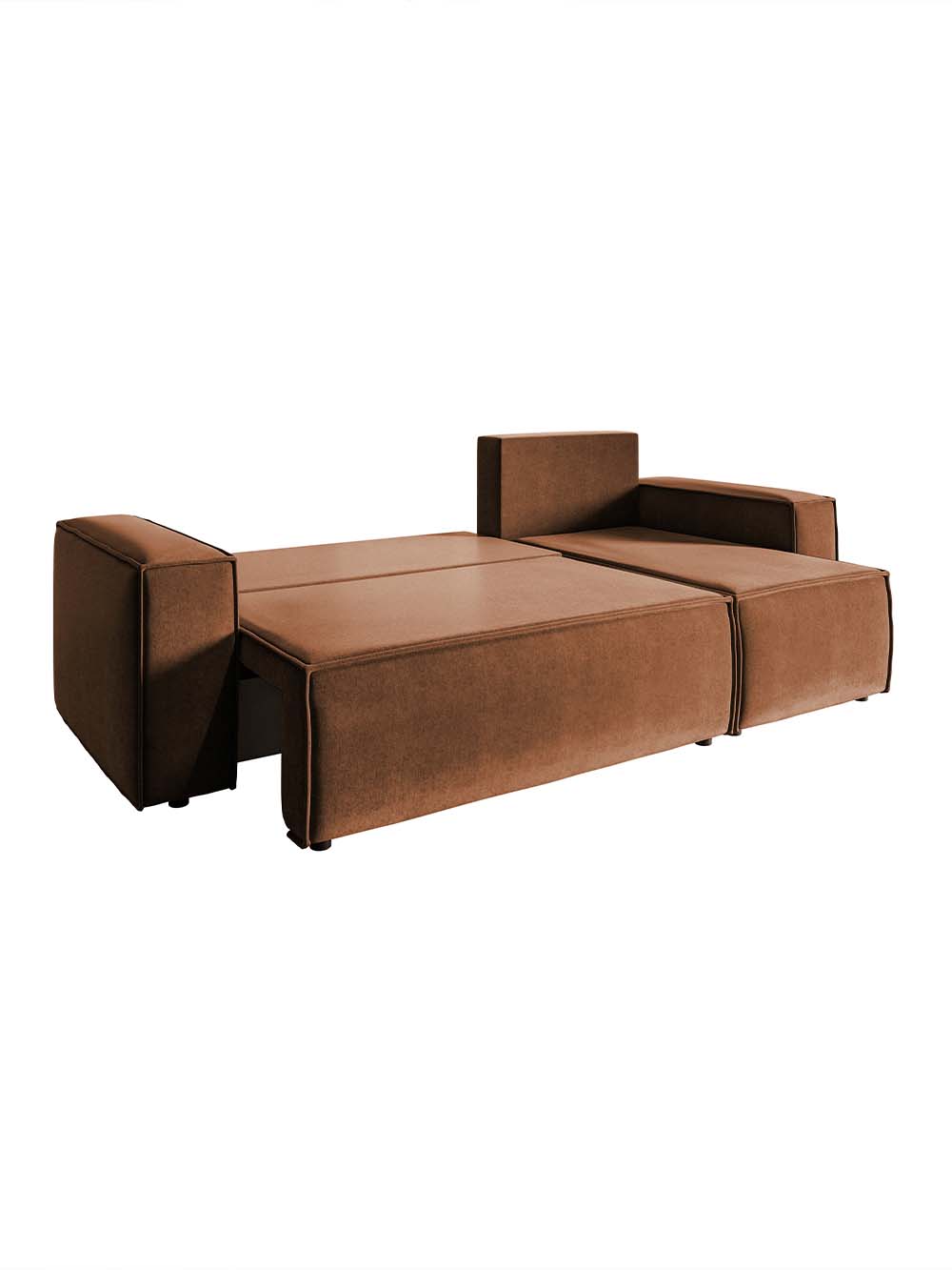 Kampinė sofa Kena – modernių formų ir praktiško dizaino baldas, puikiai tinkantis kasdieniam naudojimui. Vario spalvos veliūras pabrėžia solidų ir stilingą įvaizdį. Patogus atlošas su nuimamomis pagalvėmis ir minkšta sėdimoji dalis užtikrina komfortą poilsiui. Sofa turi DL miegojimo funkciją ir patalynės dėžę, o kampo pusę galima pasirinkti surinkimo metu.