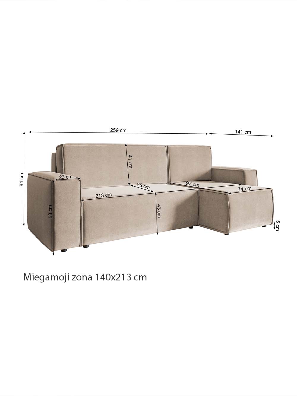 Miegojimo dalies matmenys: plotis / ilgis: 140 / 213 cm.