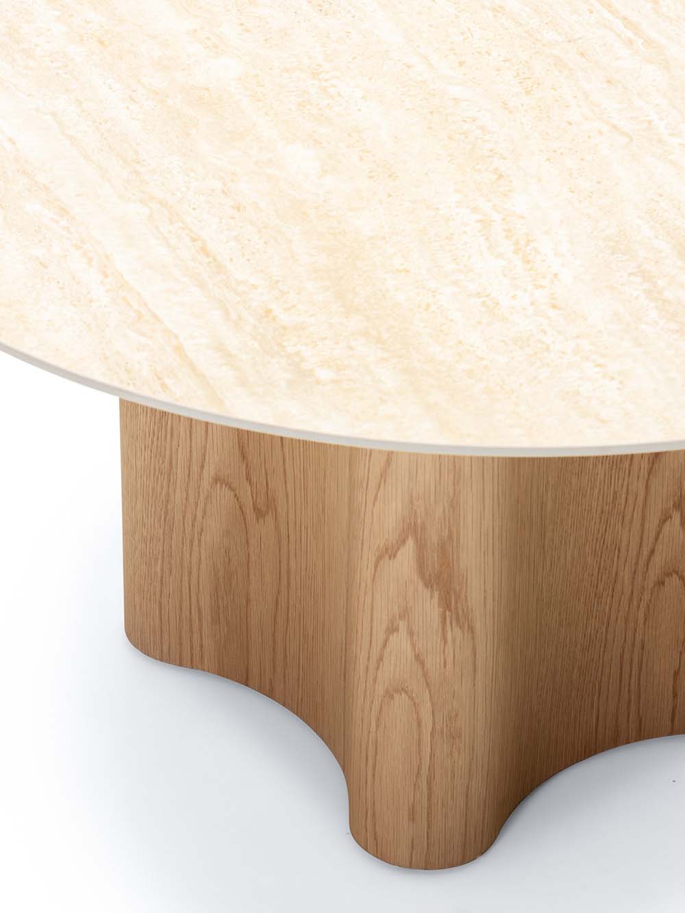 Kavos staliukas Ales – tai išraiškingas akcentas, sukurtas šiuolaikiniam interjerui. Keramikinis stalviršis, vizualiai primenantis travertiną, perteikia natūralaus akmens grožį, tačiau yra kur kas atsparesnis kasdieniam naudojimui. Paviršius nebijo karščio, dėmių ar UV spindulių, todėl išlaiko nepriekaištingą išvaizdą ilgus metus. Ąžuolo faneruotės pagrindas su subtiliomis formomis suteikia baldui šilumos ir natūralumo pojūtį.
