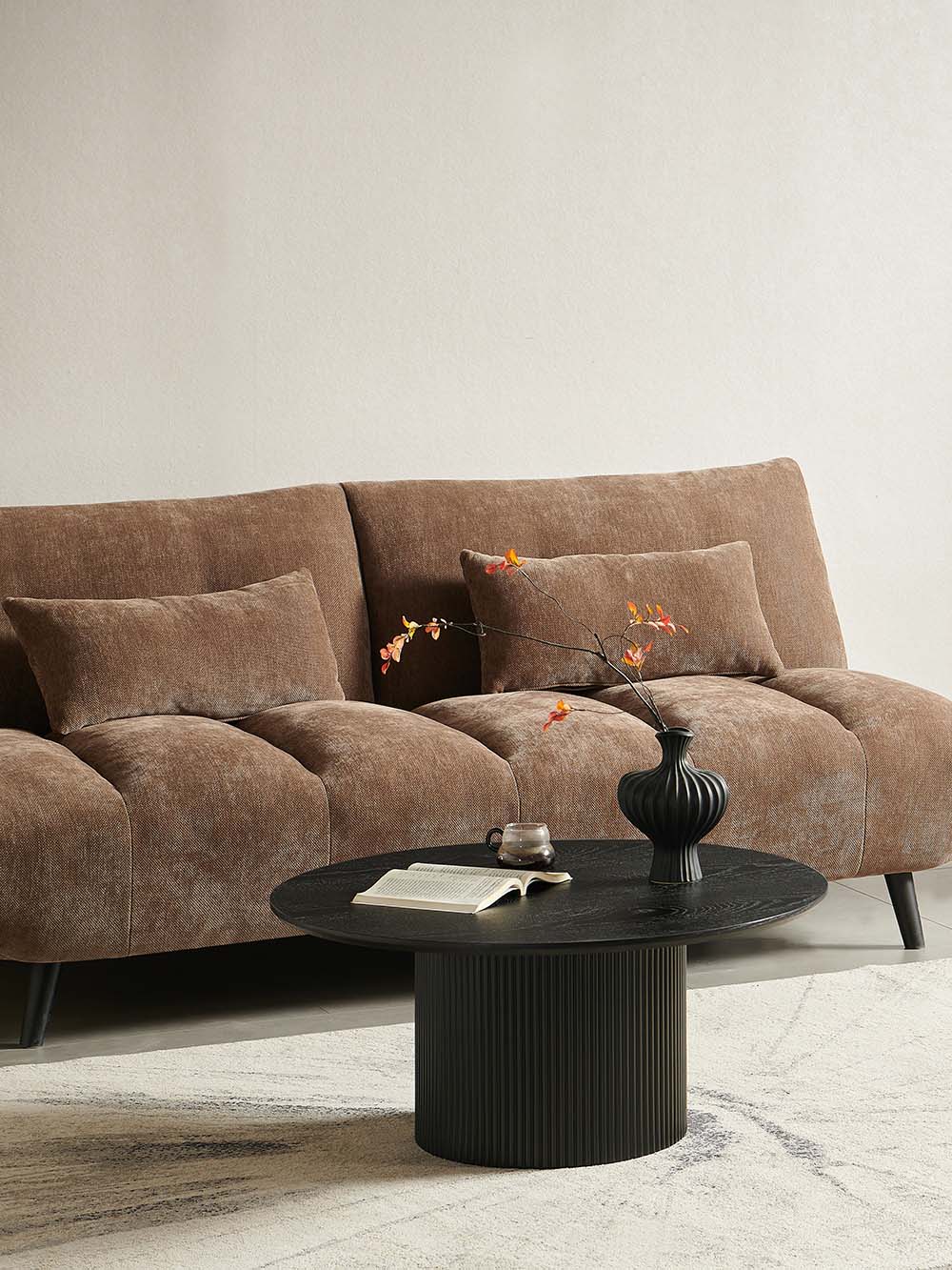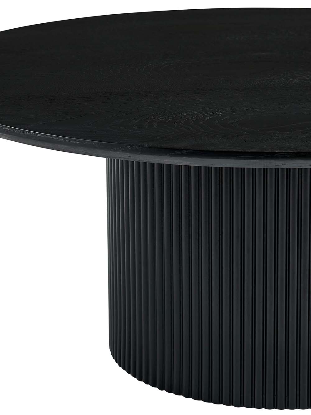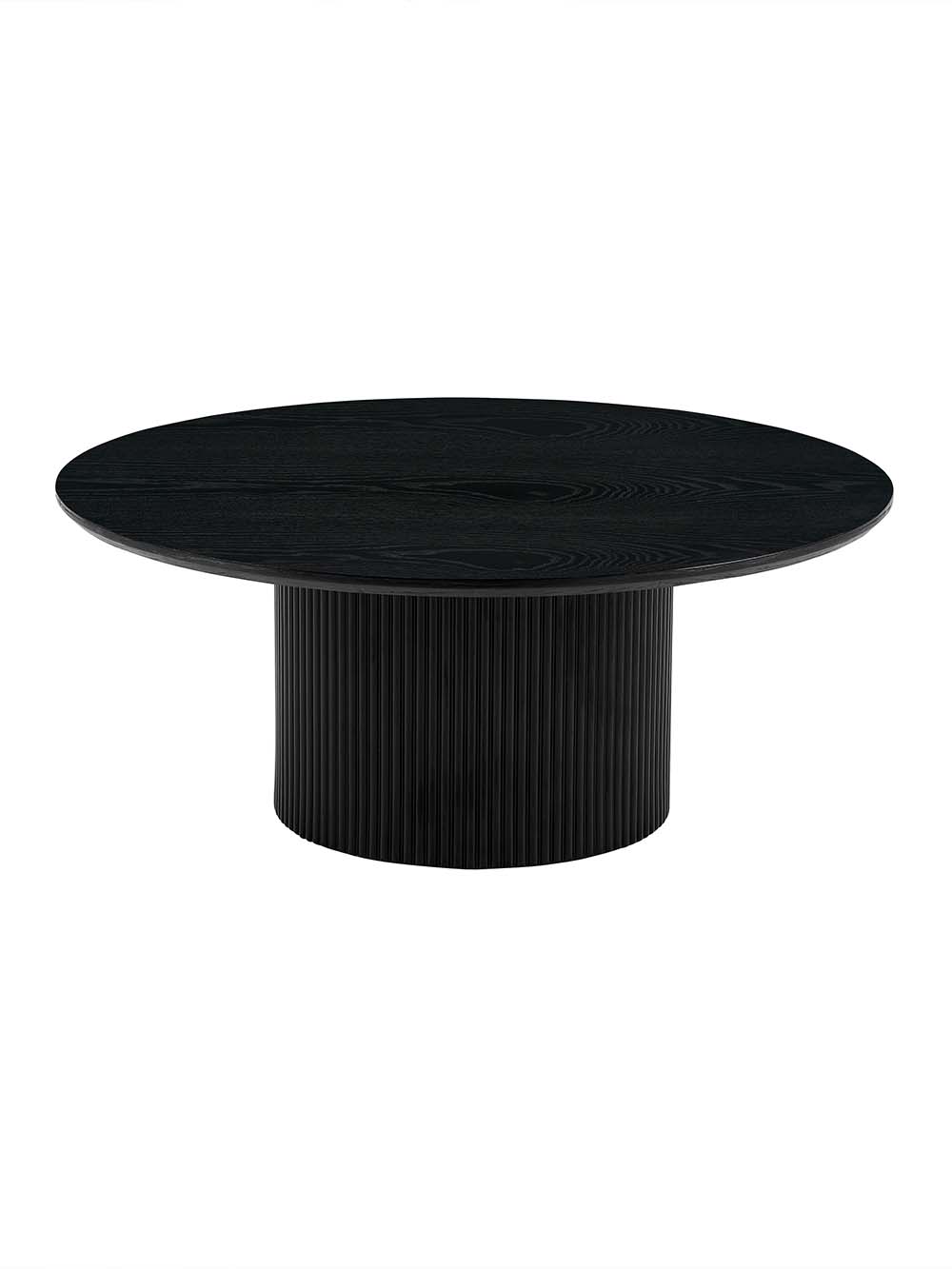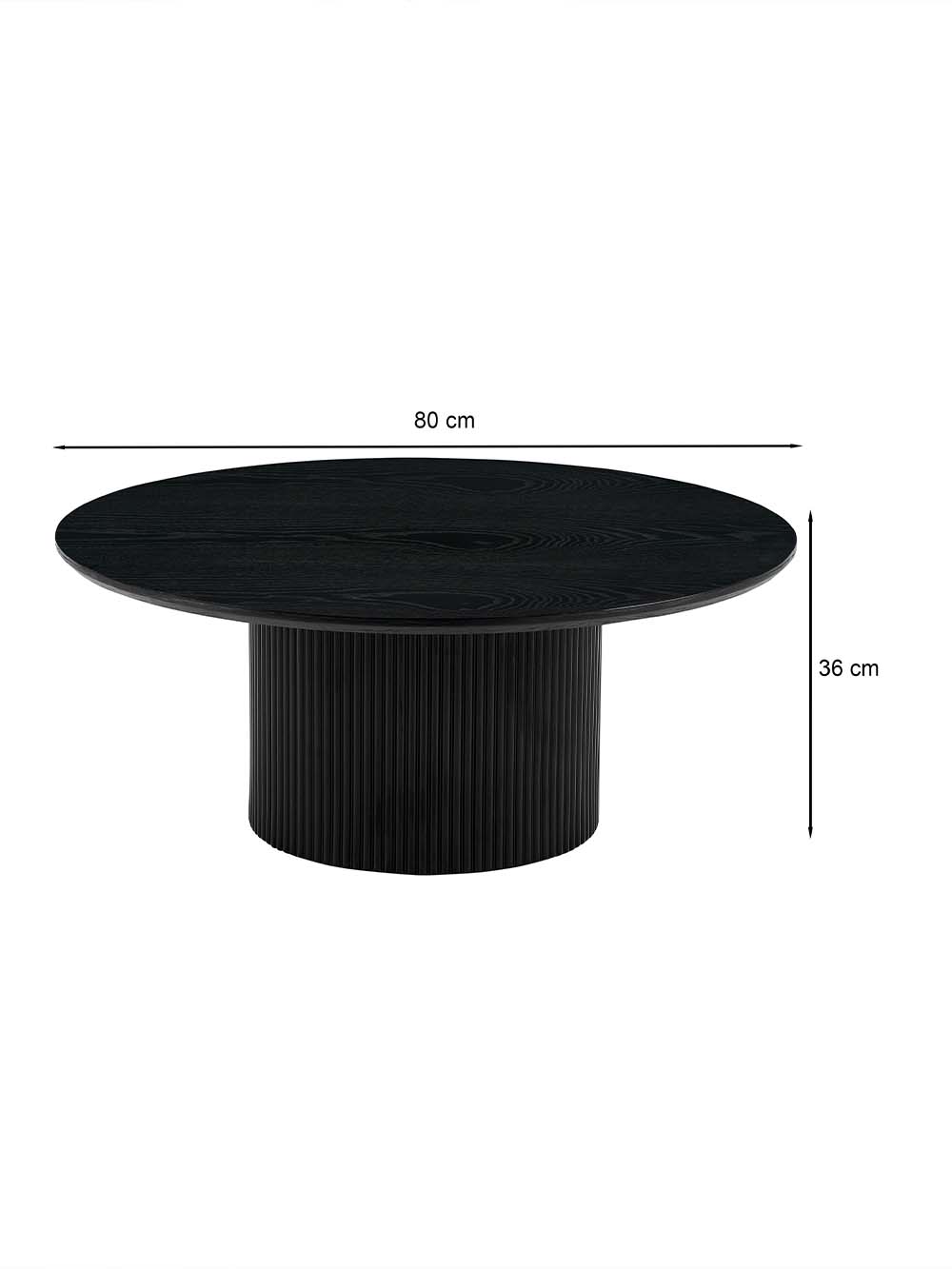Kavos staliukas Barel – tai modernus baldas, išsiskiriantis masyvia cilindrine forma ir vertikalių lamelių dizainu. Juodas, natūraliu uosio lukštu dengtas stalviršis subtiliai atskleidžia medžio tekstūrą ir papildo vientisą įvaizdį. Apvali forma ir stabilus pagrindas užtikrina patogų kasdienį naudojimą.
