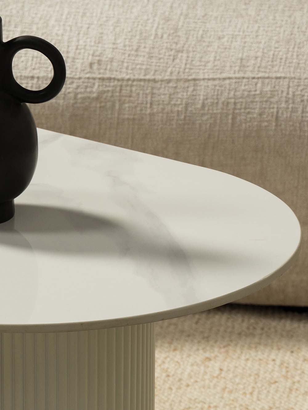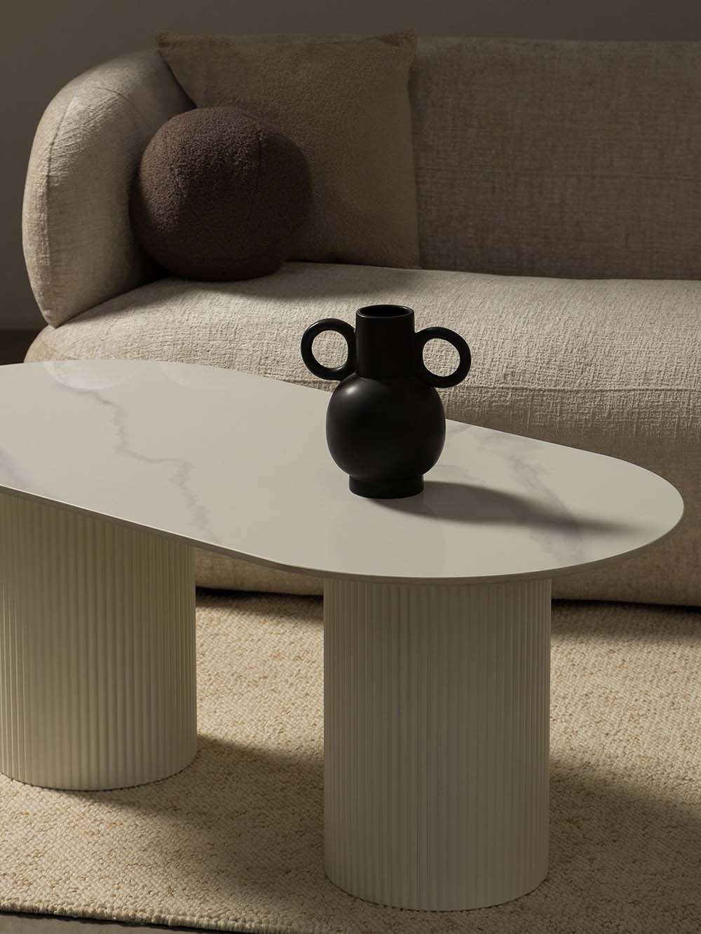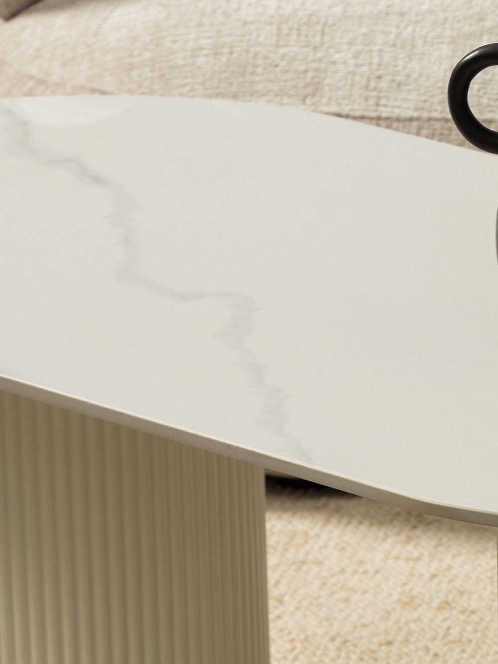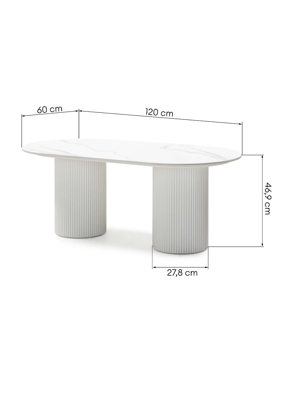 Kavos staliukas Puglia – tai elegancijos ir funkcionalumo derinys. Stalviršis pagamintas iš keramikos, kuri vizualiai primena baltą marmurą, tačiau yra gerokai praktiškesnė kasdieniam naudojimui. Keramikinis paviršius atsparus įbrėžimams, dėmėms, karščiui ir UV spinduliams – ant jo galima drąsiai statyti karštus indus, nebijant dėmių ar išblukimo. Stabilios MDF kojos su dekoratyvinėmis lamelėmis suteikia staliukui tvirtumo ir išskirtinio charakterio.