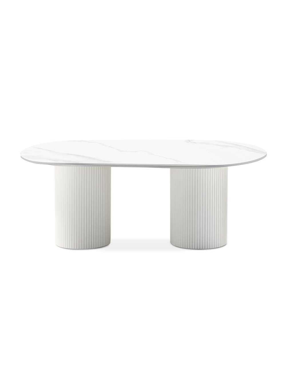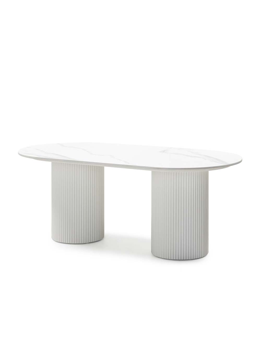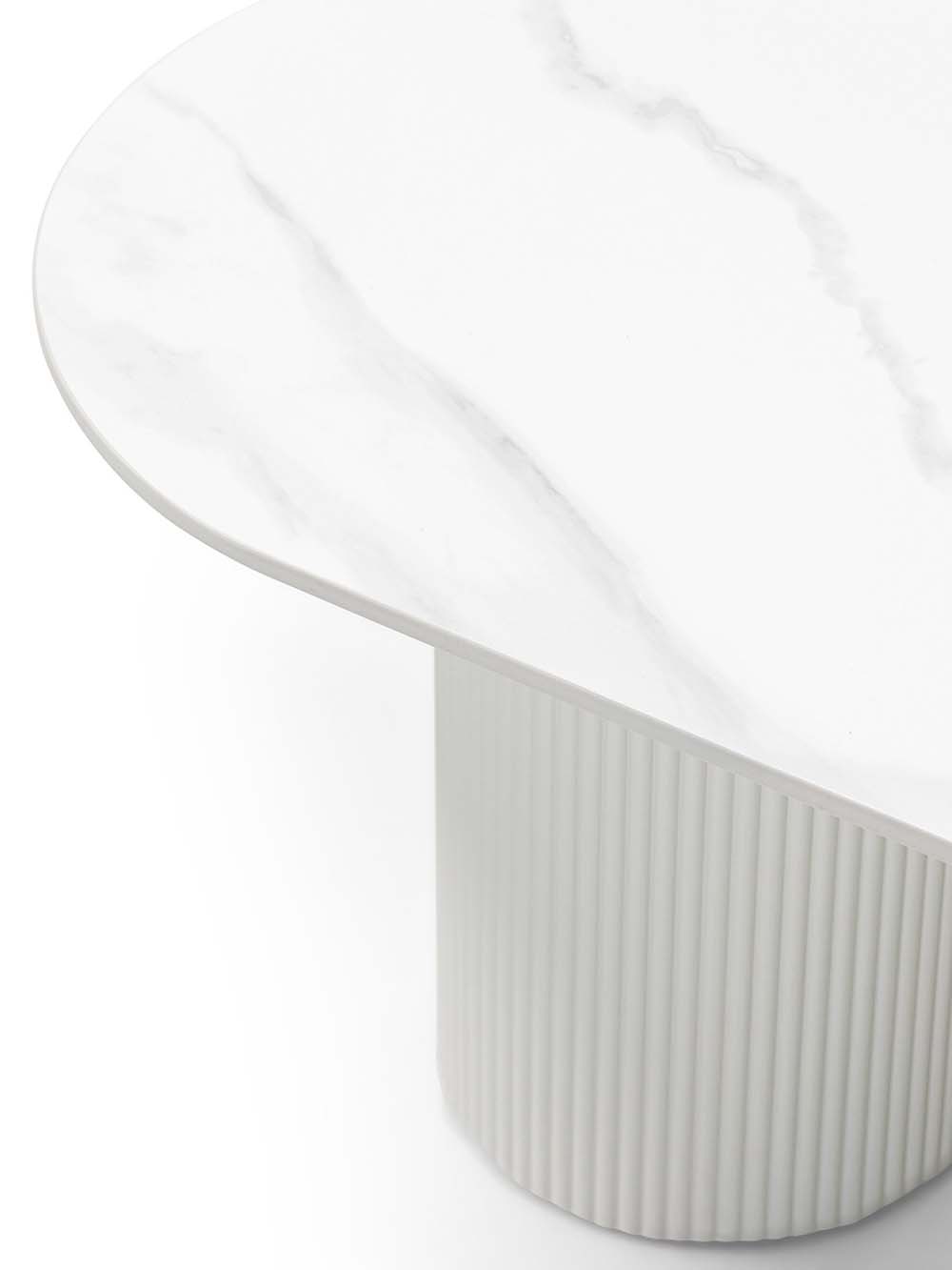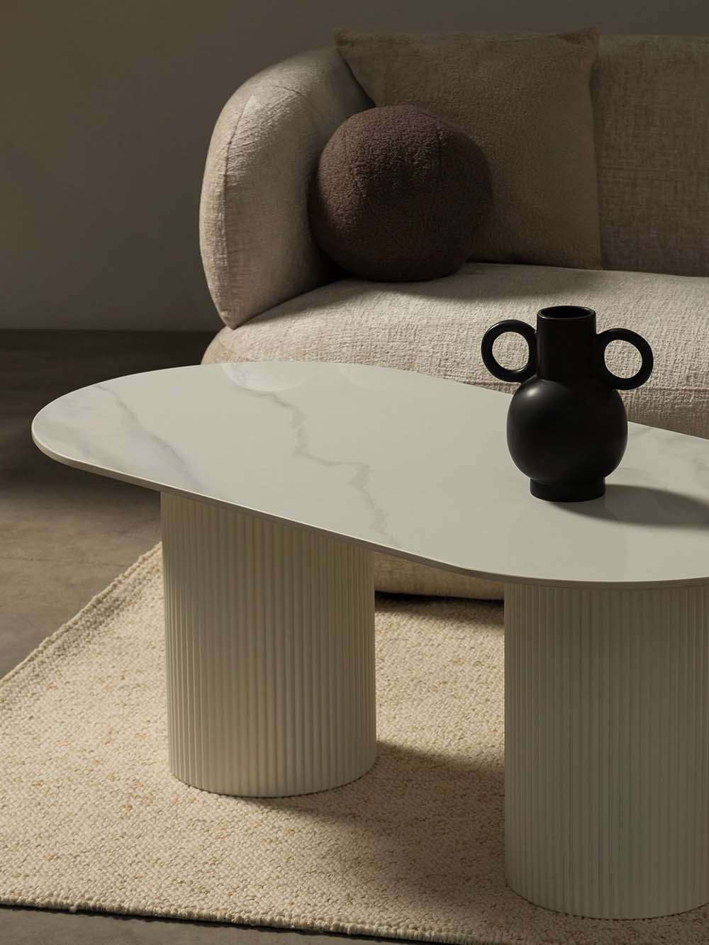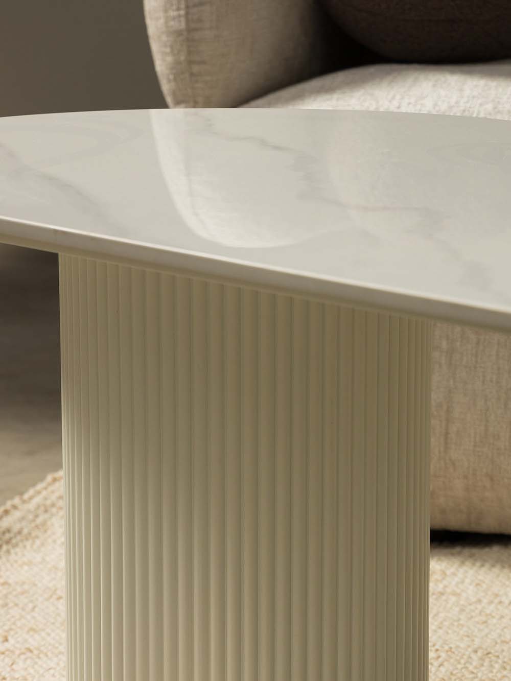 Kavos staliukas Puglia – tai elegancijos ir funkcionalumo derinys. Stalviršis pagamintas iš keramikos, kuri vizualiai primena baltą marmurą, tačiau yra gerokai praktiškesnė kasdieniam naudojimui. Keramikinis paviršius atsparus įbrėžimams, dėmėms, karščiui ir UV spinduliams – ant jo galima drąsiai statyti karštus indus, nebijant dėmių ar išblukimo. Stabilios MDF kojos su dekoratyvinėmis lamelėmis suteikia staliukui tvirtumo ir išskirtinio charakterio.