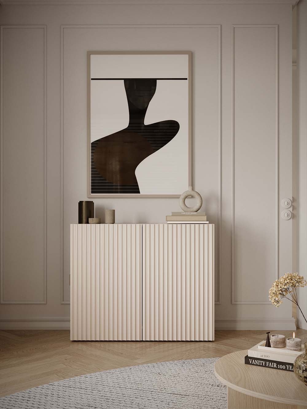 Baldų kolekcija Kopa – tai šiuolaikiško dizaino kolekcija su vertikaliai frezuotais fasadais ir minimalistine forma. Švelni kašmyro spalva suteikia interjerui jaukumo, o nuo paspaudimo atidaromos durelės užtikrina patogų kasdienį naudojimą ir tvarkingą išvaizdą.