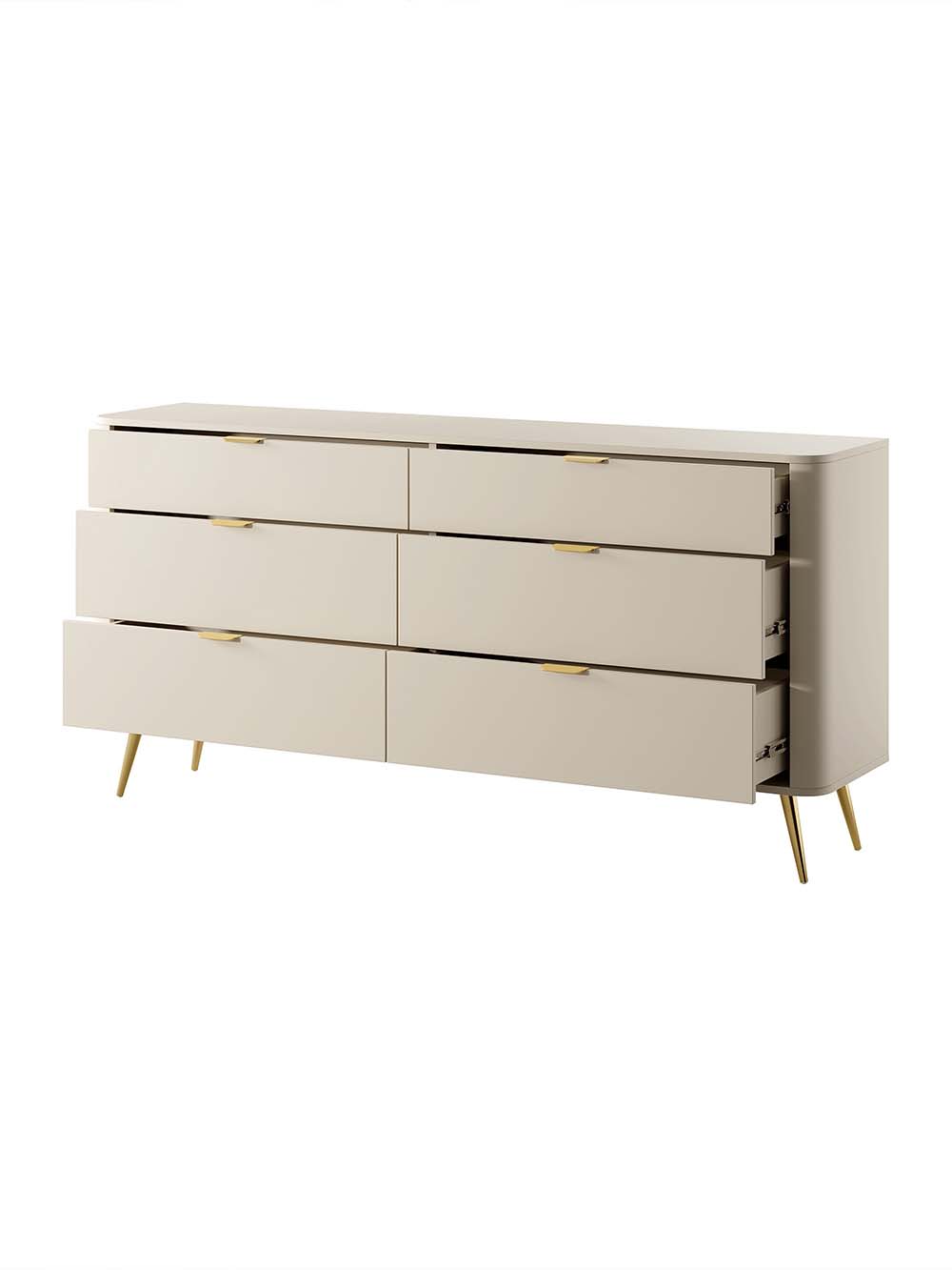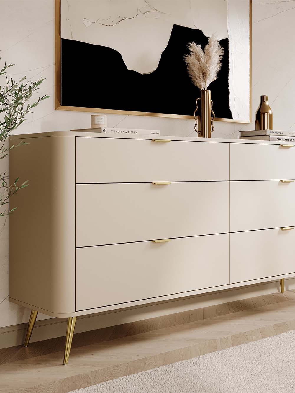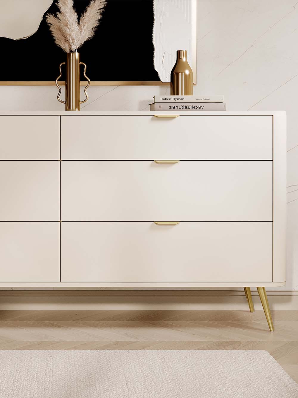 Baldų kolekcija Molveno – tai šiuolaikiško dizaino ir subtilios estetikos derinys, sukurtas moderniam interjerui. Švelnūs, šilti atspalviai suteikia interjerui jaukumo ir vizualinio lengvumo, o auksinės metalinės kojelės ir rankenėlės tampa išskirtiniu, rafinuotu akcentu. Apvalinti kampai ir harmoningos proporcijos kuria vizualiai subalansuotą ir tvarkingą baldų išvaizdą. Tai kolekcija, kuri subtiliai papildo interjerą ir išlaiko stiliaus balansą.