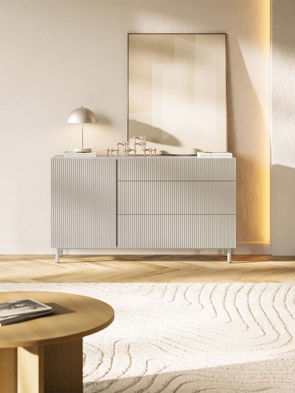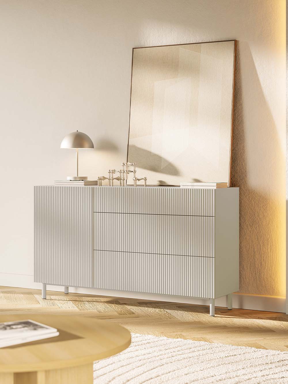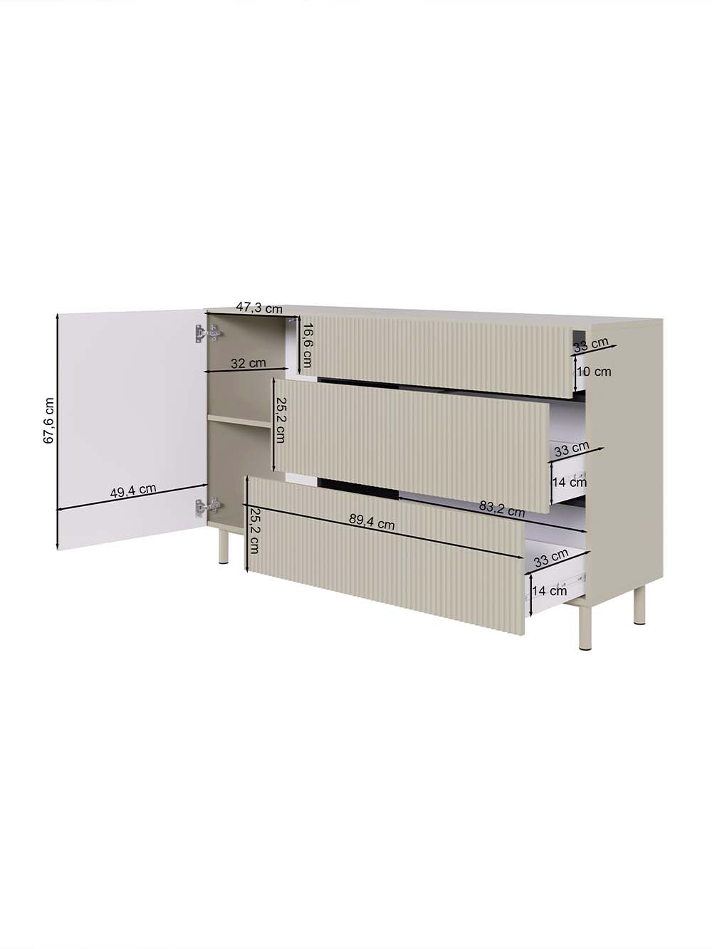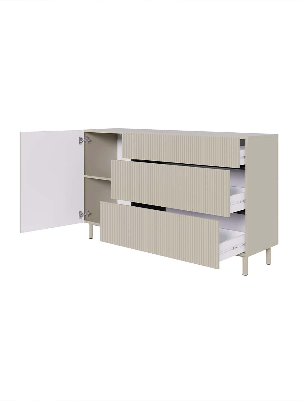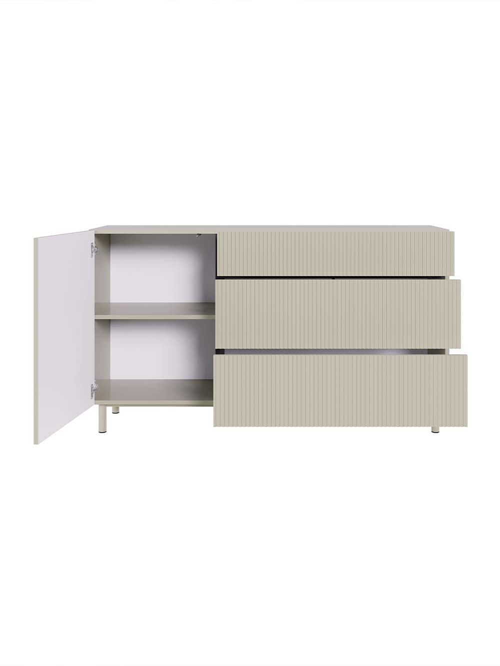 Stalčiaus priekio ir durelių medžiaga: frezuota ir laminuota korpuso spalvos MDF plokštė.