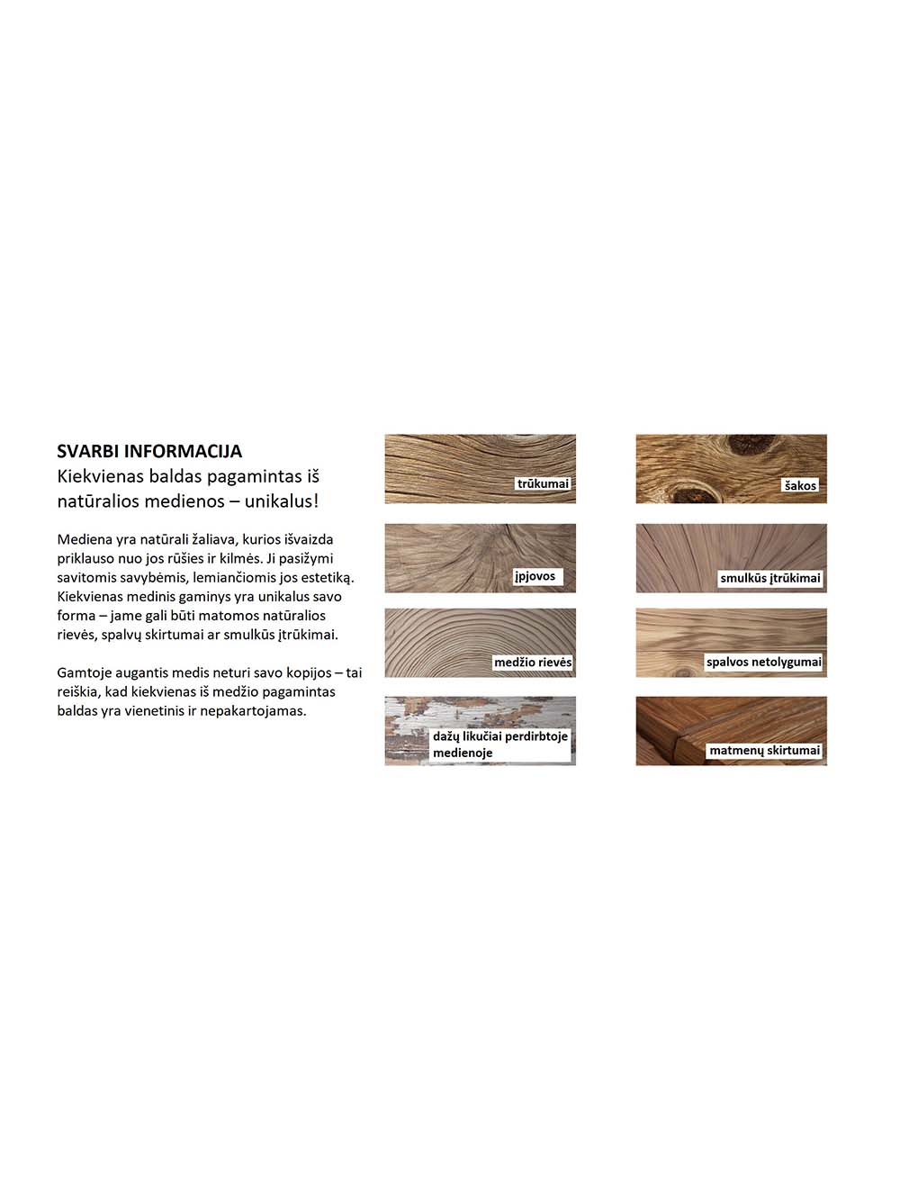 Papildoma informacija: baldai, pagaminti iš natūralios medienos, pasižymi jai būdingomis savybėmis ir yra unikalūs. Medienoje gali būti matomos šakos, rievės, smulkūs įtrūkimai, įdubimai, nelygumai, tekstūros ar spalvos skirtumai. Šios savybės nėra laikomos defektais – jos pabrėžia natūralios medžiagos autentiškumą ir suteikia kiekvienam baldui išskirtinį charakterį. Dėl to realaus produkto išvaizda gali šiek tiek skirtis nuo pateiktų nuotraukų.