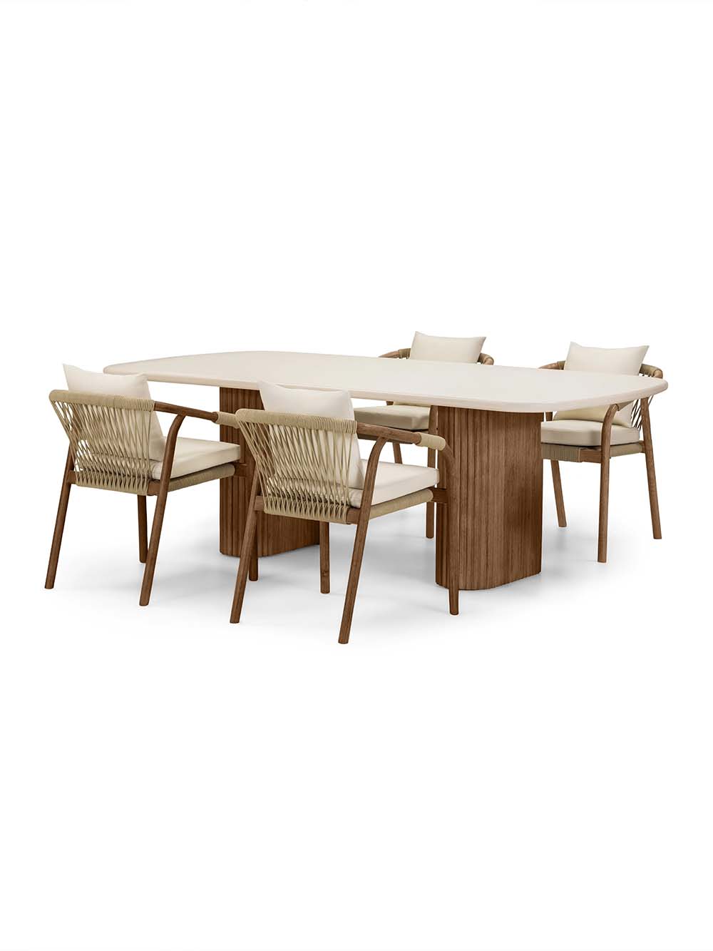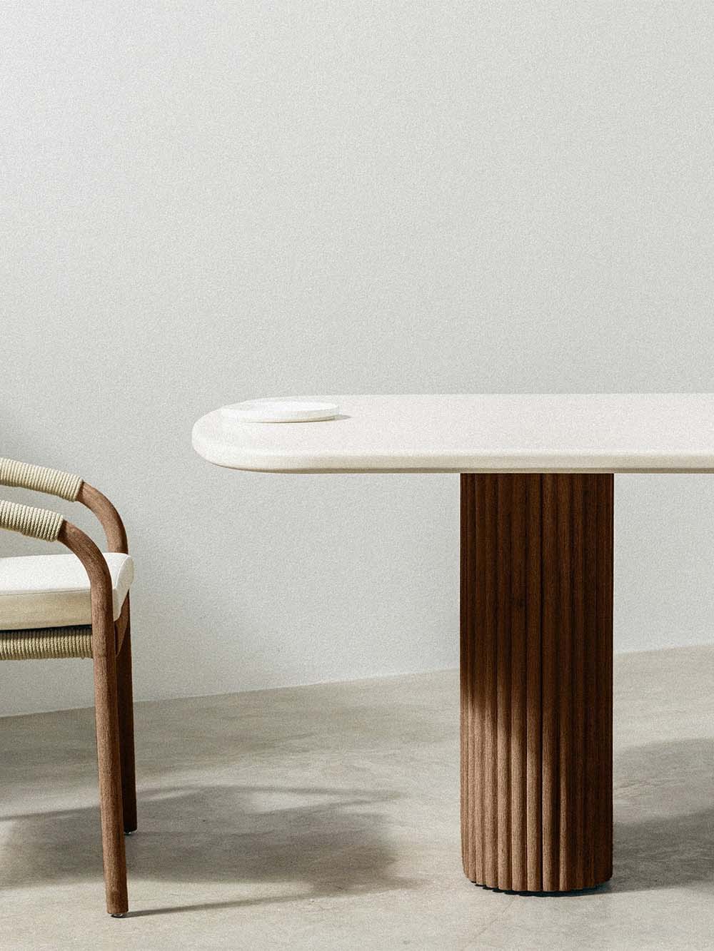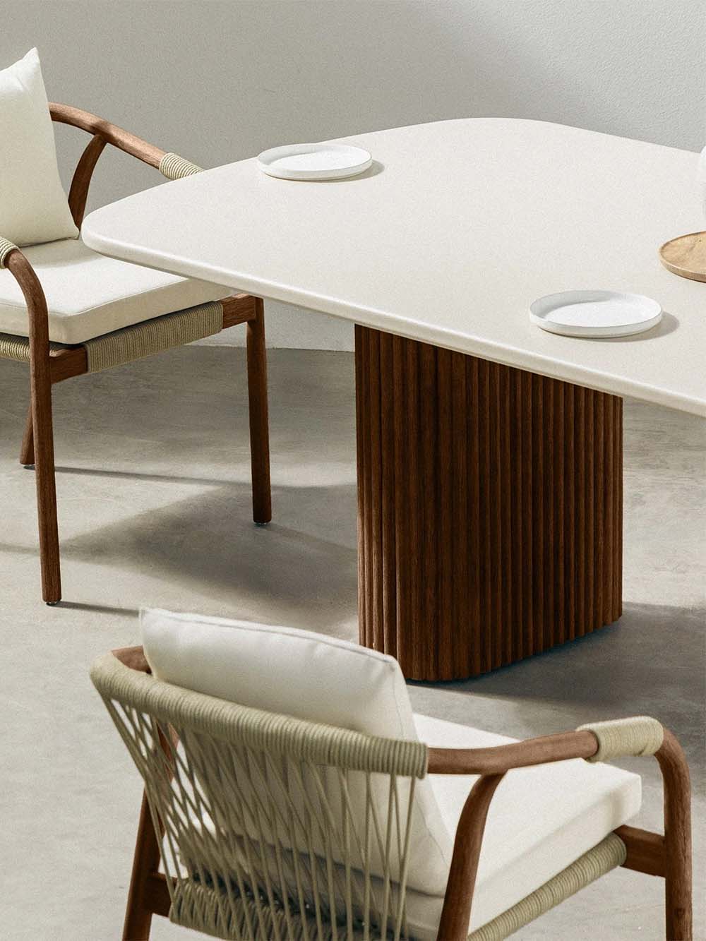 Lauko stalas Rogo – minimalistinio dizaino baldas, kuriame dera švari forma ir natūrali estetika. Smėlio spalvos stalviršis su švelniai užapvalintais kampais elegantiškai kontrastuoja su tamsios akacijos medienos kojų rėmu, suteikdamas stalui modernų ir išskirtinį charakterį. Dvi masyvios, vertikalia tekstūra dekoruotos kojos pabrėžia baldo stabilumą ir dizaino išskirtinumą. Tvirta konstrukcija ir patvarus stalviršis užtikrina patogų kasdienį naudojimą terasoje, sodo pavėsinėje ar lauko poilsio zonoje.