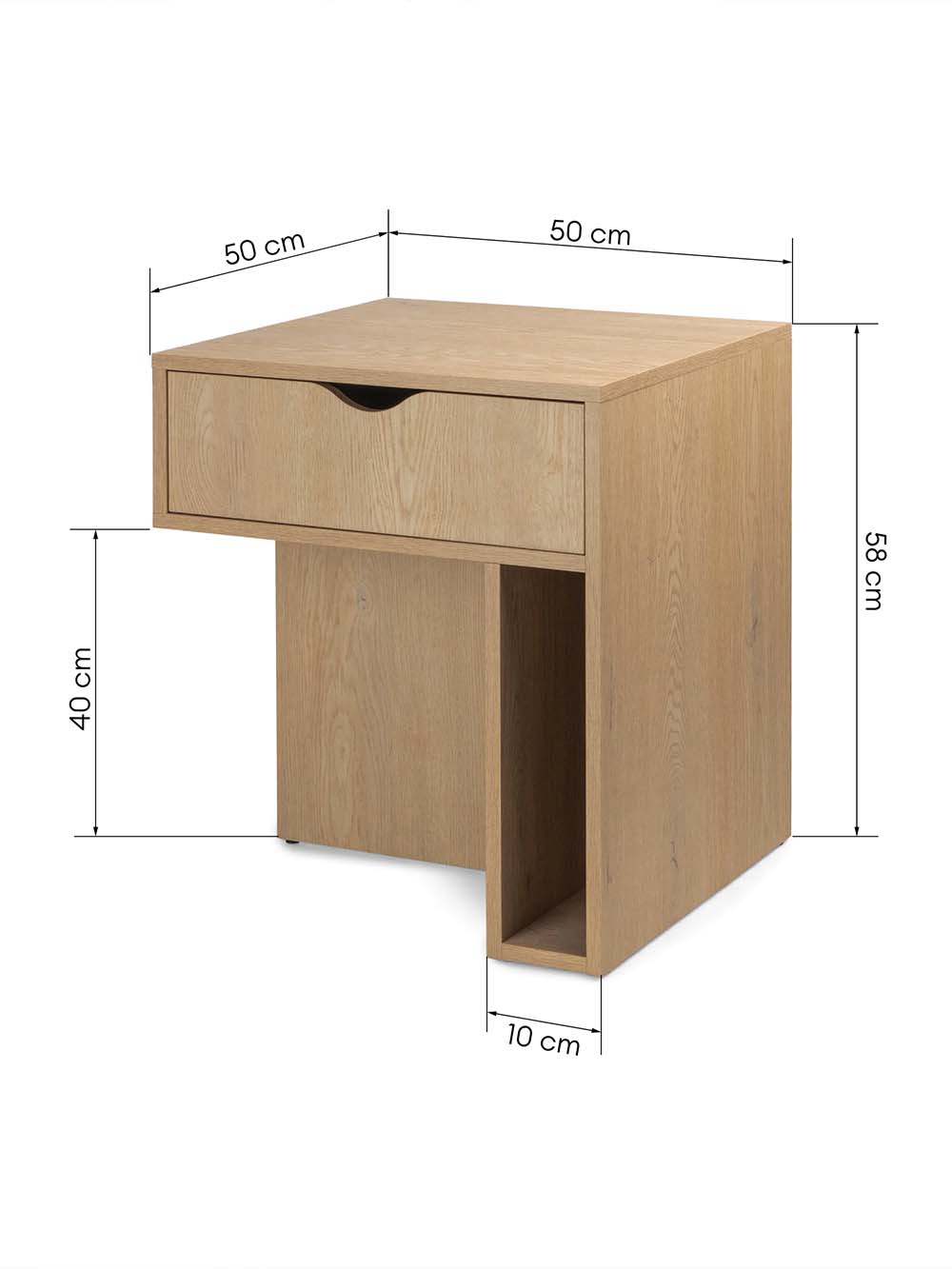 Išoriniai baldo matmenys: ilgis / plotis / aukštis, cm: 50 / 50 / 58.