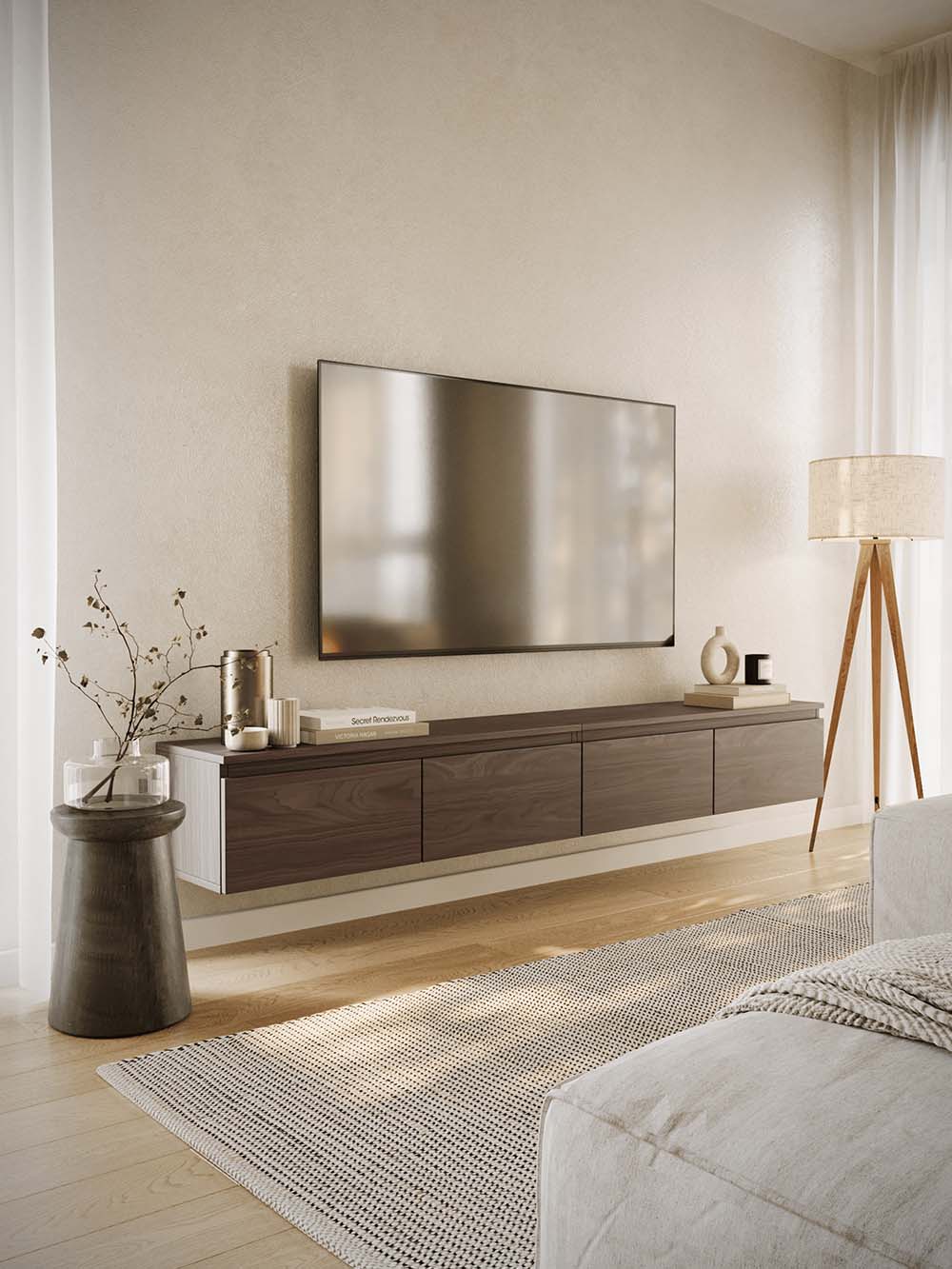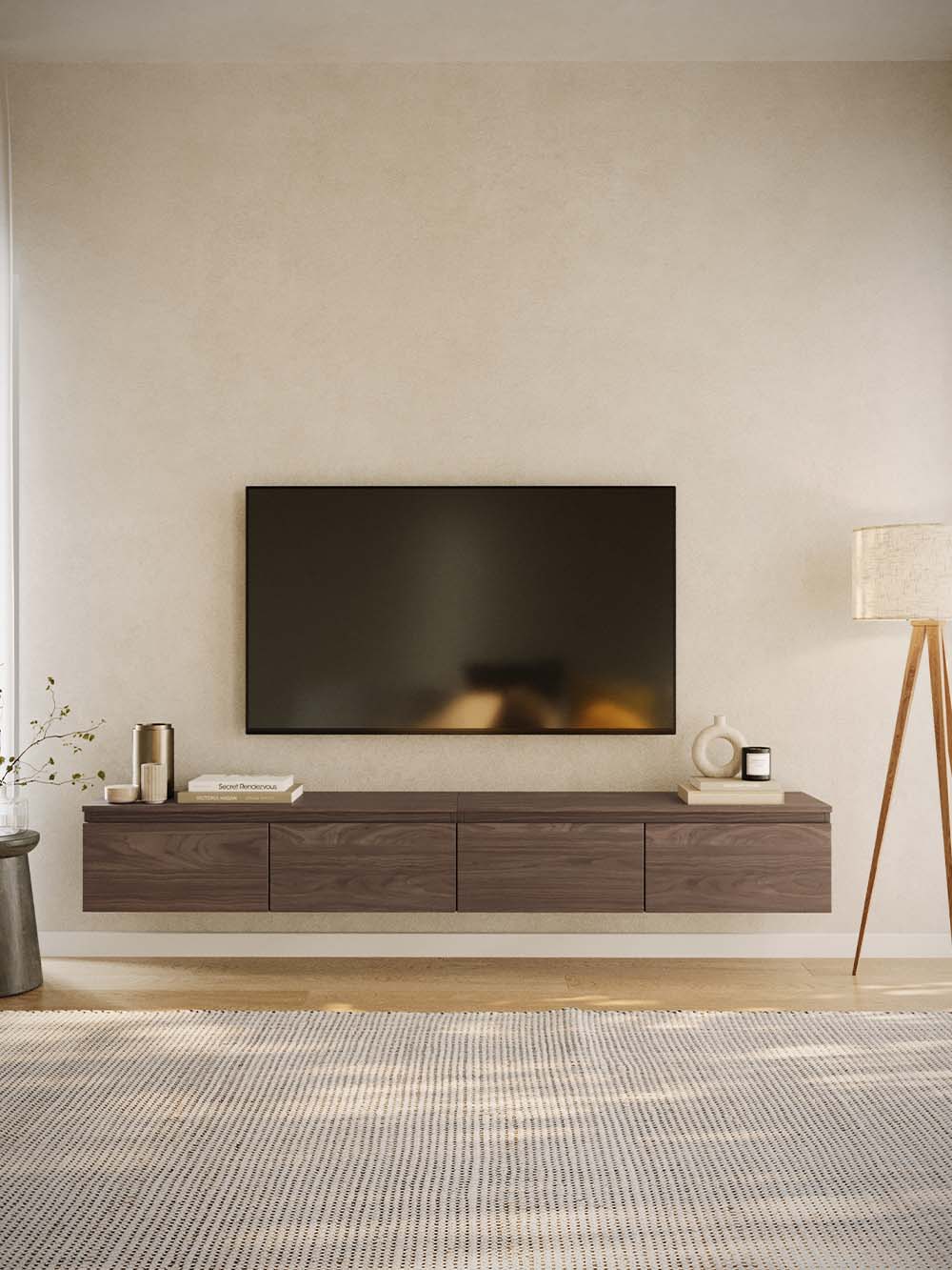 Demi – tai moderni pakabinamų baldų kolekcija, kuri sujungia estetiką, patogumą ir universalumą. Vizualiai lengvi, bet konstrukciškai tvirti baldai neapkrauna erdvės ir kuria švarų, harmoningą interjerą tiek miegamajame, tiek svetainėje, o laisva erdvė po jais leidžia lengvai palaikyti švarą – net ir naudojant robotą siurblį.