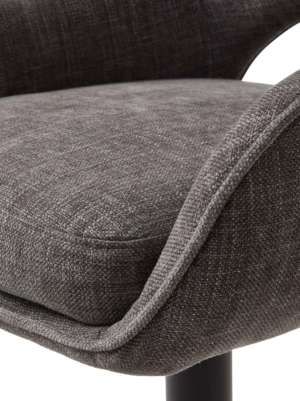 Pasukama baro kėdė Meyra žavi švelniomis, apvaliomis formomis ir moderniu dizainu. Grafito pilkos spalvos šenilo audinys suteikia jaukumo, o juodas matinis metalinis pagrindas kuria solidų ir stabilų įvaizdį. Ergonomiškas atlošas, patogiai paminkštinta sėdynė ir atrama kojoms, kuria komfortišką sėdėjimo patirtį. Pasukimo bei aukščio reguliavimo funkcijos prideda praktiškumo ir judėjimo laisvės. Puikiai tinka moderniam, skandinaviškam ar minimalistiniam interjerui.