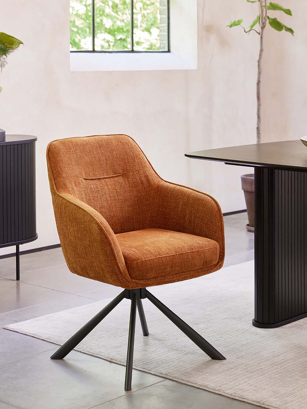 Pasukama valgomojo kėdė Zare – tai šiuolaikiško dizaino baldas, kuriame subtiliai išlenktas siluetas dera su modernia estetika. Rudai oranžinės spalvos šenilo audinys suteikia kėdei išskirtinumo, šilumos ir vizualinio jaukumo, o juodas matinis metalinis rėmas kuria švarų, modernų kontrastą. Ergonomiškas atlošas ir minkšta sėdimoji dalis užtikrina patogų sėdėjimą tiek ilgiems vakarams prie stalo, tiek kasdieniam naudojimui. Puikiai tinka moderniam, skandinaviškam ar industriniam interjerui, naudojama valgomojo, darbo ar poilsio zonoje.