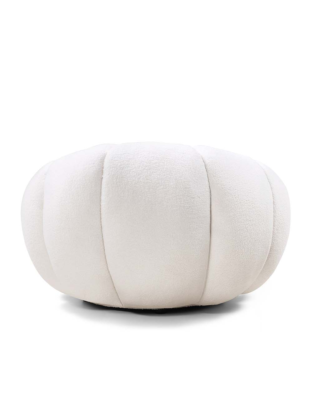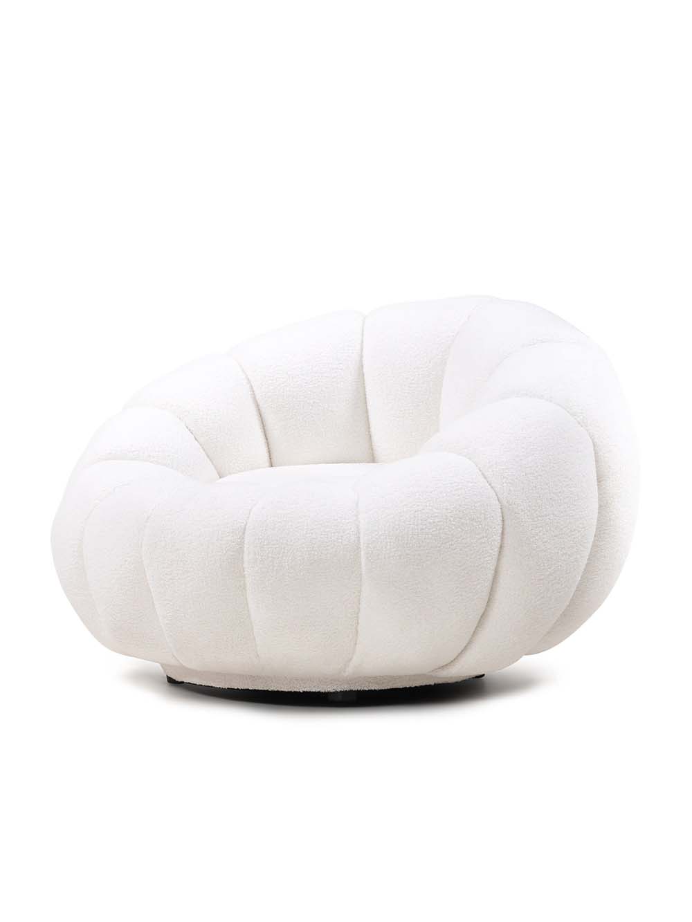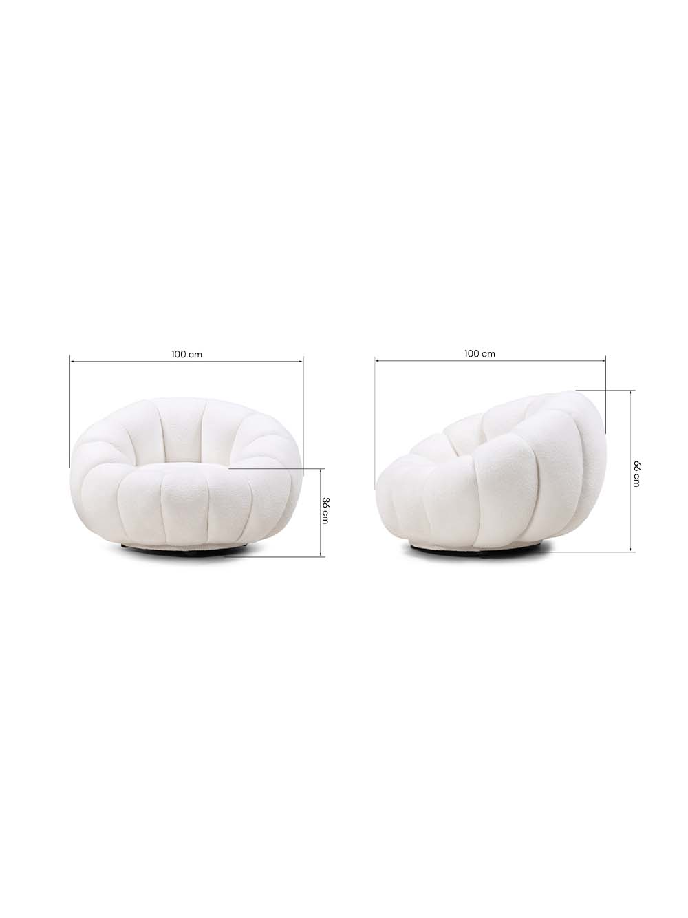Pasukamas fotelis Sevil – stilingas ir modernus baldas, aptrauktas kokybišku baltos spalvos boucle audiniu. Organinės, užapvalintos formos suteikia interjerui lengvumo ir harmonijos, o dekoratyvūs siūlių raštai pabrėžia išskirtinį dizainą bei dėmesį detalėms. Minkšta sėdimoji dalis užtikrina patogų poilsį, todėl fotelis tampa ne tik funkcionalus, bet ir itin jaukus. Pasukama 360° pagrindo konstrukcija suteikia visišką judėjimo laisvę, paversdama Sevil praktišku ir stilingu akcentu bet kuriuose namuose.