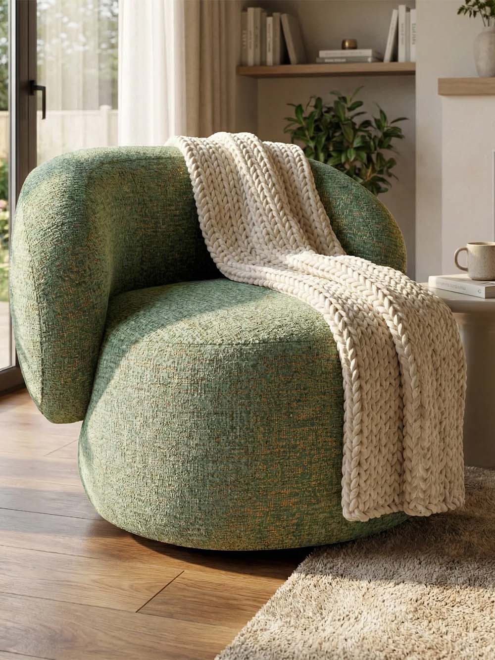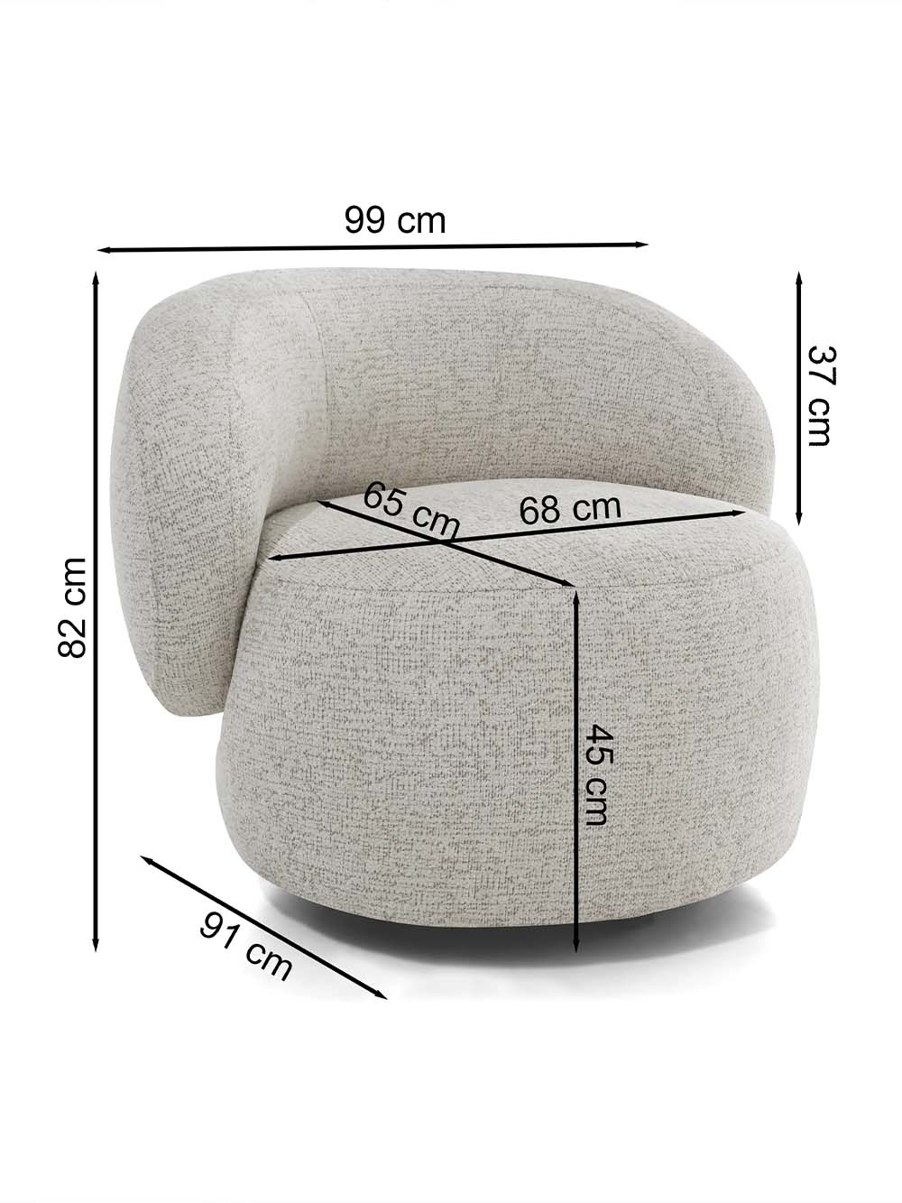Pasukamas fotelis Tammy – modernaus dizaino baldas, sukurtas patogiam ir kokybiškam poilsiui. Apvalios, minkštos formos ir reljefiškos, pynimą primenančios tekstūros audinys suteikia išskirtinumo bei vizualinio gylio. Komfortiškas atlošas ir proporcinga sėdimoji dalis leidžia patogiai įsitaisyti, o pasukamas mechanizmas suteikia daugiau judėjimo laisvės. Puikiai tinka svetainei, miegamajam ar jaukiam poilsio kampeliui.