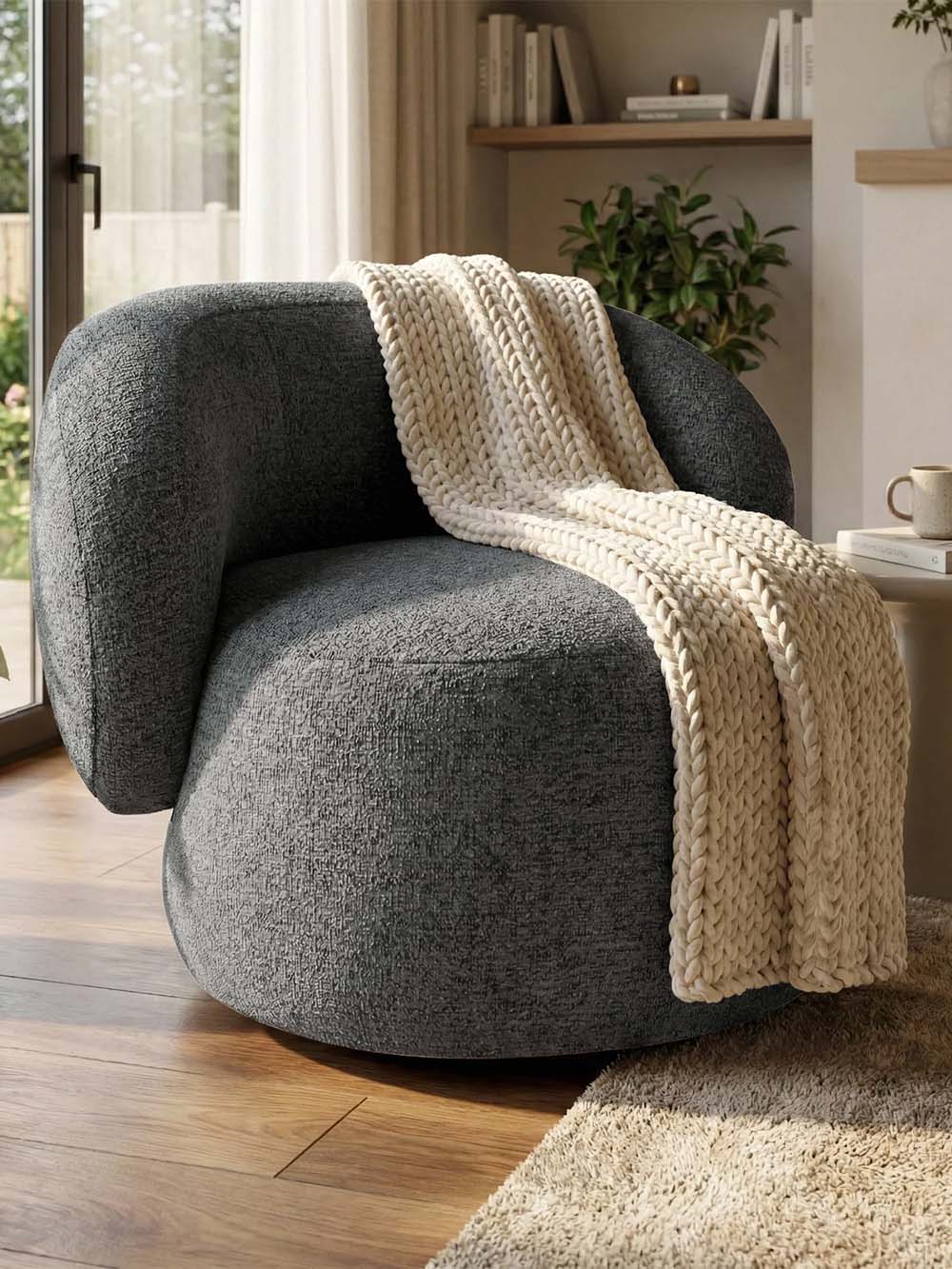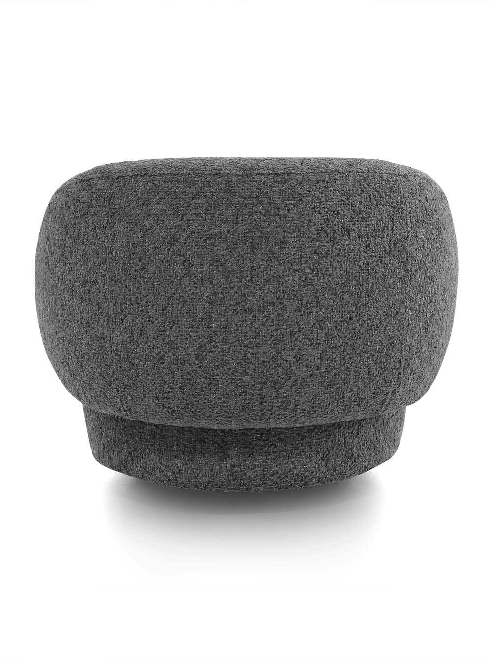 Pasukamas fotelis Tammy – modernaus dizaino baldas, sukurtas patogiam ir kokybiškam poilsiui. Apvalios, minkštos formos ir reljefiškos, pynimą primenančios tekstūros audinys suteikia išskirtinumo bei vizualinio gylio. Komfortiškas atlošas ir proporcinga sėdimoji dalis leidžia patogiai įsitaisyti, o pasukamas mechanizmas suteikia daugiau judėjimo laisvės. Puikiai tinka svetainei, miegamajam ar jaukiam poilsio kampeliui.