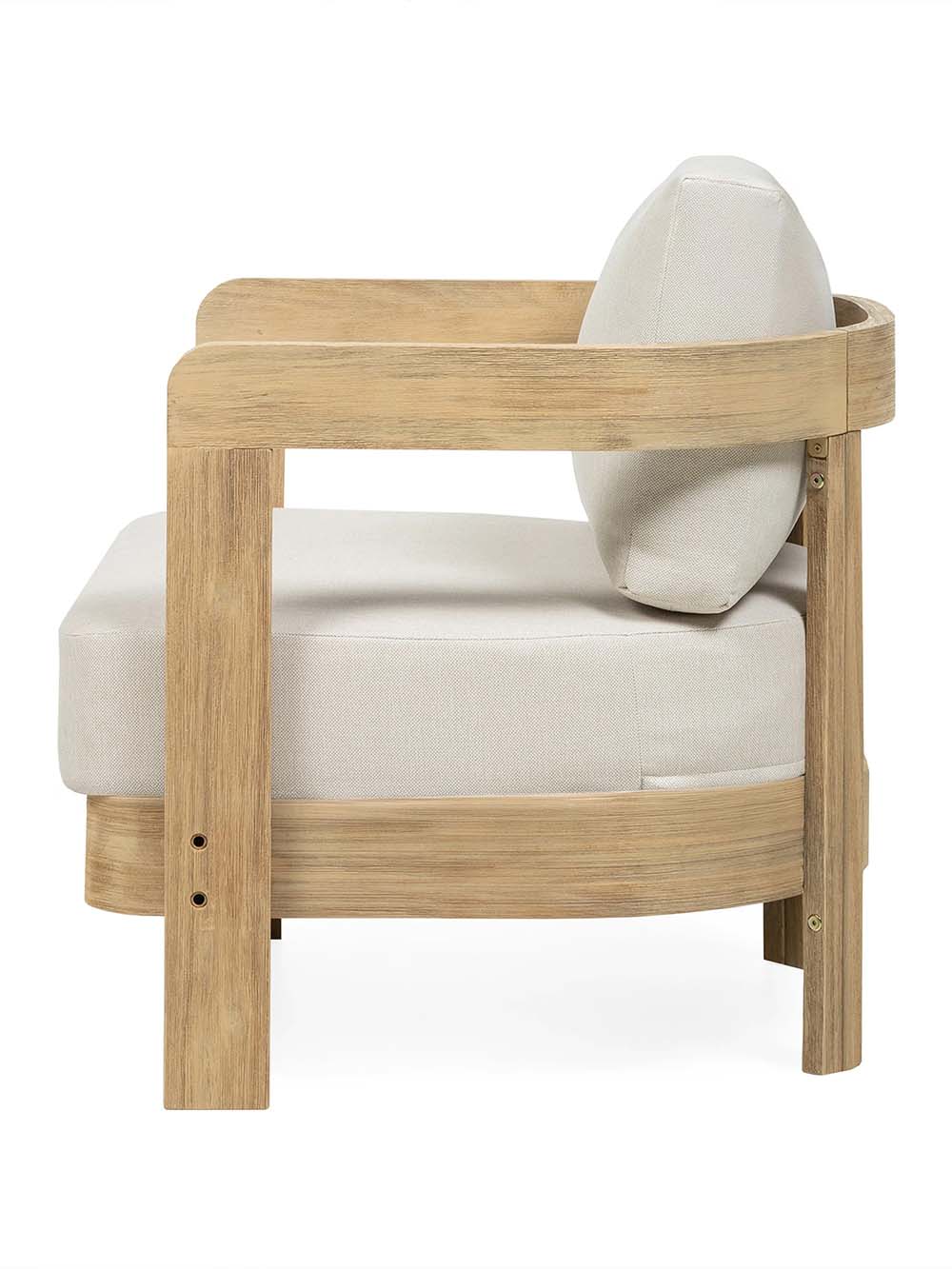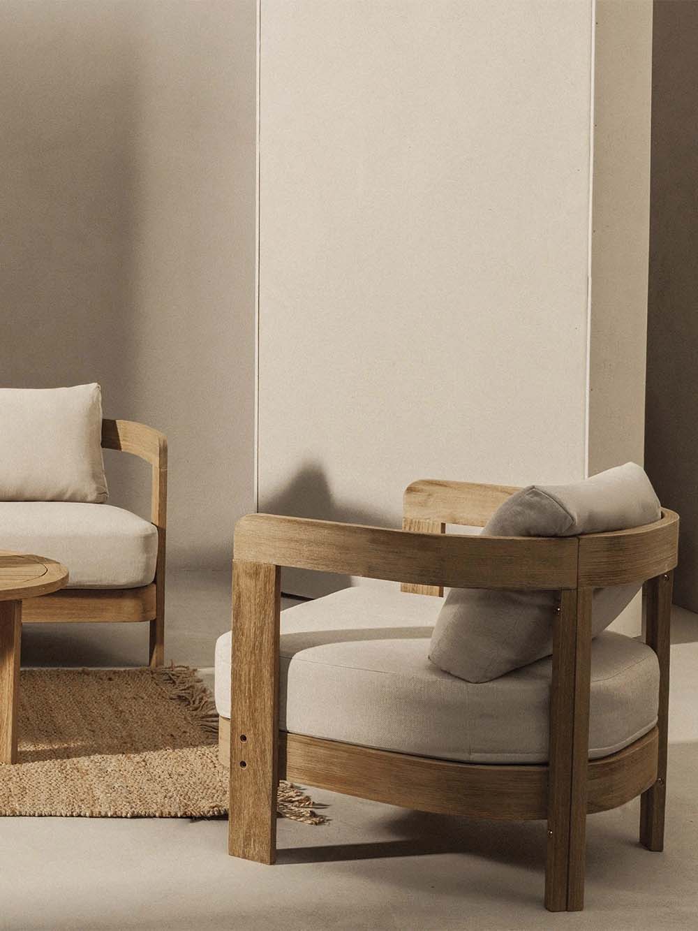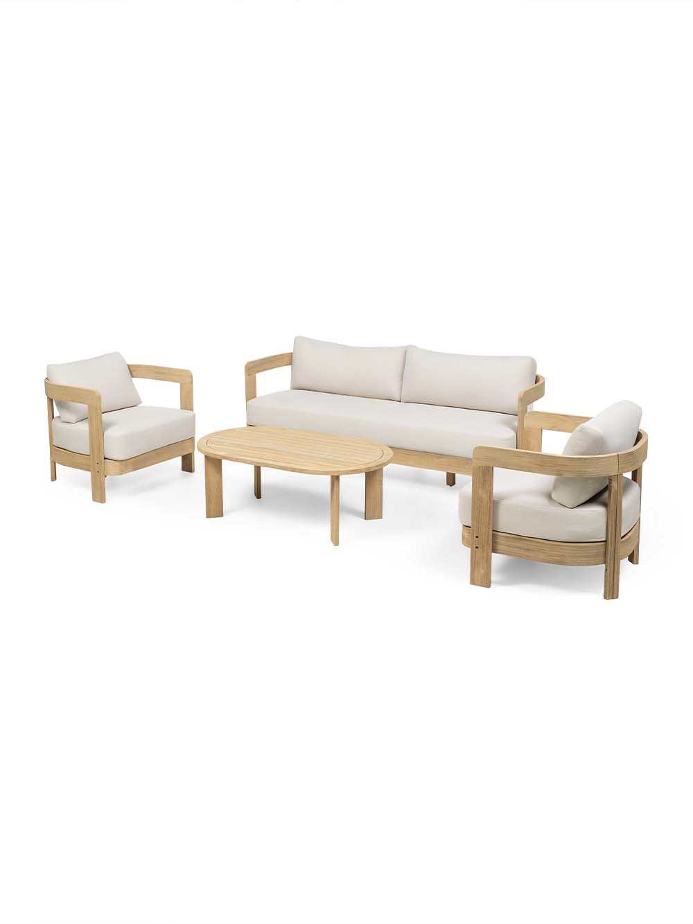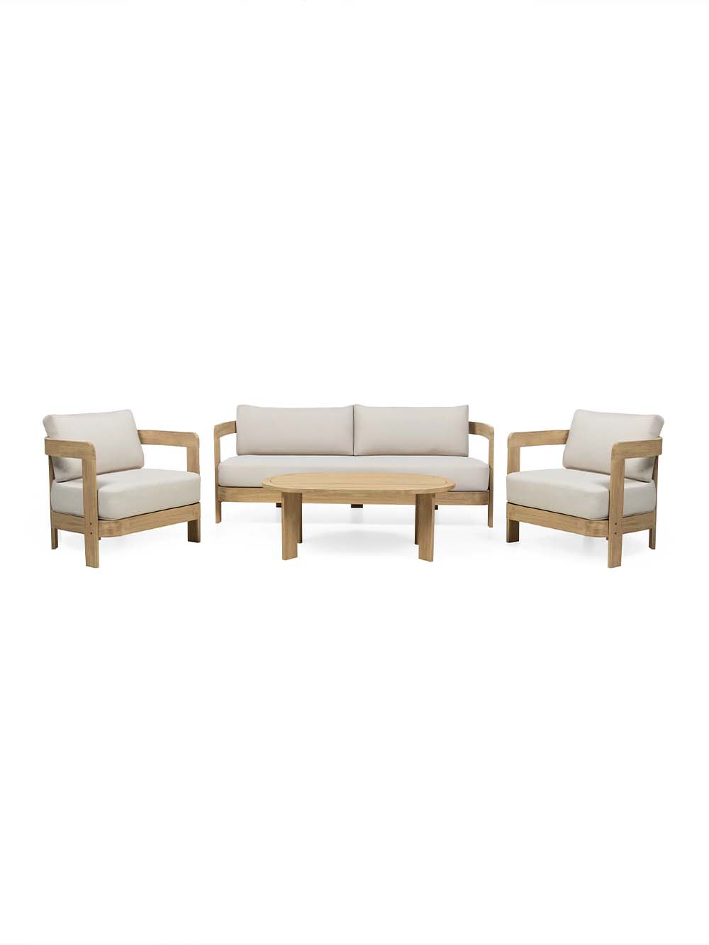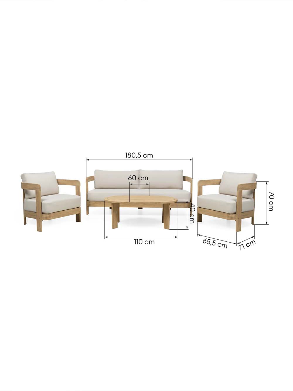 Poilsio baldų komplektas Furlo – minimalistinio dizaino lauko baldai su švelniomis formomis. Šviesaus audinio pagalvėlės kuria jaukią atmosferą, o akacijos medienos rėmas suteikia konstrukcijai tvirtumo ir pabrėžia natūralų baldo charakterį. Minkštos, storos pagalvėlės užtikrina komfortą, o nuimami užvalkalai leidžia lengvai prižiūrėti baldus. Puikus sprendimas terasai, sodui ar kiemui.