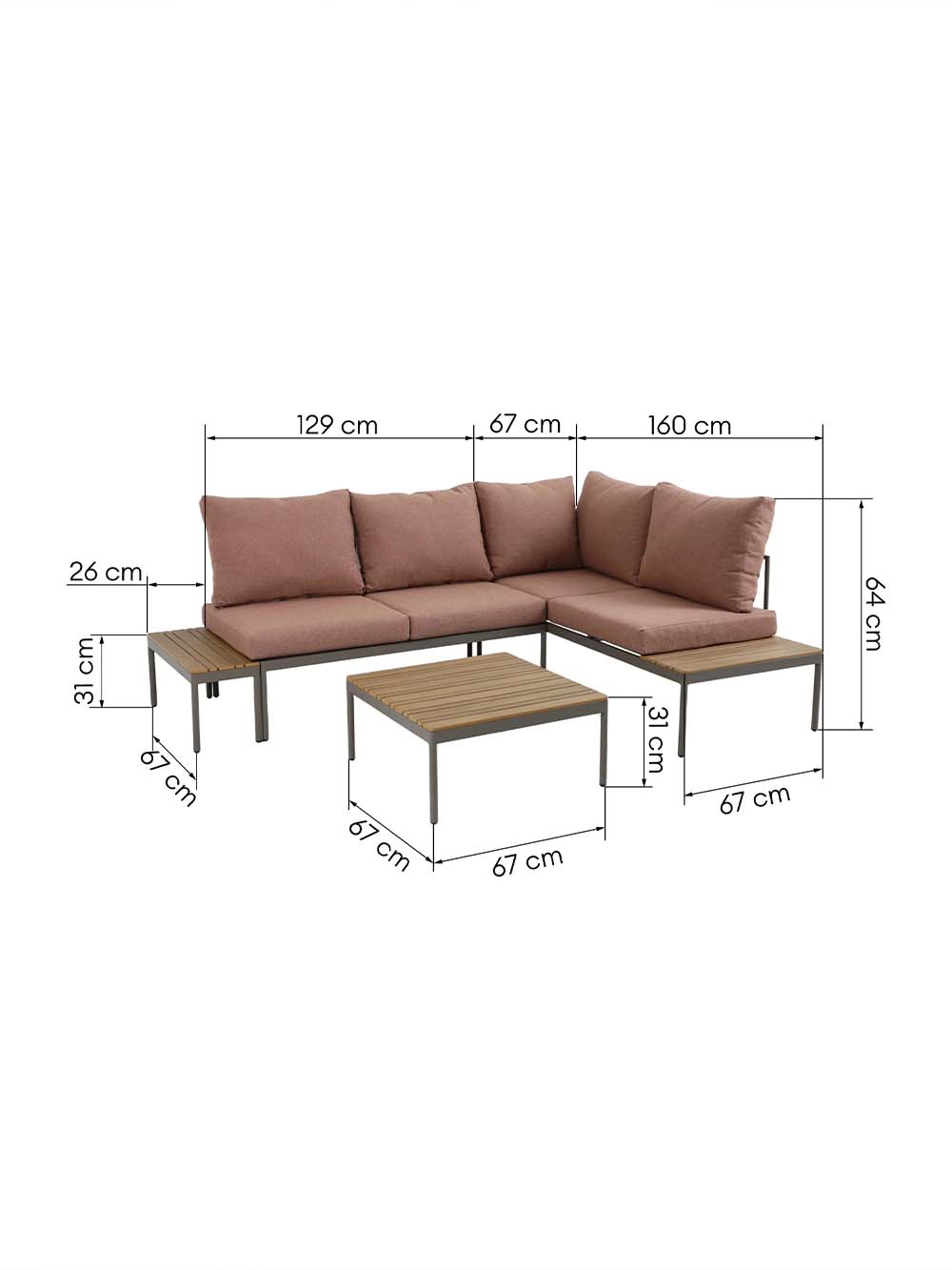Išoriniai pirmosios sofos dalies matmenys: plotis / gylis / aukštis, cm: 129 / 67 / 64.