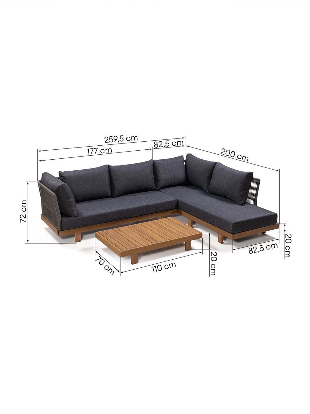Išoriniai pirmosios sofos dalies matmenys: plotis / gylis / aukštis, cm: 177 / 82,5 / 72.