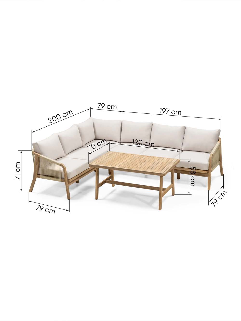 Išoriniai antros dalies sofos matmenys: plotis / gylis / aukštis, cm: 197 / 79 / 71.