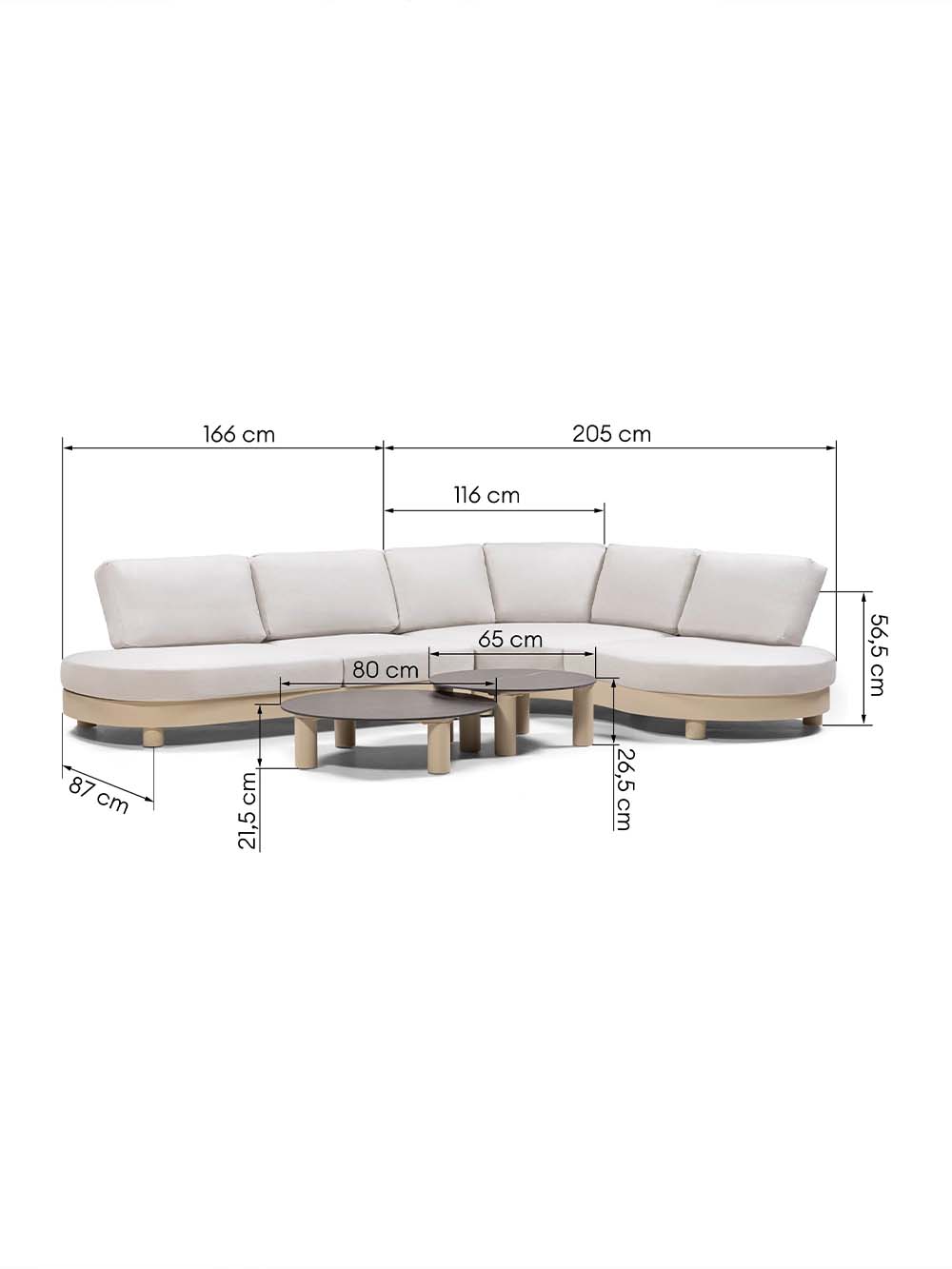 Išoriniai antros dalies sofos matmenys: plotis / gylis / aukštis, cm: 205 / 116 / 56,5.