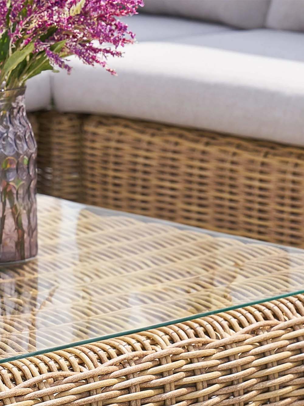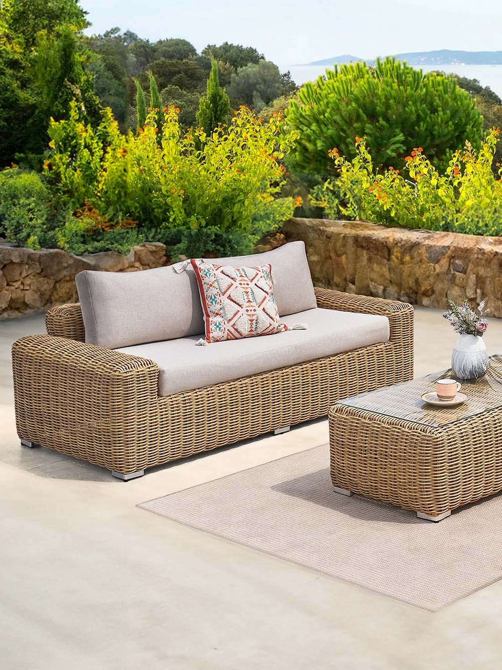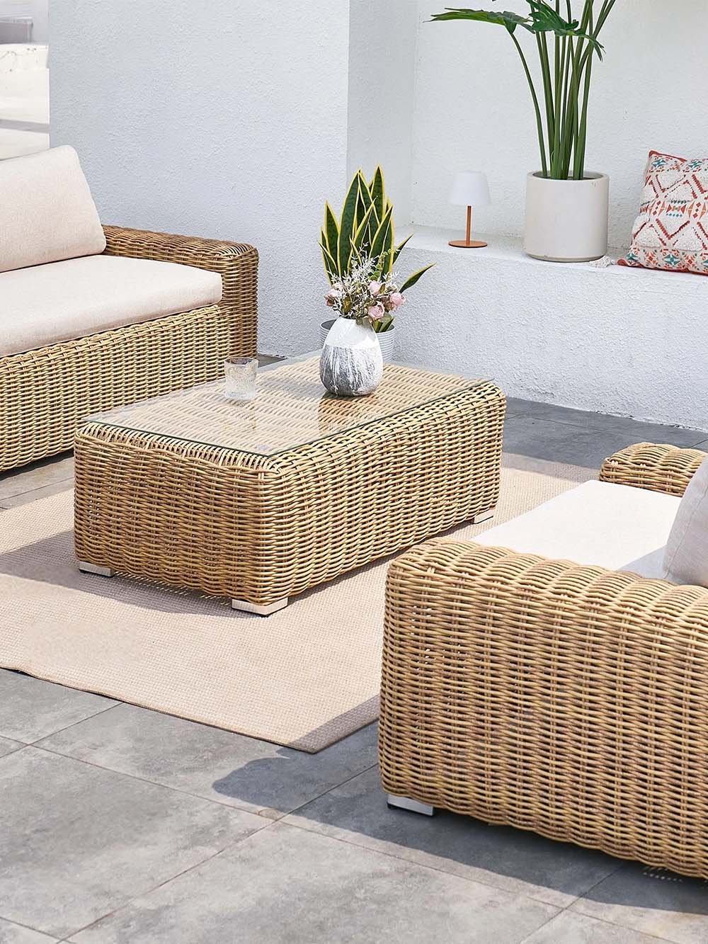 Sofos ir fotelio korpuso medžiaga: pintas, lauko sąlygoms atsparus dirbtinis ratanas.