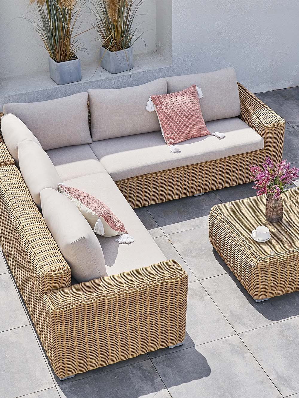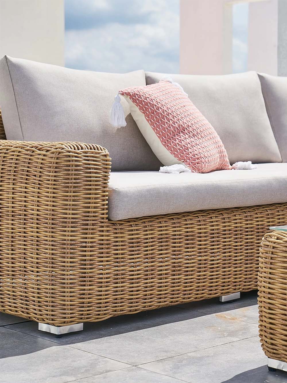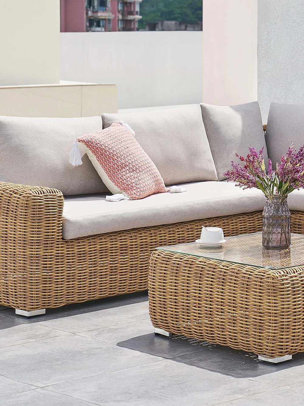 Sofos korpuso medžiaga: pintas, lauko sąlygoms atsparus dirbtinis ratanas.
