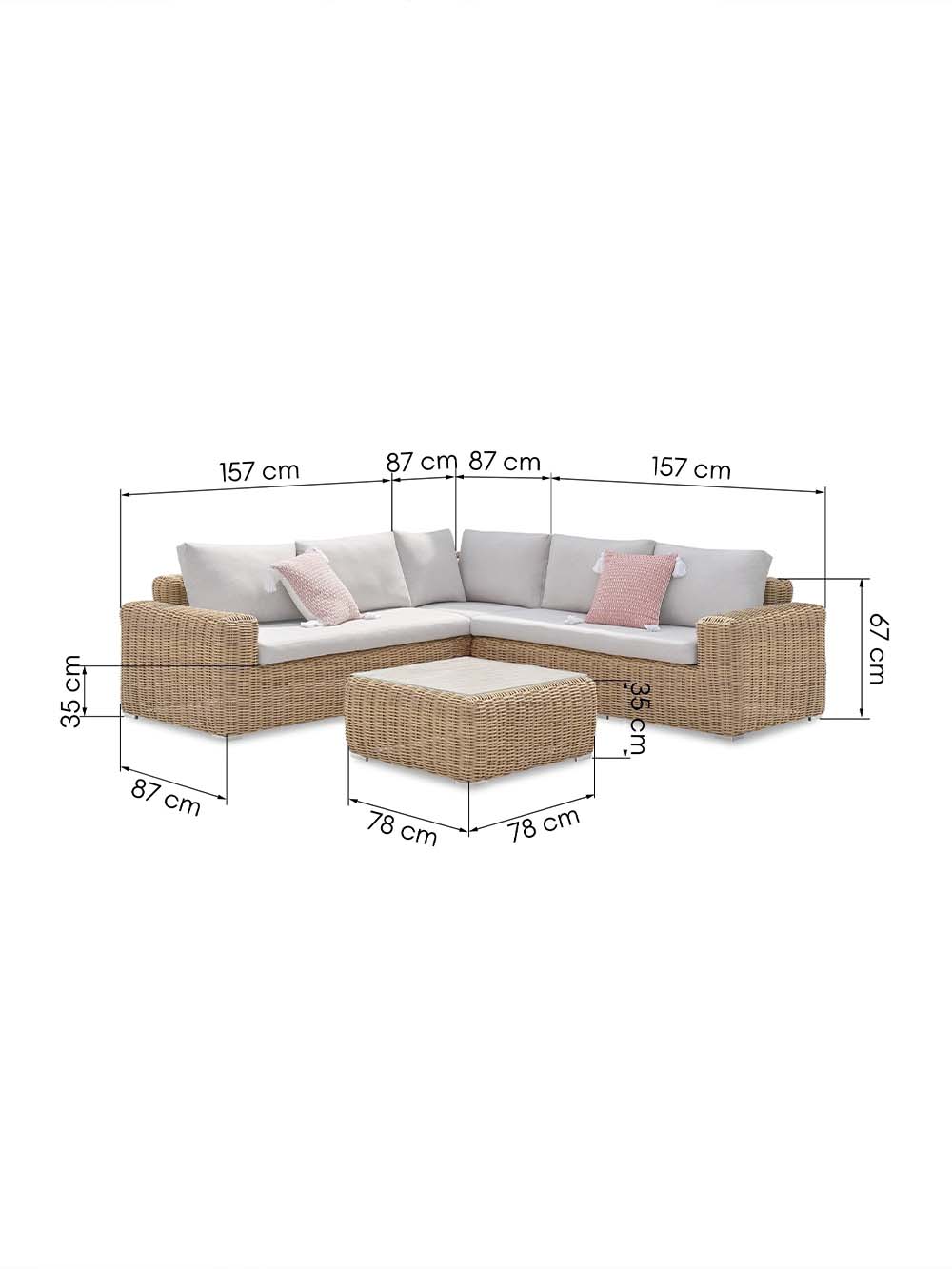 Išoriniai trečios (kampinės) dalies sofos matmenys: plotis / gylis / aukštis, cm: 87 / 87 / 67.