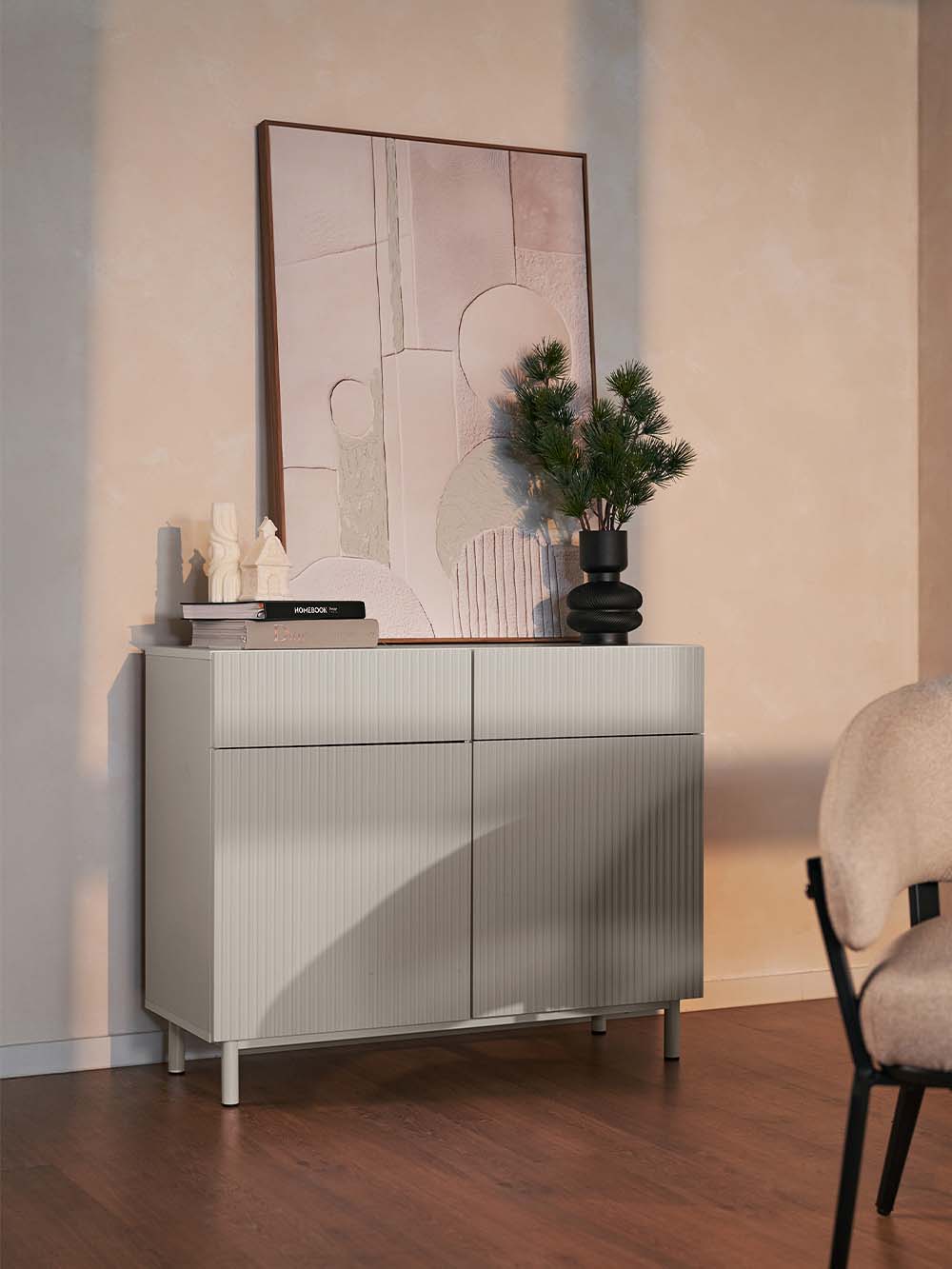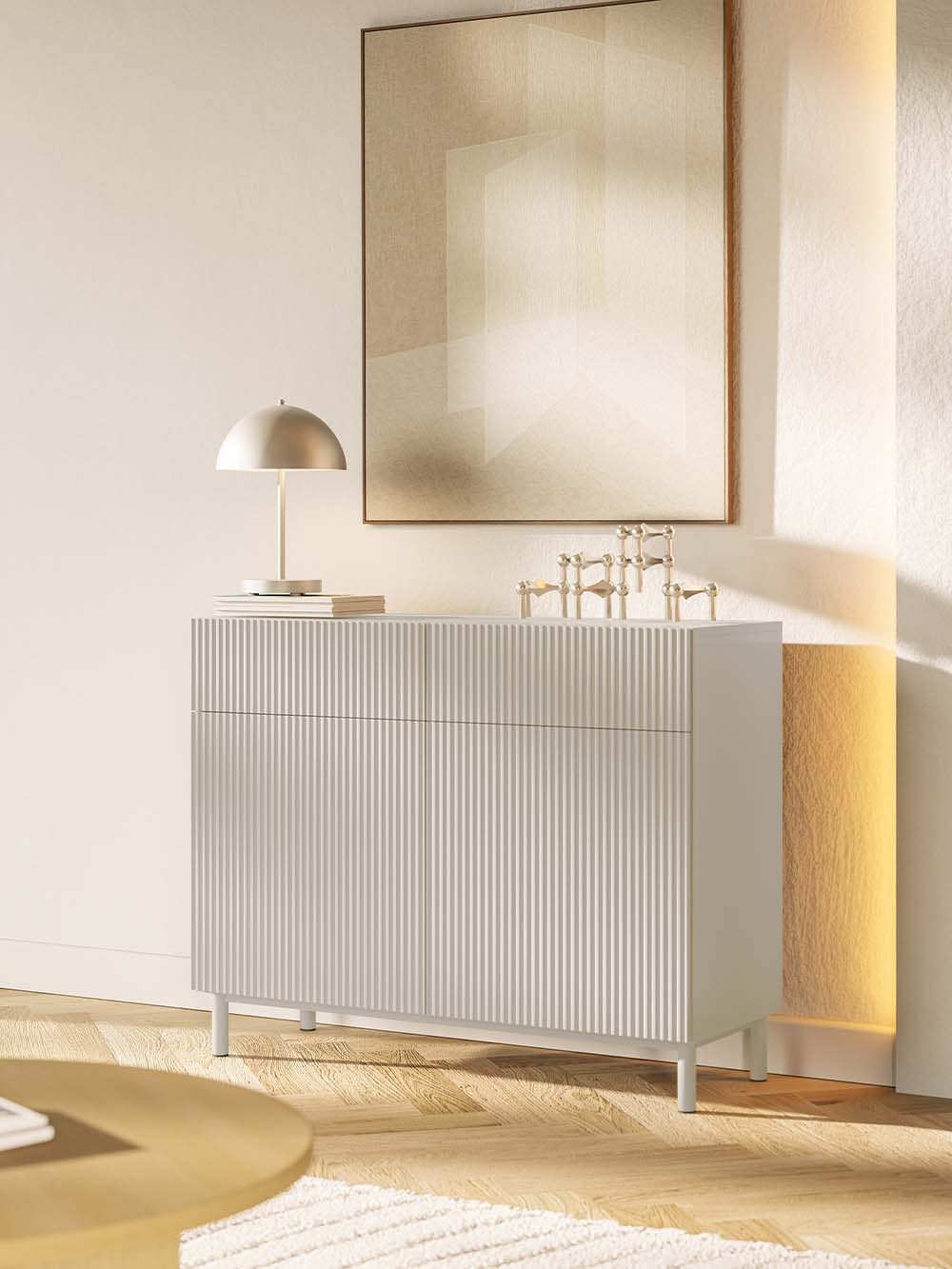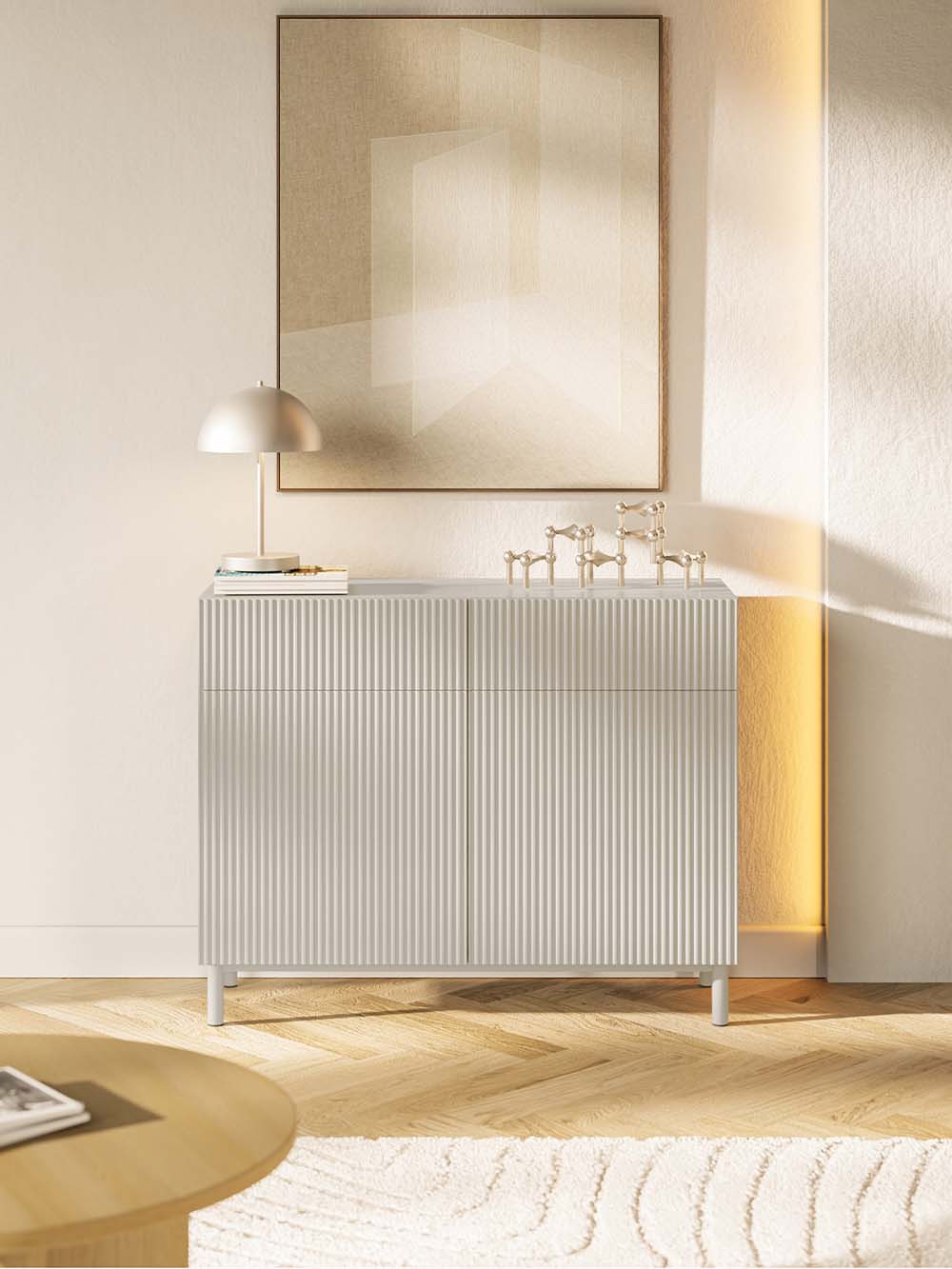 Stalčiaus priekio ir durelių medžiaga: frezuota ir laminuota korpuso spalvos MDF plokštė.
