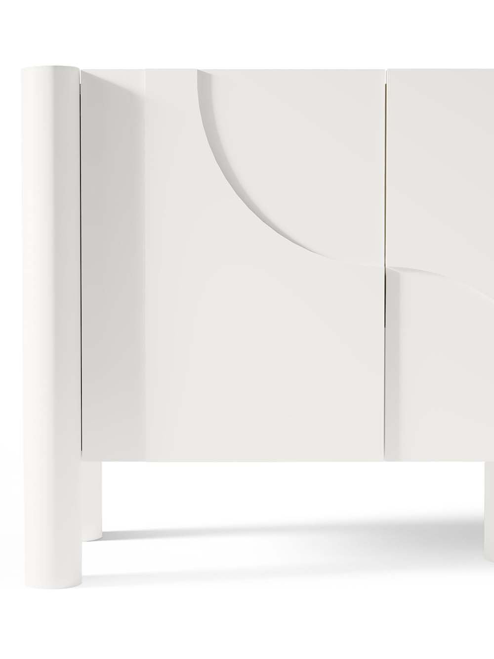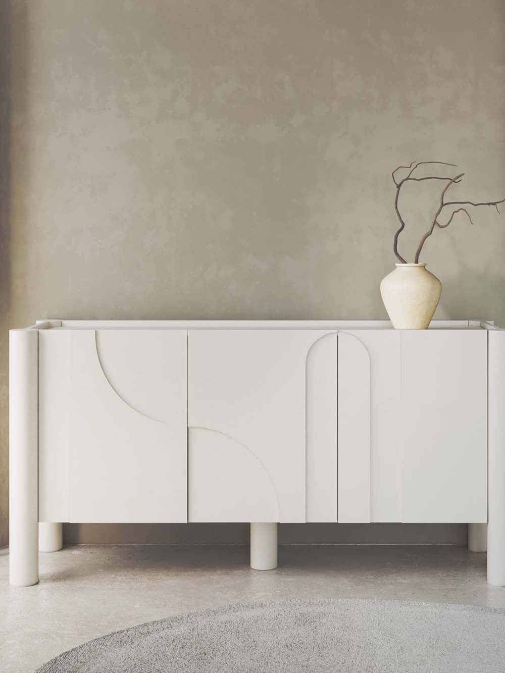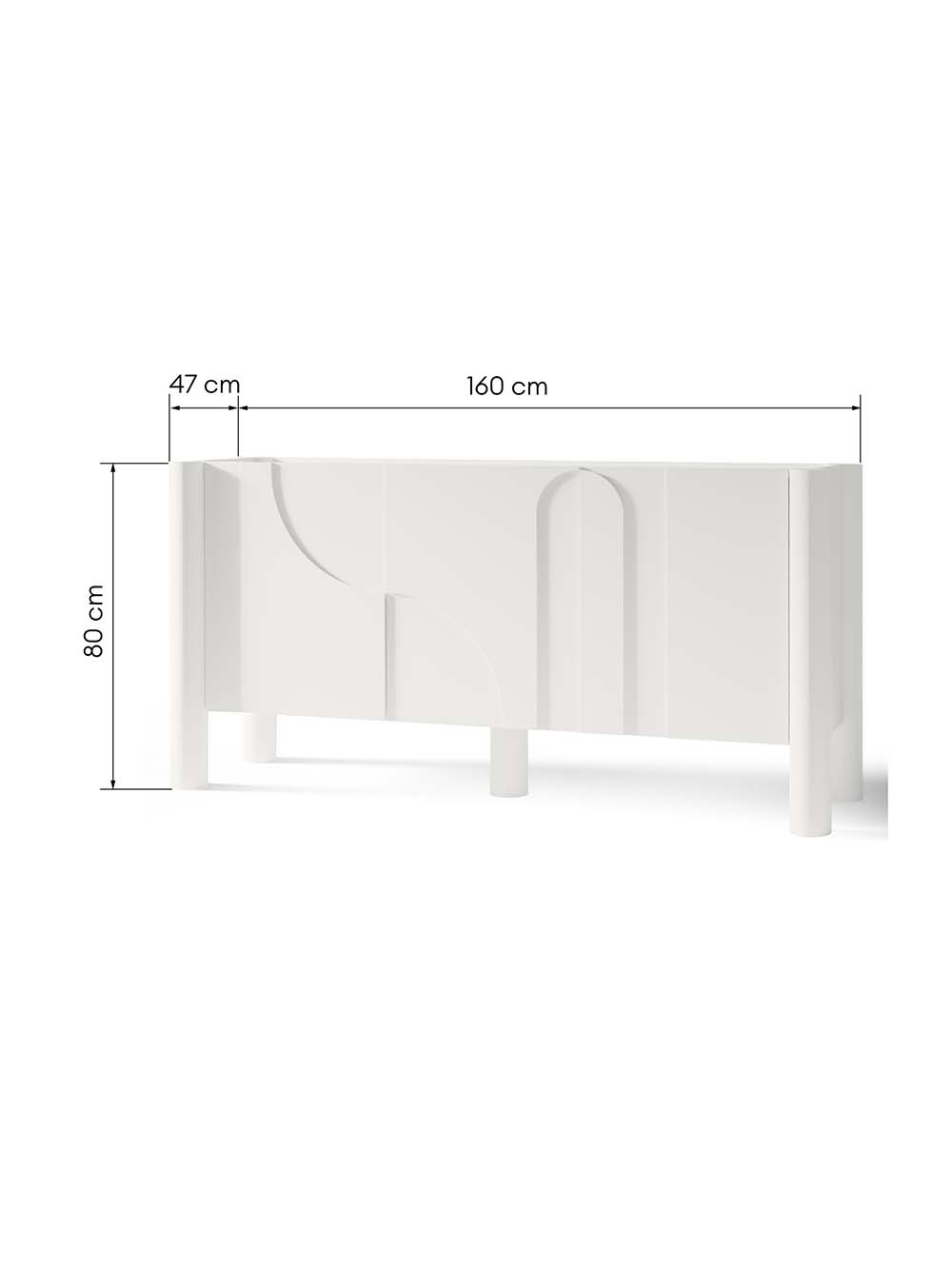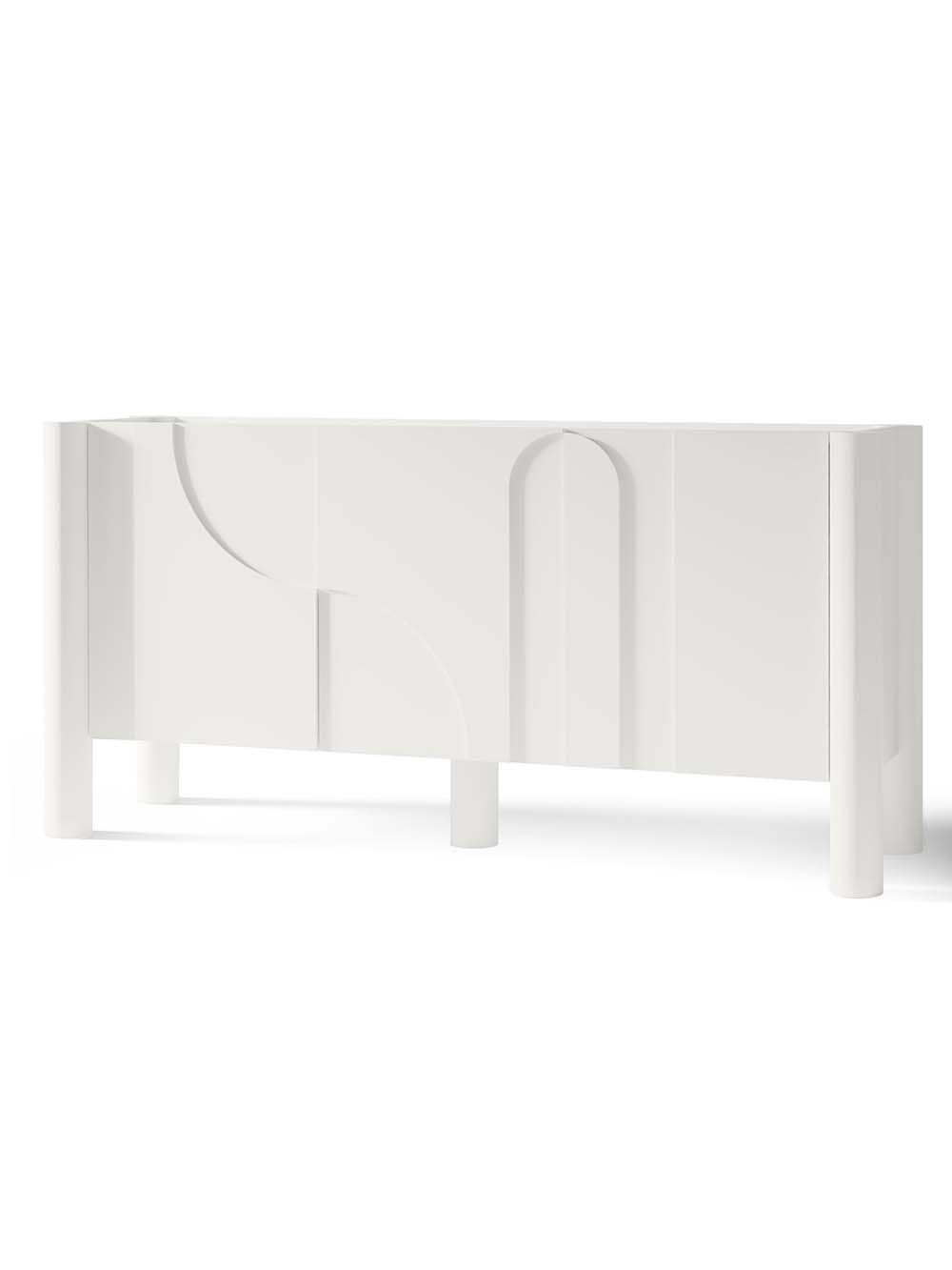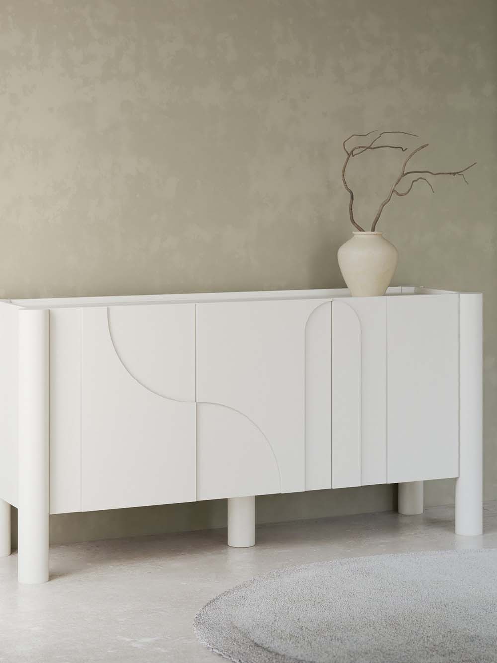 Komoda Elanté – tai minimalistinio dizaino baldas, išsiskiriantis subtiliomis detalėmis ir šiuolaikiška estetika. Balta matinė spalva ir dekoratyviniai, abstrakčių linijų frezavimai suteikia komodai skulptūrinio charakterio. Į korpusą įleistas stalviršis ir cilindro formos medinės kojos pabrėžia švarias proporcijas bei kuria lengvumo įspūdį. Šis modelis puikiai tiks moderniame ar skandinaviško stiliaus interjere – tiek svetainėje, tiek miegamajame.