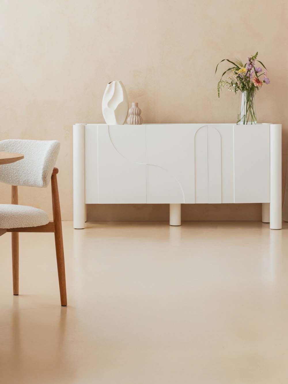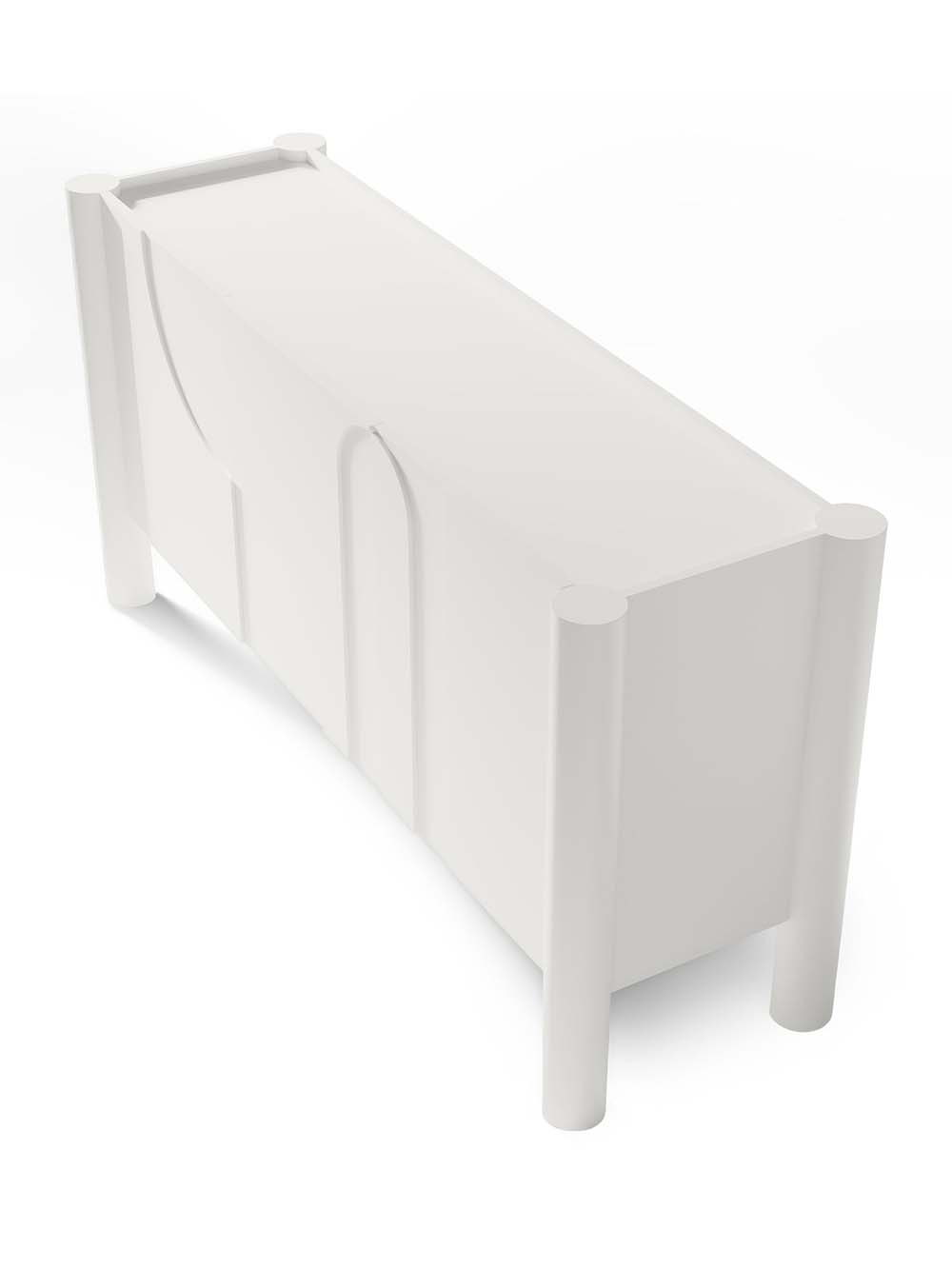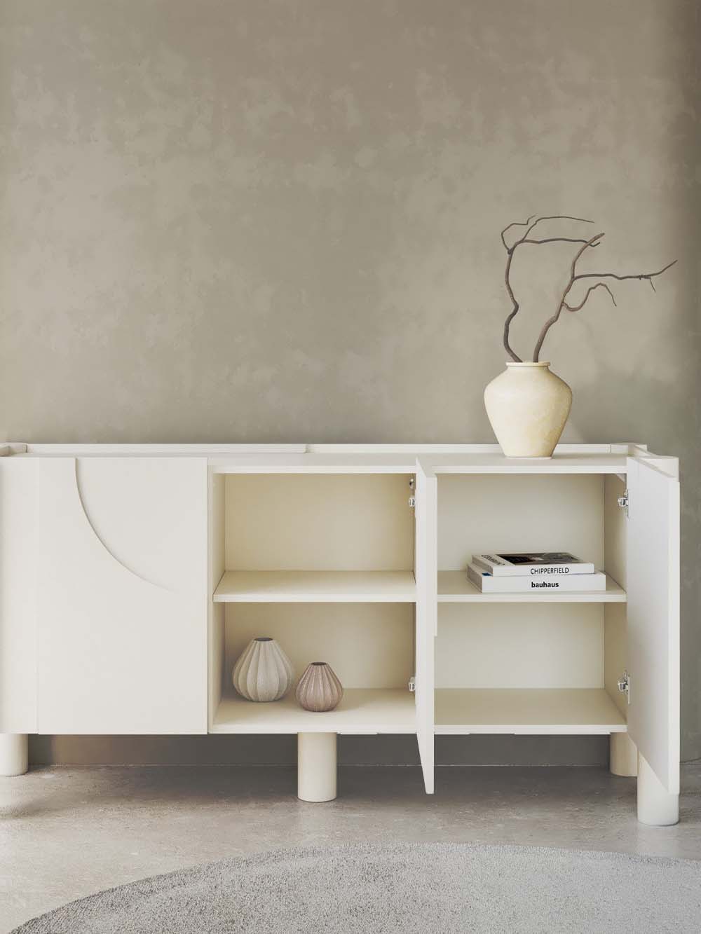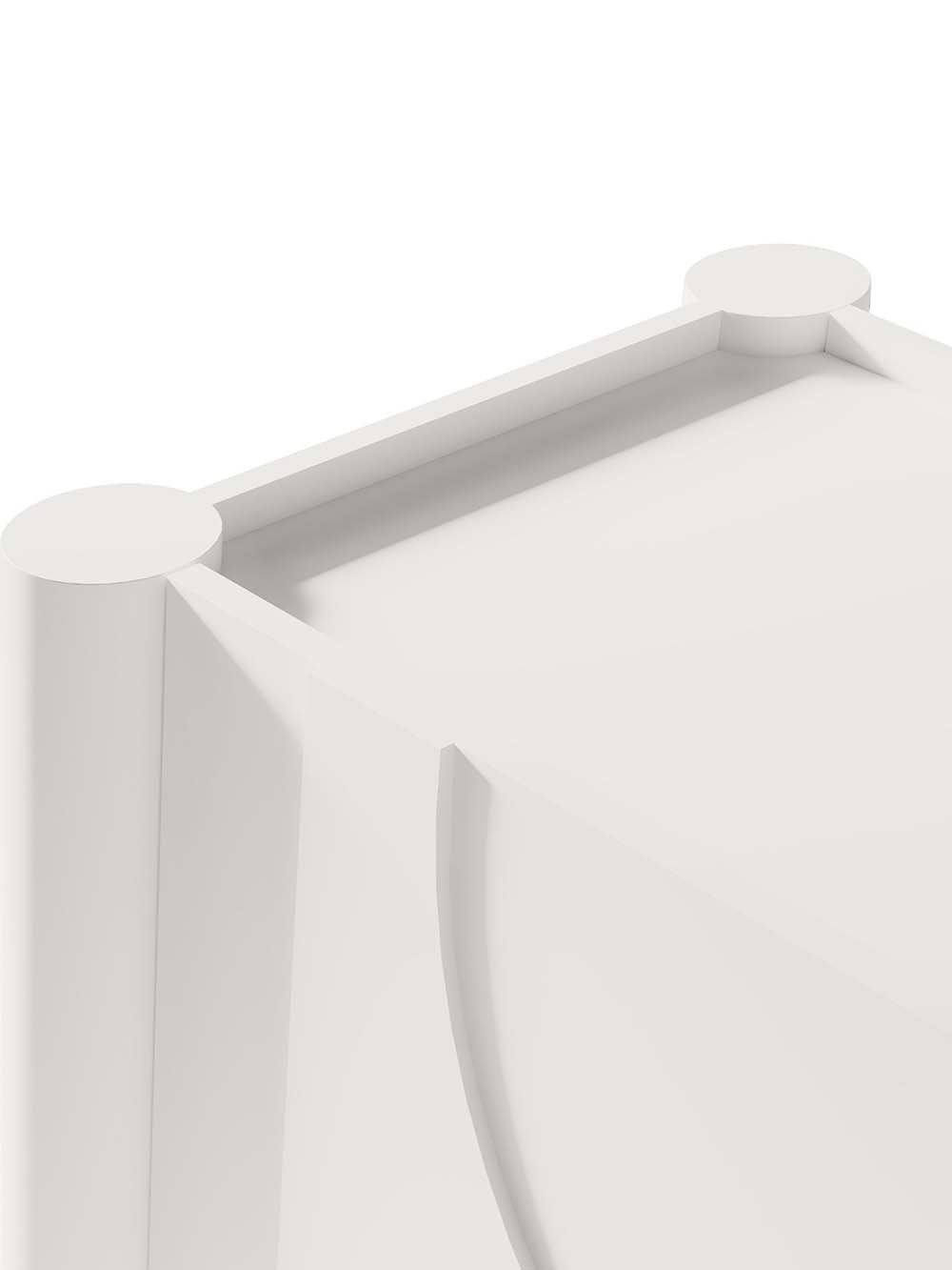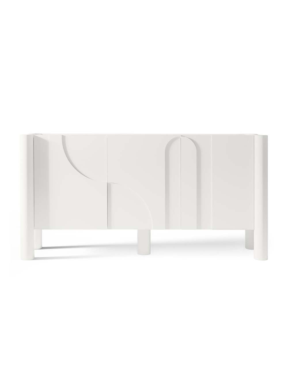 Komoda Elanté – tai minimalistinio dizaino baldas, išsiskiriantis subtiliomis detalėmis ir šiuolaikiška estetika. Balta matinė spalva ir dekoratyviniai, abstrakčių linijų frezavimai suteikia komodai skulptūrinio charakterio. Į korpusą įleistas stalviršis ir cilindro formos medinės kojos pabrėžia švarias proporcijas bei kuria lengvumo įspūdį. Šis modelis puikiai tiks moderniame ar skandinaviško stiliaus interjere – tiek svetainėje, tiek miegamajame.
