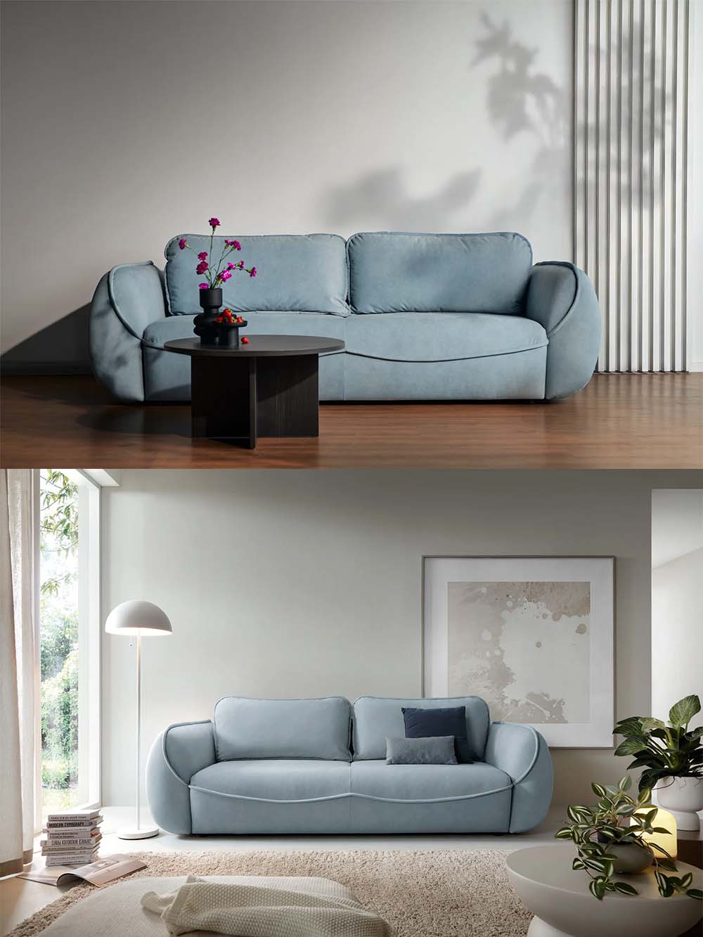 Sofa Bolla išsiskiria švelniomis, apvaliomis formomis, kurios primena minkštą debesį – ji puikiai dera tiek moderniuose, tiek skandinaviško stiliaus interjeruose. Priekinę dalį puošia subtilus bangos formos siūlas, suteikiantis baldui lengvumo ir išskirtinumo. Patogumą užtikrina sėdimoji ir atlošo dalys su elastinėmis banginėmis spyruoklėmis ir poliuretano putomis, kurios suteikia kūnui reikiamą atramą net ilgo poilsio metu.