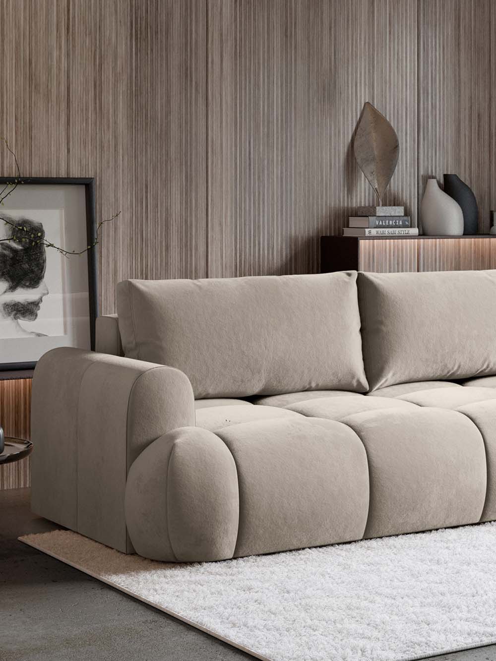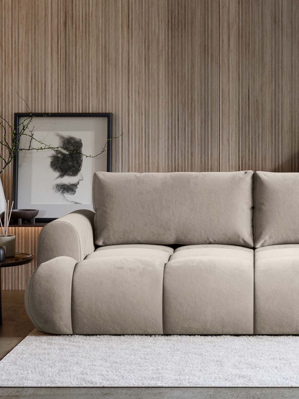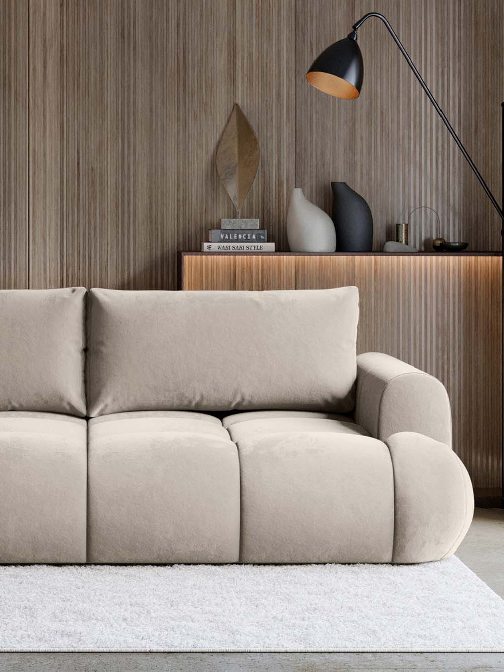 Audinio tipas: veliūras, atsparus trinčiai ir blukimui. Audinys pagamintas naudojant WATER BLOCKED technologiją, kuri riboja skysčių susigėrimą. Draugiškas vaikams, gyvūnams ir aplinkai.