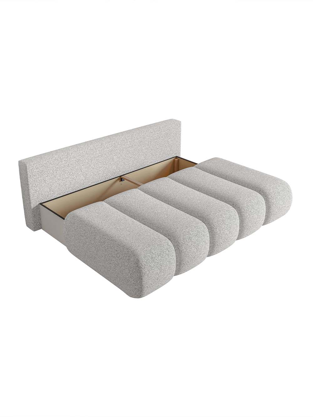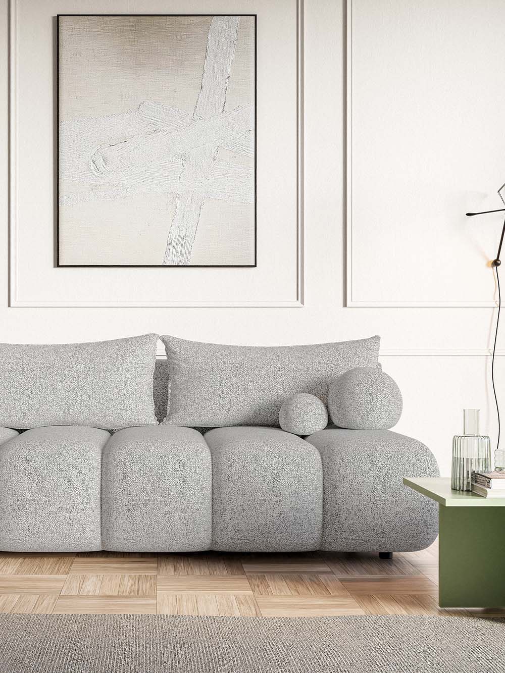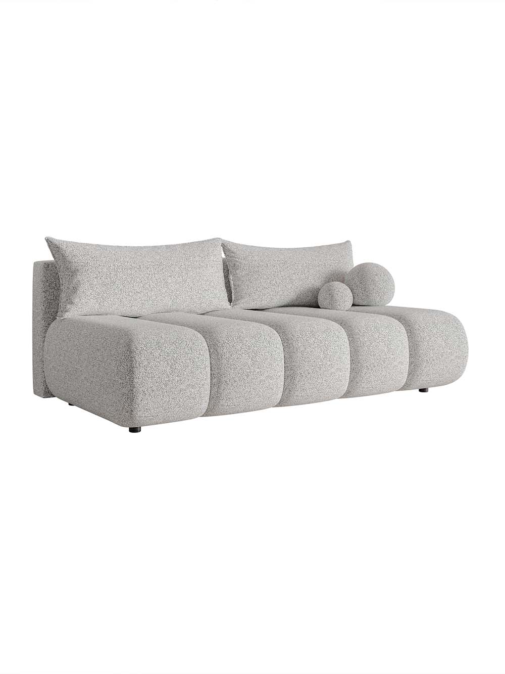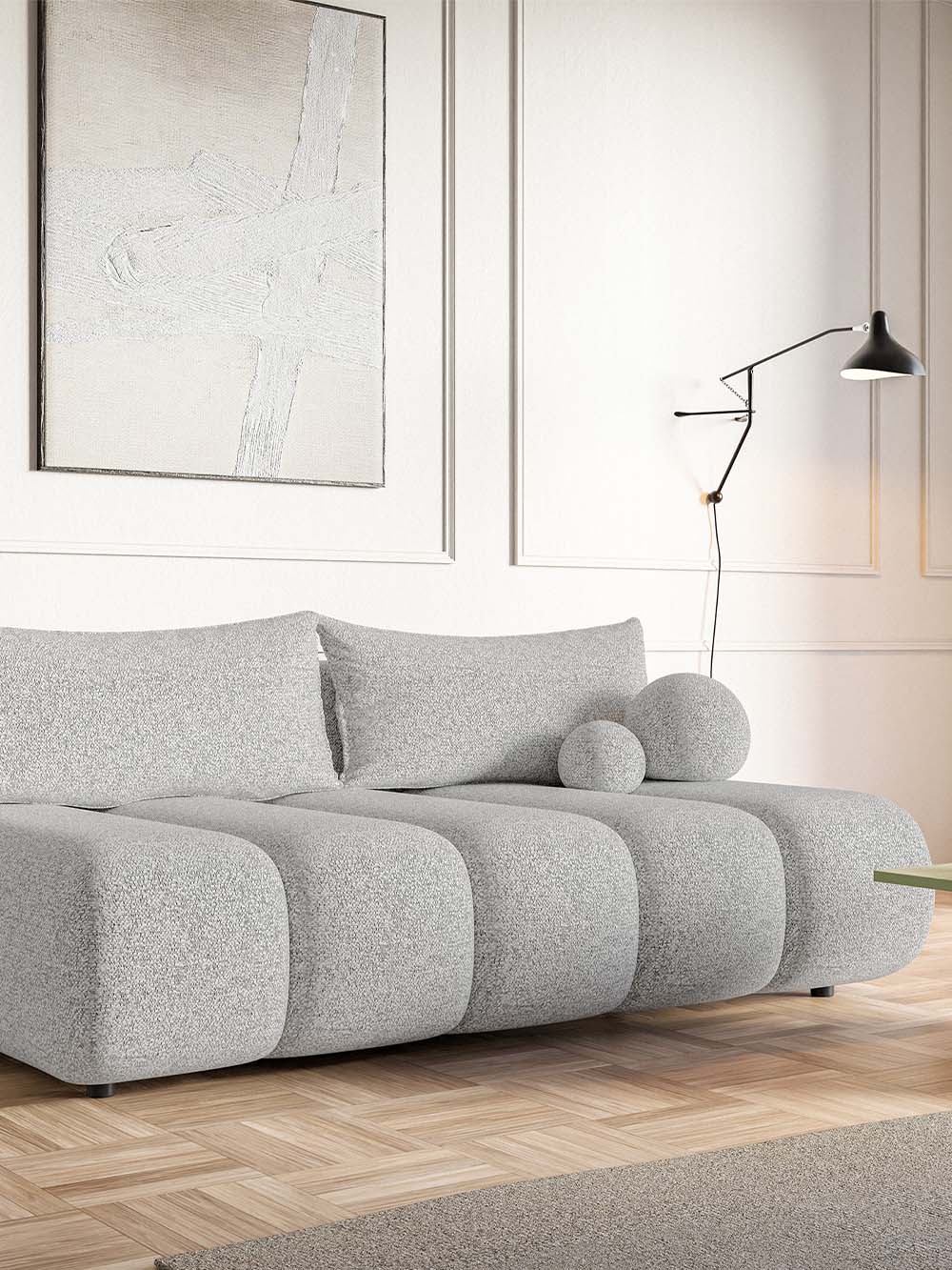 Trivietė sofa Prive – modernių formų, minkšto silueto baldas, lengvai įsiliejantis tiek erdvesniuose, tiek mažesniuose interjeruose. Lengvai grublėtos tekstūros audinys su subtiliu spalvų žaismu suteikia išraiškingumo, o dvi dekoratyvinės pagalvėlės tampa subtiliu akcentu. Minkšta sėdimoji dalis ir nuimamos atlošo pagalvės užtikrina patogų poilsį, o DL miegojimo funkcija bei patalynės dėžė suteikia praktiškumo ir leidžia sofą patogiai pritaikyti kasdieniams poreikiams.